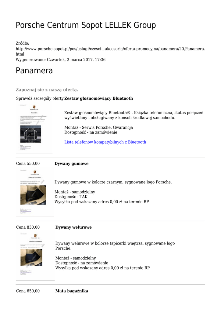 Porsche Centrum Sopot LELLEK Group Źródło: http://www.porsche-sopot.pl/pos/uslugi/czesci-i-akcesoria/oferta-promocyjna/panamera/20,Panamera. html Wygenerowano: Czwartek, 2 marca 2017, 17:36 Panamera Zapoznaj się z naszą ofertą. Sprawdż szczegóły oferty Zestaw głośnomówiący Bluetooth Zestaw głośnomówiący Bluetooth® . Książka telefoniczna, status połączeń wyświetlany i obsługiwany z konsoli środkowej samochodu. Montaż - Serwis Porsche, Gwarancja Dostępność - na zamówienie Lista telefonów kompatybilnych z Bluetooth Cena 550,00 Dywany gumowe Dywany gumowe w kolorze czarnym, sygnowane logo Porsche. Montaż - samodzielny Dostępność - TAK Wysyłka pod wskazany adres 0,00 zł na terenie RP Cena 830,00 Dywany welurowe Dywany welurowe w kolorze tapicerki wnętrza, sygnowane logo Porsche. Montaż - samodzielny Dostępność - na zamówienie Wysyłka pod wskazany adres 0,00 zł na terenie RP Cena 650,00 Mata bagażnika Mata bagażnika dwustronna, zabezpiecza przez zabrudzeniami tapicerki Awers welurowy w kolorze wnętrza, rewers gumowy w kolorze czarnym. Montaż - samodzielny Dostępność - na zamówienie Wysyłka pod wskazany adres 0,00 zł na terenie RP Cena 1900,00 Belki transportowe Zamykane kluczykiem, sygnowane logo Porsche, max. obciążenie 75kg.. Montaż - samodzielny Dostępność - TAK Wysyłka pod wskazany adres 0,00 zł na terenie RP Załączniki do strony Zestaw głośnomówiący Bluetooth 90.91 KB Lista telefonów kompatybilnych z Bluetooth 417.29 KB Belki transportowe 62.22 KB Dywany gumowe 67.48 KB Dywany welurowe 66.78 KB Mata bagażnika 89.94 KB Tweetnij