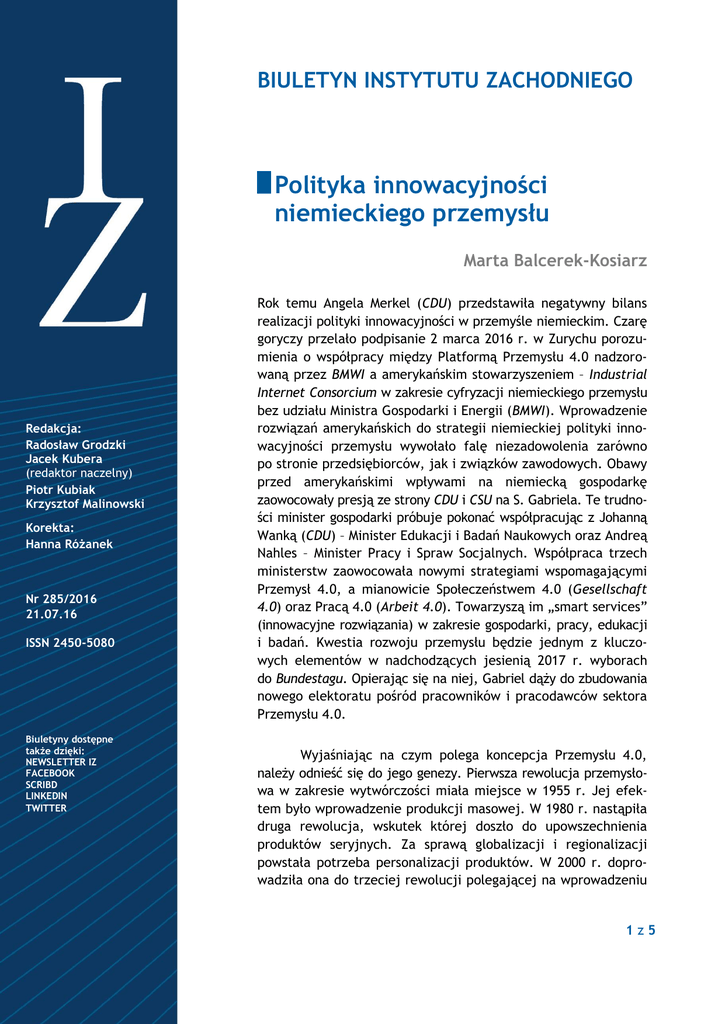 BIULETYN INSTYTUTU ZACHODNIEGO Polityka innowacyjności niemieckiego przemysłu Marta Balcerek-Kosiarz Redakcja: Radosław Grodzki Jacek Kubera (redaktor naczelny) Piotr Kubiak Krzysztof Malinowski Korekta: Hanna Różanek Nr 285/2016 21.07.16 ISSN 2450-5080 Biuletyny dostępne także dzięki: NEWSLETTER IZ FACEBOOK SCRIBD LINKEDIN TWITTER Rok temu Angela Merkel (CDU) przedstawiła negatywny bilans realizacji polityki innowacyjności w przemyśle niemieckim. Czarę goryczy przelało podpisanie 2 marca 2016 r. w Zurychu porozumienia o współpracy między Platformą Przemysłu 4.0 nadzorowaną przez BMWI a amerykańskim stowarzyszeniem – Industrial Internet Consorcium w zakresie cyfryzacji niemieckiego przemysłu bez udziału Ministra Gospodarki i Energii (BMWI). Wprowadzenie rozwiązań amerykańskich do strategii niemieckiej polityki innowacyjności przemysłu wywołało falę niezadowolenia zarówno po stronie przedsiębiorców, jak i związków zawodowych. Obawy przed amerykańskimi wpływami na niemiecką gospodarkę zaowocowały presją ze strony CDU i CSU na S. Gabriela. Te trudności minister gospodarki próbuje pokonać współpracując z Johanną Wanką (CDU) – Minister Edukacji i Badań Naukowych oraz Andreą Nahles – Minister Pracy i Spraw Socjalnych. Współpraca trzech ministerstw zaowocowała nowymi strategiami wspomagającymi Przemysł 4.0, a mianowicie Społeczeństwem 4.0 (Gesellschaft 4.0) oraz Pracą 4.0 (Arbeit 4.0). Towarzyszą im „smart services” (innowacyjne rozwiązania) w zakresie gospodarki, pracy, edukacji i badań. Kwestia rozwoju przemysłu będzie jednym z kluczowych elementów w nadchodzących jesienią 2017 r. wyborach do Bundestagu. Opierając się na niej, Gabriel dąży do zbudowania nowego elektoratu pośród pracowników i pracodawców sektora Przemysłu 4.0. Wyjaśniając na czym polega koncepcja Przemysłu 4.0, należy odnieść się do jego genezy. Pierwsza rewolucja przemysłowa w zakresie wytwórczości miała miejsce w 1955 r. Jej efektem było wprowadzenie produkcji masowej. W 1980 r. nastąpiła druga rewolucja, wskutek której doszło do upowszechnienia produktów seryjnych. Za sprawą globalizacji i regionalizacji powstała potrzeba personalizacji produktów. W 2000 r. doprowadziła ona do trzeciej rewolucji polegającej na wprowadzeniu 1z5 krótkich serii sprzedawanych w cenach towarów ogólnodostępnych. Zmianom tym towarzyszył rozwój robotyki. W 2011 r. zainicjowano w Niemczech czwartą rewolucję opartą na strategii Przemysłu 4.0. Jej celem jest zrównanie kosztów zindywidualizowanych i masowych produktów. Koncepcja Przemysłu 4.0 wywodzi się od Web 2.0, czyli serwisów internetowych, w których treść generowana jest przez użytkowników. Po raz pierwszy pojawiła się w 2011 r. na targach w Hanowerze w grupie roboczej pod przewodnictwem Siegfrieda Daisa (Robert Bosch GmbH) oraz Henninga Kagermanna (Niemiecka Akademia Nauk i Inżynierii). Zanim powstała koncepcja Przemysłu 4.0, w przemyśle niemieckim występowało podejście łańcuchowe do procesu produkcji, które miało miejsce w fabrykach: wybór technologii, wytworzenie produktu oraz jego zamówienie. Etapy planowania produkcji odbywały się w warsztacie, projektowni czy też montażowni. Przemysł 4.0 przeniósł je z przestrzeni zakładu produkcyjnego do przestrzeni wirtualnej. Podstawą Przemysłu 4.0 jest rozwój gospodarczy oparty na trzech procesach: cyfryzacji, automatyzacji oraz informatyzacji. Wraz z procesem cyfryzacji wszystkie etapy planowania produkcji odbywają się w Internecie. Oznacza to odejście od wykonywania produktu w hali produkcyjnej na rzecz tworzenia wirtualnych realiów produkcji w Internecie zbliżonych do warunków rzeczywistych. Automatyzacja z kolei polega na symulacji funkcjonowania nowej koncepcji produktu lub usługi, która po spełnieniu oczekiwań klienta zostanie przekazana do realizacji. Skutkiem zmian w procesie produkcji jest odejście od serii próbnych. Podstawą nowego procesu wytwórczego jest także informatyzacja, czyli przygotowanie specjalnego oprogramowania, za pomocą którego klient będzie na bieżąco wprowadzał zmiany w wirtualnym produkcie. Dostęp zleceniodawców do internetowych baz testowych umożliwi monitorowanie pomysłów oraz ich dostosowanie do potrzeb klientów. Przemysł 4.0 najszybciej znalazł zastosowanie w robotyce (firma KUKA) oraz elektronice (firma Siemens). W celu urzeczywistnienia koncepcji Przemysłu 4.0 BMWI (Federalne Ministerstwo Gospodarki i Energii) oraz BMBF (Ministerstwo Edukacji i Badań Naukowych) współdziałają w ramach Społeczeństwa 4.0. Strategia ta polega na ochronie przed cyberprzestępstwami baz danych, w których gromadzone są informacje o symulacjach funkcjonowania produktów. W tym celu J. Wanka (CDU) przekazała w 2016 r. z budżetu Ministerstwa Nauki Instytutowi Fraunhofera 6 mln euro na sfinansowanie projektów ochrony danych. Społeczeństwo 4.0 wymusza również zmiany w sektorze szkolnictwa wyższego. BMBF dąży w tym względzie do zapewnienie stałego dopływu kadr do sektorów przemysłu przez ograniczenie osób ze stopniami naukowymi na rzecz zwiększenia liczby inżynierów. BMBF z BMWI stoi także przed zadaniem wypracowania kierunków rozwoju szkolnictwa zawodowego dostosowanych do wymagań wirtualnego procesu produkcji. Zwrot musi dokonać się na kierunkach technicznych. Potrzeba nowych kadr dla Przemysłu 4.0 pozostaje w sprzeczności z modelem kształcenia, który nadal jest oparty na przestrzennym układzie zakładów produkcyjnych z lat sześćdziesiątych ubiegłego wieku. Polega on na wytwarzaniu produktów i ich koncepcji w projektowniach, warsztatach czy montażowniach. BMWI zamierza powołać specjalne ośrodki naukowe, 2z5 wokół których będą funkcjonować naukowcy zajmujący się rozwiązaniami dla Przemysłu 4.0. S. Gabriel ma w tym względzie bardziej dalekosiężne plany. Proponuje współpracę z państwami, które wdrożą n