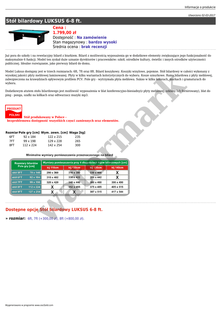 Informacje o produkcie Utworzono 02-03-2017 Stół bilardowy LUKSUS 6-8 ft. Cena : 1.799,00 zł Dostępność : Na zamówienie Stan magazynowy : bardzo wysoki Średnia ocena : brak recenzji Już pora do szkoły i na rewelacyjny bilard z biurkiem. Bilard z możliwością wyposażenia go w dodatkowe elementy zwiększające jego funkcjonalność do maksymalnie 6 funkcji. Model ten zyskał duże uznanie dyrektorów i pracowników: szkół, ośrodków kultury, świetlic i innych ośrodków użyteczności publicznej. Idealne rozwiązanie, jako pierwszy bilard do domu. er m ar k Model Luksus dostępny jest w trzech rozmiarach: 6ft, 7ft oraz 8ft. Bilard koszykowy. Koszyki winylowe, pojemne. Stół bilardowy w całości wykonany z wysokiej jakości płyty meblowej laminowanej. Płyty w kilku wariantach kolorystycznych do wyboru. Kosze sznurkowe. Rama bilardowa z płyty meblowej, zabezpieczona na krawędziach opływowym profilem PCV. Pole gry - wytrzymała płyta meblowa. Sukno w kilku kolorach, markach i gramaturach do wyboru. Dodatkowym atutem stołu bilardowego jest możliwość wyposażenia w blat konferencyjno-biesiadny(z płyty meblowej, szklany lub fornirowany), blat do ping - ponga, szafki na kółkach oraz odtwarzacz muzyki mp3. Stół produkowany w Polsce bezproblemowa dostępność wszystkich częsci zamiennych oraz elementów. w at Rozmiar Pole gry [cm] Wym. zewn. [cm] Waga [kg] 6FT 92 x 184 122 x 215 235 7FT 99 x 198 129 x 228 265 8FT 112 x 224 142 x 254 300 Dostępne opcje Stół bilardowy LUKSUS 6-8 ft. » rozmiar: 6ft, 7ft (+300,00 zł), 8ft (+800,00 zł). Wygenerowano w programie www.oscGold.com