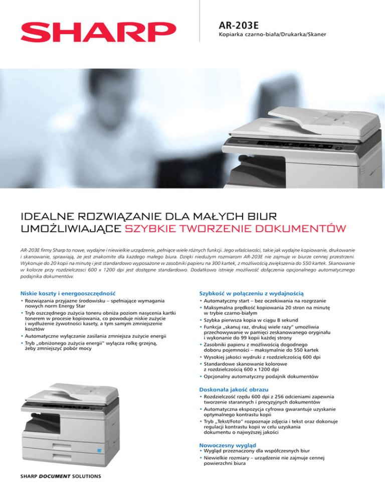 AR-203E Kopiarka czarno-biała/Drukarka/Skaner IDEALNE ROZWIĄZANIE DLA MAŁYCH BIUR UMOŻLIWIAJĄCE SZYBKIE TWORZENIE DOKUMENTÓW AR-203E firmy Sharp to nowe, wydajne i niewielkie urządzenie, pełniące wiele różnych funkcji. Jego właściwości, takie jak wydajne kopiowanie, drukowanie i skanowanie, sprawiają, że jest znakomite dla każdego małego biura. Dzięki niedużym rozmiarom AR-203E nie zajmuje w biurze cennej przestrzeni. Wykonuje do 20 kopii na minutę i jest standardowo wyposażone w zasobniki papieru na 300 kartek, z możliwością zwiększenia do 550 kartek. Skanowanie w kolorze przy rozdzielczosci 600 x 1200 dpi jest dostępne standardowo. Dodatkowo istnieje możliwość dołączenia opcjonalnego automatycznego podajnika dokumentów. Niskie koszty i energooszczędność Szybkość w połączeniu z wydajnością • Rozwiązania przyjazne środowisku – spełniające wymagania nowych norm Energy Star • Tryb oszczędnego zużycia toneru obniża poziom nasycenia kartki tonerem w procesie kopiowania, co powoduje niskie zużycie i wydłużenie żywotności kasety, a tym samym zmniejszenie kosztów • Automatyczne wyłączanie zasilania zmniejsza zużycie energii • Tryb „obniżonego zużycia energii” wyłącza rolkę grzejną, żeby zmniejszyć pobór mocy • Automatyczny start – bez oczekiwania na rozgrzanie • Maksymalna prędkość kopiowania 20 stron na minutę w trybie czarno-białym • Szybka pierwsza kopia w ciągu 8 sekund • Funkcja „skanuj raz, drukuj wiele razy” umożliwia przechowywanie w pamięci zeskanowanego oryginału i wykonanie do 99 kopii każdej strony • Zasobniki papieru z możliwością dogodnego doboru pojemności – maksymalnie do 550 kartek • Wysokiej jakości wydruki z rozdzielczością 600 dpi • Standardowe skanowanie kolorowe z rozdzielczością 600 x 1200 dpi • Opcjonalny automatyczny podajnik dokumentów Doskonała jakość obrazu • Rozdzielczość rzędu 600 dpi z 256 odcieniami zapewnia tworzenie starannych i precyzyjnych dokumentów • Automatyczna ekspozycja cyfrowa gwarantuje uzyskanie optymalnego kontrastu kopii • Tryb „Tekst/Foto” rozpoznaje zdjęcia i tekst oraz dokonuje regulacji kontrastu kopii w celu uzyskania dokumentu o najwyższej jakości Nowoczesny wygląd • Wygląd przeznaczony dla współczesnych biur • Niewielkie rozmiary – urządzenie nie zajmuje cennej powierzchni biura SHARP DOCUMENT SOLUTIONS AR-203E DANE TECHNICZNE Kopiarka czarno-biała/Drukarka/Skaner Ogólne Rodzaj Technologia Format papieru Gramatura papieru Pojemność papieru Czas nagrzewania*1 Pamięć Źródło zasilania Pobór mocy Wymiary (szer. x wys. x głęb.) Ciężar Drukarka Nabiurkowa Laserowa Maks. A4, min. A6 (89 x 140 mm) Od 56 do 80 g/m2 (podajnik boczny: od 56 do 128 g/m2) Standardowa 300 kartek (kaseta na 250 kartek i podajnik boczny o pojemności 50 kartek) Maksymalna 550 kartek (dwie kasety o pojemności 250 kartek każda i podajnik boczny na 50 kartek) 0 sekund (automatyczny start) 8 MB 220/240 V~, 50/60 Hz 1 kW 518 x 298 x 445 mm Około 16,6 kg Kopiarka Prędkość kopiowania (format A4) Format oryginału Czas uzyskania pierwszej kopii*2 Kopiowanie ciągłe Rozdzielczość Gradacja Płynna regulacja skali Zaprogramowane skale kopiowania Tryb ekspozycji Tryb ekspozycji ręcznej Funkcje kopiarki 20 kopii na minutę A4 8 sekund Maks. 99 kopii 600 x 600 dpi 256 odcieni Od 25 do 400% z 1% skokiem 25,50,70,86,100,141,200,400% Auto/Tekst/Foto 5 poziomów (Tekst/Foto) Funkcja obniżonego zużycia energii, tryb oszczędzania toneru, automatyczne wyłączenie zasilania Prędkość drukowania (format A4) Rozdzielczość Interfejs Język opisu strony Obsługiwane systemy operacyjne Funkcje drukarki 15 stron na minutę 600 x 600 dpi USB 2.0 (full speed) GDI Win98/ME/2000/XP/Vista Funkcja „2-w-1”/„4-w-1”, rotacja obrazu, dopasowanie do strony, znaki wodne, korygowanie obrazu, sortowanie, tryb „N-Up” (drukowanie wielu stron na jednej kartce – z oddzielaniem ramką) Skaner Metoda skanowania Rozdzielczość*3 Interfejs Obsługiwane systemy operacyjne Użyteczne programy narzędziowe Skanowanie w kolorze Protokoły Push Scan (z panelu sterowania) Pull Scan (z aplikacji zgodnej z protokołem TWAIN) 600 x 1200 dpi USB 2.0 (full speed) Win98/ME/2000/XP/Vista Button Manager, Sharpdesk 3.2 W standardzie TWAIN/WIA (obsługuje wyłącznie systemy XP, Vista), STI Przy zasilaniu napięciem zmiennym, temperaturze 25°C, wilgotności 65%. Format A4, tryb kopiowania w tym samym formacie, tryb ekspozycji automatycznej, temperatura wewnątrz pomieszczenia 25°C. *3 Rozdzielczości wyższe niż 600 dpi są interpolowane. *1 *2 WYPOSAŻENIE DODATKOWE 1. AR-SP9 Automatyczny podajnik dokumentów do kopiowania z prędkością 14 oryginałów na minutę. Pojemność podajnika: 50 kartek o gramaturze 56–80 g/m2 1. Automatyczny podajnik dokumentów 2. AR-D33 Kaseta o pojemności 250 kartek papieru 2. Kaseta papieru Sharp Electronics (Europe) GMBH Sp. z o. o. Oddział w Polsce 02-844 Warszawa, ul. Puławska 469 tel.: +48 22/545 81 00, faks: +48 22/545 81 05 www.sharp.pl Wygląd i dane techniczne mogą ulec zmianie bez wcześniejszego powiadomienia. Wszelkie informacje były aktualne w momencie druku. Logo ENERGY STAR jest oznaczeniem certyfikatu i jest ono umieszczane wyłącznie na produktach spełniających wymagania standardu ENERGY STAR. ENERGY STAR jest zarejestrowanym znakiem w Stanach Zjednoczonych. Wytyczne standardu ENERGY STAR dotyczą tylko produktów sprzedawanych w Stanach Zjednoczonych, Europie, Australii, Nowej Zelandii i Japonii. Windows i Windows Server są zarejestrowanymi znakami firmy Microsoft Corporation. Nazwy wszystkich pozostałych przedsiębiorstw, produktów oraz logo są znakami handlowymi lub zarejestrowanymi znakami handlowymi należącymi do ich odpowiednich właścicieli. ©Sharp Corporation 2007. Źródło: Dane ESBC-AR-203E. Wszystkie znaki handlowe zostały oznaczone. E&OE Dealer: