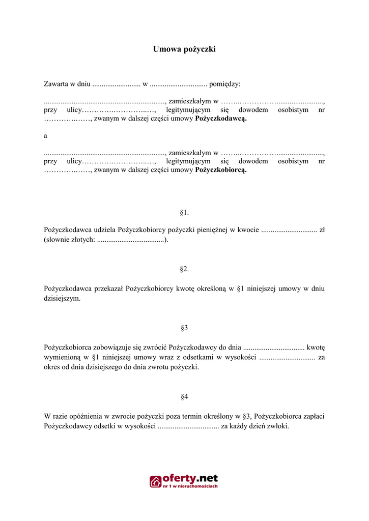Umowa pożyczki Zawarta w dniu .......................... w ............................... pomiędzy: ................................................................., zamieszkałym w ……..……………........................., przy ulicy………….…………..…, legitymującym się dowodem osobistym nr ………….……, zwanym w dalszej części umowy Pożyczkodawcą. a ................................................................., zamieszkałym w ……..……………........................., przy ulicy………….…………..…, legitymującym się dowodem osobistym nr ………….……, zwanym w dalszej części umowy Pożyczkobiorcą. §1. Pożyczkodawca udziela Pożyczkobiorcy pożyczki pieniężnej w kwocie .............................. zł (słownie złotych: ....................................). §2. Pożyczkodawca przekazał Pożyczkobiorcy kwotę określoną w §1 niniejszej umowy w dniu dzisiejszym. §3 Pożyczkobiorca zobowiązuje się zwrócić Pożyczkodawcy do dnia ................................. kwotę wymienioną w §1 niniejszej umowy wraz z odsetkami w wysokości .............................. za okres od dnia dzisiejszego do dnia zwrotu pożyczki. §4 W razie opóźnienia w zwrocie pożyczki poza termin określony w §3, Pożyczkobiorca zapłaci Pożyczkodawcy odsetki w wysokości ................................. za każdy dzień zwłoki. §5. W sprawach nieuregulowanych niniejszą umową będą miały zastosowanie przepisy Kodeksu cywilnego. §6. Umowę sporządzono w dwóch jednobrzmiących egzemplarzach, po jednym dla każdej ze stron. ……………………………… Pożyczkodawca ……….…………………… Pożyczkobiorca
