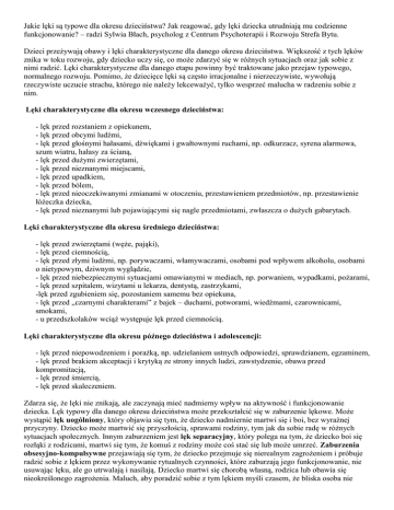 Jakie lęki są typowe dla okresu dzieciństwa? Jak reagować, gdy lęki dziecka utrudniają mu codzienne funkcjonowanie? – radzi Sylwia Błach, psycholog z Centrum Psychoterapii i Rozwoju Strefa Bytu. Dzieci przeżywają obawy i lęki charakterystyczne dla danego okresu dzieciństwa. Większość z tych lęków znika w toku rozwoju, gdy dziecko uczy się, co może zdarzyć się w różnych sytuacjach oraz jak sobie z nimi radzić. Lęki charakterystyczne dla danego etapu powinny być traktowane jako przejaw typowego, normalnego rozwoju. Pomimo, że dziecięce lęki są często irracjonalne i nierzeczywiste, wywołują rzeczywiste uczucie strachu, którego nie należy lekceważyć, tylko wesprzeć malucha w radzeniu sobie z nim. Lęki charakterystyczne dla okresu wczesnego dzieciństwa: - lęk przed rozstaniem z opiekunem, - lęk przed obcymi ludźmi, - lęk przed głośnymi hałasami, dźwiękami i gwałtownymi ruchami, np. odkurzacz, syrena alarmowa, szum wiatru, hałasy za ścianą, - lęk przed dużymi zwierzętami, - lęk przed nieznanymi miejscami, - lęk przed upadkiem, - lęk przed bólem, - lęk przed nieoczekiwanymi zmianami w otoczeniu, przestawieniem przedmiotów, np. przestawienie łóżeczka dziecka, - lęk przed nieznanymi lub pojawiającymi się nagle przedmiotami, zwłaszcza o dużych gabarytach. Lęki charakterystyczne dla okresu średniego dzieciństwa: - lęk przed zwierzętami (węże, pająki), - lęk przed ciemnością, - lęk przed złymi ludźmi, np. porywaczami, włamywaczami, osobami pod wpływem alkoholu, osobami o nietypowym, dziwnym wyglądzie, - lęk przed niebezpiecznymi sytuacjami omawianymi w mediach, np. porwaniem, wypadkami, pożarami, - lęk przed szpitalem, wizytami u lekarza, dentystą, zastrzykami, -lęk przed zgubieniem się, pozostaniem samemu bez opiekuna, - lęk przed „czarnymi charakterami” z bajek – duchami, potworami, wiedźmami, czarownicami, smokami, - u przedszkolaków wciąż występuje lęk przed ciemnością. Lęki charakterystyczne dla okresu późnego dzieciństwa i adolescencji: - lęk przed niepowodzeniem i porażką, np. udzielaniem ustnych odpowiedzi, sprawdzianem, egzaminem, - lęk przed brakiem akceptacji i krytyką ze strony innych ludzi, zawstydzenie, obawa przed kompromitacją, - lęk przed śmiercią, - lęk przed skaleczeniem. Zdarza się, że lęki nie znikają, ale zaczynają mieć nadmierny wpływ na aktywność i funkcjonowanie dziecka. Lęk typowy dla danego okresu dzieciństwa może przekształcić się w zaburzenie lękowe. Może wystąpić lęk uogólniony, który objawia się tym, że dziecko nadmiernie martwi się i boi, bez wyraźnej przyczyny. Dziecko może martwić się przyszłością, sprawami rodziny, tym jak da sobie radę w różnych sytuacjach społecznych. Innym zaburzeniem jest lęk separacyjny, który polega na tym, że dziecko boi się rozłąki z rodzicami, martwi się tym, że komuś z rodziny może coś stać się lub może umrzeć. Zaburzenia obsesyjno-kompulsywne przejawiają się tym, że dziecko przejmuje się nierealnym zagrożeniem i próbuje radzić sobie z lękiem przez wykonywanie rytualnych czynności, które zaburzają jego funkcjonowanie, nie usuwając lęku, ale go utrwalają i nasilają. Dziecko martwi się chorobą własną, rodzica lub obawia się nieokreślonego zagrożenia. Maluch, aby poradzić sobie z tym lękiem myśli czasem, że bliska osoba nie zachoruje, gdy on policzy do siedmiu, gdy pomyli się, musi zacząć liczyć od nowa – temu procesowi towarzyszy ogromne napięcie i strach. Fobie to lęk przed określonymi obiektami (np. pająkami) lub sytuacjami (np. przebywaniem z dziećmi w przedszkolu). Strach ten zazwyczaj jest nieuzasadniony oraz utrzymuje się przez minimum pół roku. Jest też zespół stresu pourazowego, który bywa następstwem jakiejś zagrażającej życiu sytuacji, której dziecko było świadkiem. Konsekwencją tego są pojawiające się przerażające, uporczywe myśli i wspomnienia z tym związane. Co powinno nas zaniepokoić? Gdy zauważymy, że nasze dziecko zachowuje się inaczej niż zwykle, ma obniżony nastrój, lęk odbiera mu radość z zabawy i zaangażowania w codzienne czynności warto udać się po pomoc do specjalisty. Objawy, które powinny nas zaniepokoić i skłonić do udania się do psychologa po poradę to: - dziecko zamartwia się, boi się wielu rzeczy/zjawisk - jest drażliwe, płaczliwe, krzyczy, reaguje agresywnie, - wycofuje się z aktywności, które sprawiały mu przyjemność, unika różnych sytuacji, - ma koszmary senne, - często skarży się na ból brzucha, głowy, ma biegunki, wymioty - moczy się w nocy. Pomoc psychologa pomoże zlokalizować źródło problemu i dać rodzicowi narzędzia, które pozwolą ukoić niepokoje dziecka.