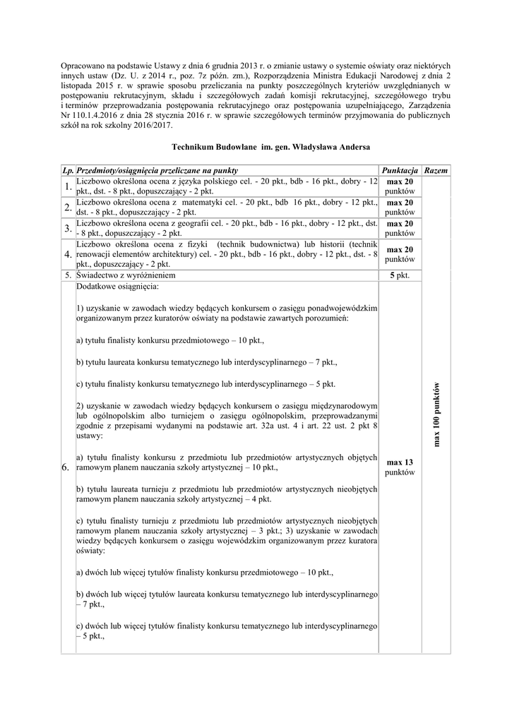 Opracowano na podstawie Ustawy z dnia 6 grudnia 2013 r. o zmianie ustawy o systemie oświaty oraz niektórych innych ustaw (Dz. U. z 2014 r., poz. 7z późn. zm.), Rozporządzenia Ministra Edukacji Narodowej z dnia 2 listopada 2015 r. w sprawie sposobu przeliczania na punkty poszczególnych kryteriów uwzględnianych w postępowaniu rekrutacyjnym, składu i szczegółowych zadań komisji rekrutacyjnej, szczegółowego trybu i terminów przeprowadzania postępowania rekrutacyjnego oraz postępowania uzupełniającego, Zarządzenia Nr 110.1.4.2016 z dnia 28 stycznia 2016 r. w sprawie szczegółowych terminów przyjmowania do publicznych szkół na rok szkolny 2016/2017. Technikum Budowlane im. gen. Władysława Andersa Lp. Przedmioty/osiągnięcia przeliczane na punkty Liczbowo określona ocena z języka polskiego cel. - 20 pkt., bdb - 16 pkt., dobry - 12 1. pkt., dst. - 8 pkt., dopuszczający - 2 pkt. Liczbowo określona ocena z matematyki cel. - 20 pkt., bdb 16 pkt., dobry - 12 pkt., 2. dst. - 8 pkt., dopuszczający - 2 pkt. Liczbowo określona ocena z geografii cel. - 20 pkt., bdb - 16 pkt., dobry - 12 pkt., dst. 3. - 8 pkt., dopuszczający - 2 pkt. Liczbowo określona ocena z fizyki (technik budownictwa) lub historii (technik 4. renowacji elementów architektury) cel. - 20 pkt., bdb - 16 pkt., dobry - 12 pkt., dst. - 8 pkt., dopuszczający - 2 pkt. 5. Świadectwo z wyróżnieniem Dodatkowe osiągnięcia: Punktacja Razem max 20 punktów max 20 punktów max 20 punktów max 20 punktów 5 pkt. 1) uzyskanie w zawodach wiedzy będących konkursem o zasięgu ponadwojewódzkim organizowanym przez kuratorów oświaty na podstawie zawartych porozumień: a) tytułu finalisty konkursu przedmiotowego – 10 pkt., b) tytułu laureata konkursu tematycznego lub interdyscyplinarnego – 7 pkt., max 100 punktów c) tytułu finalisty konkursu tematycznego lub interdyscyplinarnego – 5 pkt. 2) uzyskanie w zawodach wiedzy będących konkursem o zasięgu międzynarodowym lub ogólnopolskim albo turniejem o zasięgu ogólnopolskim, przeprowadzanymi zgodnie z przepisami wydanymi na podstawie art. 32a ust. 4 i art. 22 ust. 2 pkt 8 ustawy: a) tytułu finalisty konkursu z przedmiotu lub przedmiotów artystycznych objętych 6. ramowym planem nauczania szkoły artystycznej – 10 pkt., b) tytułu laureata turnieju z przedmiotu lub przedmiotów artystycznych nieobjętych ramowym planem nauczania szkoły artystycznej – 4 pkt. c) tytułu finalisty turnieju z przedmiotu lub przedmiotów artystycznych nieobjętych ramowym planem nauczania szkoły artystycznej – 3 pkt.; 3) uzyskanie w zawodach wiedzy będących konkursem o zasięgu wojewódzkim organizowanym przez kuratora oświaty: a) dwóch lub więcej tytułów finalisty konkursu przedmiotowego – 10 pkt., b) dwóch lub więcej tytułów laureata konkursu tematycznego lub interdyscyplinarnego – 7 pkt., c) dwóch lub więcej tytułów finalisty konkursu tematycznego lub interdyscyplinarnego – 5 pkt., max 13 punktów d) tytułu finalisty konkursu przedmiotowego – 7 pkt., e) tytułu laureata konkursu tematycznego lub interdyscyplinarnego – 5 pkt. f) tytułu finalisty konkursu tematycznego lub interdyscyplinarnego – 3 pkt.; 4) uzyskanie w zawodach wiedzy będących konkursem albo turniejem, o zasięgu ponadwojewódzkim lub wojewódzkim, przeprowadzanymi zgodnie z przepisami wydanymi na podstawie art. 32a ust. 4 i art. 22 ust. 2 pkt 8 ustawy: a) dwóch lub więcej tytułów finalisty konkursu z przedmiotu lub przedmiotów artystycznych objętych ramowym planem nauczania szkoły artystycznej – 10 pkt., b) dwóch lub więcej tytułów laureata turnieju z przedmiotu lub przedmiotów artystycznych nieobjętych ramowym planem nauczania szkoły artystycznej – 7 pkt., c) dwóch lub więcej tytułów finalisty turnieju z przedmiotu lub przedmiotów artystycznych nieobjętych ramowym planem nauczania szkoły artystycznej – 5 pkt., d) tytułu finalisty konkursu z przedmiotu lub przedmiotów artystycznych objętych ramowym planem nauczania szkoły artystycznej – 7 pkt., e) tytułu laureata turnieju z przedmiotu lub przedmiotów artystycznych nieobjętych ramowym planem nauczania szkoły artystycznej – 3 pkt., f) tytułu finalisty turnieju z przedmiotu lub przedmiotów artystycznych nieobjętych ramowym planem nauczania szkoły artystycznej – 2 pkt.; 5) uzyskanie wysokiego miejsca w zawodach wiedzy innych niż wymienione w pkt 1– 4, artystycznych lub sportowych, organizowanych przez kuratora oświaty lub inne podmioty działające na terenie szkoły, na szczeblu: a) międzynarodowym – 4 pkt., b) krajowym – 3 pkt., c) wojewódzkim – 2 pkt., d) powiatowym – 1 pkt. W przypadku gdy kandydat ma więcej niż jedno szczególne osiągnięcie w zawodach wiedzy, artystycznych i sportowych, wymienione na świadectwie ukończenia gimnazjum, maksymalna liczba punktów możliwych do uzyskania za wszystkie osiągnięcia wynosi 13 punktów. W konkursach wiedzy i artystycznych nie uwzględnia się wyróżnień za uczestnictwo w konkursach. Podstawą naliczania punktów jest wpis na świadectwie ukończenia gimnazjum. W przypadku niejednoznacznego zapisu wymagany jest do wglądu dyplom lub inny dokument potwierdzający rangę zawodów, nazwę organizatora oraz zajęte przez ucznia/zawodnika miejsce (np. potwierdzenie odpowiedniego polskiego/okręgowego związku sportowego, szczególnie jeśli organizatorem zawodów był inny podmiot działający z jego upoważnienia) 7. Aktywności kandydata na rzecz innych ludzi lub środowiska szkolnego, zwłaszcza w 2 punkty formie wolontariatu. 8. Egzamin gimnazjalny: max 40 punktów język polski (max 100%=20 pkt., wynik egzaminu mnoży się przez 0,2) historia i wiedza o społeczeństwie (max 100%=20 pkt., wynik egzaminu max 40 punktów mnoży się przez 0,2) • „część humanistyczna” „część matematyczno-przyrodnicza” matematyka (max 100%=20 pkt., wynik egzaminu mnoży się przez 0,2) przedmioty przyrodnicze (m