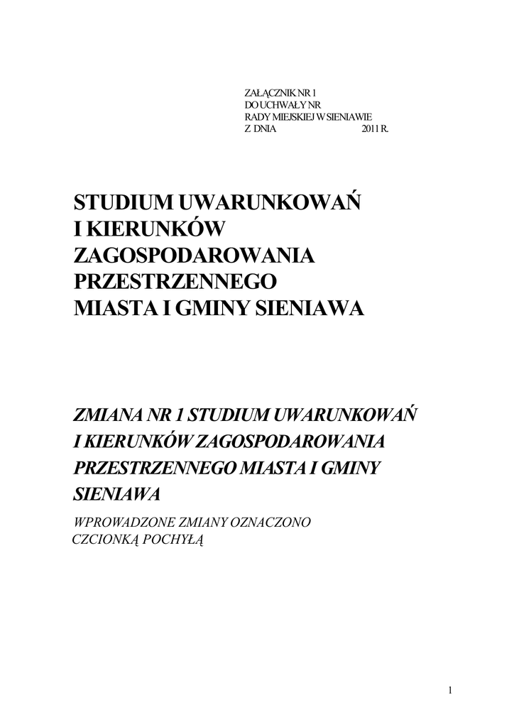 ZAŁĄCZNIK NR 1 DO UCHWAŁY NR RADY MIEJSKIEJ W SIENIAWIE Z DNIA 2011 R. STUDIUM UWARUNKOWAŃ I KIERUNKÓW ZAGOSPODAROWANIA PRZESTRZENNEGO MIASTA I GMINY SIENIAWA ZMIANA NR 1 STUDIUM UWARUNKOWAŃ I KIERUNKÓW ZAGOSPODAROWANIA PRZESTRZENNEGO MIASTA I GMINY SIENIAWA WPROWADZONE ZMIANY OZNACZONO CZCIONKĄ POCHYŁĄ 1 OPRACOWANIE OBEJMUJE: Cześć tekstową Studium, w tym: Część I – Uwarunkowania zagospodarowania przestrzennego (tekst) str. 5 - 18 z dokumentacją fotograficzną obszarów objętych zmianą nr 1 Studium Część II – Kierunki zagospodarowania przestrzennego (tekst) str. 19 - 61 stanowiącą załącznik Nr 1 do Uchwały Rady Miejskiej w Sieniawie o uchwaleniu zmiany nr 1 Studium u.i k.z.p., Część graficzną Studium, obejmującą: Rys. nr 1 „Uwarunkowania zagospodarowania przestrzennego” Plansza zbiorcza uwarunkowań stanowiący załącznik Nr 2 do Uchwały Rady Miejskiej w Sieniawie o uchwaleniu zmiany nr 1 Studium u.i k.z.p., Rys. nr 2 „Kierunki zagospodarowania przestrzennego” Struktura funkcjonalno – przestrzenna stanowiący załącznik Nr 3 do Uchwały Rady Miejskiej w Sieniawie o uchwaleniu zmiany nr 1 Studium u.i k.z.p., Rys. nr 3 „Kierunki zagospodarowania przestrzennego” Infrastruktura techniczna stanowiący załącznik Nr 4 do Uchwały Rady Miejskiej w Sieniawie o uchwaleniu zmiany nr 1 Studium u.i k.z.p., Sporządził: Burmistrz Miasta i Gminy Sieniawa Sieniawa 2011 r. 2 WSTĘP Głównym celem opracowania zmiany Studium uwarunkowań i kierunków zagospodarowania przestrzennego Miasta i Gminy Sieniawa, zwanego dalej Studium było wprowadzenie zmian w obrębie obszarów oznaczonych na rysunkach granicami zmiany Studium, a w teście Studium czcionką pochyłą. Wprowadzone zmiany wynikają z bieżącej polityki przestrzennej gminy i wniosków inwestorów zainteresowanych zagospodarowaniem obszarów objętych przedmiotową zmianą Studium. Studium stanowi wytyczne dla samorządu i użytkowników obszarów objętych jego granicami dla zagospodarowania przestrzeni gminy w sposób zapewniający zachowanie ładu przestrzennego, warunków dla zrównoważonego rozwoju oraz ochrony istniejących zasobów środowiska przyrodniczego i kulturowego, realizacji zadań o charakterze lokalnym i ponadlokalnym wprowadzonych w obszar gminy w zgodności z polityką przestrzenną samorządu i koncepcją zagospodarowania kraju. Stanowi również opracowanie analitycznego materiału służącego wypracowaniu kształtowania koncepcji rozwoju oraz własnej polityki przestrzennej przy uwzględnieniu występujących uwarunkowań lub ograniczeń będących jednocześnie źródłem informacji o terenach miasta i związkach z jego otoczeniem. Kierunki zagospodarowania przyjęte w Studium są podstawą dla sporządzenia miejscowych planów zagospodarowania przestrzennego, przy opracowaniu których, wymagane jest zachowanie zgodności z obowiązującym Studium. Pomimo, że Studium nie stanowi podstawy do wydawania decyzji o warunkach zabudowy i zagospodarowaniu terenu, i nie jest przepisem gminnym, w myśl obowiązujących obecnie przepisów prawa, kierunki zagospodarowania gminy przyjęte uchwałą Rady Miejskiej w Sieniawie stanowią warunki wymagane do zachowania przy zagospodarowaniu obszaru gminy w zgodności z wymogiem zachowania ładu przestrzennego oraz wskazanych w Studium wiodących funkcji zagospodarowania obszarów objętych zmianą Studium. Proponowane w Studium kierunki rozwoju stanowiące pożądany obraz struktury zagospodarowania całej gminy umożliwiają również skoordynowanie zamierzeń realizowanych w poszczególnych jej obszarach. W Studium uwarunkowań i kierunków zagospodarowania przestrzennego Miasta i Gminy Sieniawa uwzględniono kierunki zagospodarowania przyjęte w Planie zagospodarowania przestrzennego województwa podkarpackiego i Koncepcji przestrzennego zagospodarowania kraju. Opracowanie stanowi zmianę nr 1 Studium Uwarunkowań i Kierunków Zagospodarowania Przestrzennego Miasta i Gminy Sieniawa, uchwalonego Uchwałą Nr XXXI/258/98 Rady Miasta i Gminy Sieniawa z dnia 16 czerwca 1998r. Załącznikami do tej uchwały były: rysunki Kierunków Zagospodarowania Przestrzennego: Struktura Funkcjonalno – Przestrzenna, Infrastruktura Techniczna, stanowiące odpowiednio załączniki graficzne do tej uchwały. Do sporządzenia zmiany Studium uwarunkowań i kierunków zagospodarowania przestrzennego Miasta i Gminy Sieniawa przystąpiono Uchwałą Nr IX/96/07 Rady Miejskiej w Sieniawie z dnia 16 czerwca 2007r. o przystąpieniu do zmiany Studium. Zmiany ww. Uchwały dokonano Uchwałą Nr XXII/241/08 Rady Miejskiej w Sieniawie z dnia 30 lipca 2008 r. w sprawie zmiany uchwały dotyczącej przystąpienia do zmiany Studium. Zmiana nr 1 dotyczy sześciu spośród wszystkich dziewięciu obszarów objętych uchwałami o przystąpieniu do zmiany Studium i została oznaczona w części graficznej Studium. Dla obszarów objętych niniejszą Uchwałą o uchwaleniu zmiany nr 1 Studium przeprowadzona została stosowna procedura związana z trybem sporządzenia zmiany nr 1 Studium. 3 UWARUNKOWANIA Część tekstowa stanowi część I zmiany Studium i dotyczy terenów objętych zmianą Studium. Część graficzna została sporządzona w skali 1: 25 000 i obejmuje obszary nr 1-6, tj.: Obszar nr 1 pn. „Rudka” - obejmujący tereny oznaczone w części graficznej Uwarunkowań Nr 1, położone w granicach oznaczonych na załączniku graficznym Nr 1 do Uchwały Nr XXII/241/08 Rady Miejskiej w Sieniawie z dnia 30 lipca 2008 r. w sprawie zmiany uchwały dotyczącej przystąpienia do zmiany Studium, Obszar nr 2 pn. „Dobra” - obejmujący tereny oznaczone w części graficznej Uwarunkowań Nr 2, położone w granicach oznaczonych na załączniku graficznym Nr 2 do Uchwały Nr XXII/241/08 Rady Miejskiej w Sieniawie z dnia 30 lipca 2008 r. w sprawie zmiany uchwały dotyczącej przystąpienia do zmiany Studium, Obszar nr 3 pn. „Dybków – Czerce” - obejmujący teren