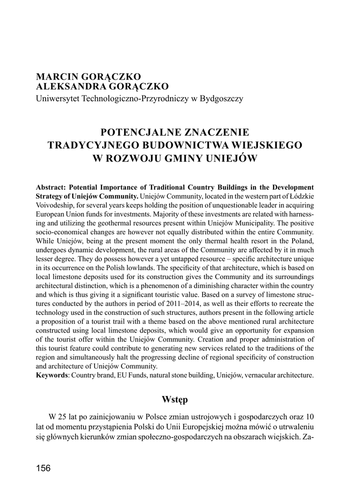 MARCIN GORĄCZKO ALEKSANDRA GORĄCZKO Uniwersytet Technologiczno-Przyrodniczy w Bydgoszczy POTENCJALNE ZNACZENIE TRADYCYJNEGO BUDOWNICTWA WIEJSKIEGO W ROZWOJU GMINY UNIEJÓW Abstract: Potential Importance of Traditional Country Buildings in the Development Strategy of Uniejów Community. Uniejów Community, located in the western part of Łódzkie Voivodeship, for several years keeps holding the position of unquestionable leader in acquiring European Union funds for investments. Majority of these investments are related with harnessing and utilizing the geothermal resources present within Uniejów Municipality. The positive socio-economical changes are however not equally distributed within the entire Community. While Uniejów, being at the present moment the only thermal health resort in the Poland, undergoes dynamic development, the rural areas of the Community are affected by it in much lesser degree. They do possess however a yet untapped resource – specific architecture unique in its occurrence on the Polish lowlands. The specificity of that architecture, which is based on local limestone deposits used for its construction gives the Community and its surroundings architectural distinction, which is a phenomenon of a diminishing character within the country and which is thus giving it a significant touristic value. Based on a survey of limestone structures conducted by the authors in period of 2011–2014, as well as their efforts to recreate the technology used in the construction of such structures, authors present in the following article a proposition of a tourist trail with a theme based on the above mentioned rural architecture constructed using local limestone deposits, which would give an opportunity for expansion of the tourist offer within the Uniejów Community. Creation and proper administration of this tourist feature could contribute to generating new services related to the traditions of the region and simultaneously halt the progressing decline of regional specificity of construction and architecture of Uniejów Community. Keywords: Country brand, EU Funds, natural stone building, Uniejów, vernacular architecture. Wstęp W 25 lat po zainicjowaniu w Polsce zmian ustrojowych i gospodarczych oraz 10 lat od momentu przystąpienia Polski do Unii Europejskiej można mówić o utrwaleniu się głównych kierunków zmian społeczno-gospodarczych na obszarach wiejskich. Za- 156 sadniczym osiągnięciem tego okresu, związanym w dużej mierze z dofinansowaniem ze środków unijnych w ramach Wspólnej Polityki Rolnej, była znaczna modernizacja gospodarstw rolnych przez ich wyposażenie w nowoczesne maszyny i urządzenia, co pozwoliło na intensyfikację produkcji i zwiększenie jej opłacalności [Wilkin 2014]. Jednocześnie jednak nasiliła się tendencja do zwiększania się przeciętnego areału i koncentracja produkcji, często kosztem eliminacji z produkcji rynkowej i stopniowej likwidacji gospodarstw małych i w nowych realiach nierentownych. Konsekwencją powyższych zjawisk są postępujące zmiany w strukturze zatrudnienia ludności wiejskiej. Coraz większa liczba osób mieszkających na wsi upatruje możliwości zarobkowych w działalności pozarolniczej. Poszukiwanie nowych źródeł utrzymania przejawia się często w inicjatywach związanych z rozwojem turystyki. Dotyczy to zarówno terenów tradycyjnie postrzeganych jako turystycznie atrakcyjne np. rejonów górskich czy nadmorskich, ale także w wielu przypadkach obszarów mniej rozpoznawalnych, na których umiejętnie promowane są lokalne zasoby przyrodnicze i kulturowe. Celem pracy jest zainicjowanie dyskusji dotyczącej wykorzystania potencjału kulturowego w gminie Uniejów w postaci dobrze zachowanych i unikalnych w skali niżu polskiego zespołów zabudowy regionalnej wznoszonej z kamienia. O ile regionalizm w architekturze wiejskiej bazującej na surowcach skalnych jest nadal widoczny w obrębie całej Kotliny Kolskiej i jej bezpośrednim sąsiedztwie [Gorączko, Gorączko 2011, 2013, 2014, 2015], to jednak najsilniej zaznacza się w pobliżu miejsca ich eksploatacji, a więc w gminie Uniejów. Fakt ten, w połączeniu z wyjątkową skutecznością lokalnych liderów w realizacji prorozwojowych inwestycji finansowanych ze środków unijnych, daje szansę na budowę na analizowanym terenie nowej marki, integrującej ukierunkowaną na turystykę przedsiębiorczość. Jednocześnie działania te sprzyjać mogą zachowaniu rzadkiego dziedzictwa kulturowego, jakim jest tradycyjne budownictwo wiejskie. 1. Fenomen Uniejowa – geneza sukcesu gospodarczego miasta 1.1. Gmina Uniejów jako obszar peryferyjny Do niedawna gminę miejsko-wiejską Uniejów, zajmującą obszar o powierzchni 129 km2, położoną w północno-zachodniej przygranicznej części woj. łódzkiego, pod względem stopnia rozwoju społeczno-gospodarczego można było uznać za typowe tereny peryferyjne. Wynikało to ze znacznego oddalenia gminy od większych ośrodków miejskich, przeciętnych warunków glebowych, nadmiernego rozdrobnienia gospodarstw i ich słabego wyposażenia w nowoczesne maszyny i urządzenia rolnicze, niskiej kultury rolnej, wydajności pracy i towarowości produkcji, a także słabego rozwoju infrastruktury technicznej oraz niskiego poziomu i jakości życia mieszkańców. 157 Sieć osadniczą gminy reprezentują 34 miejscowości, z których największą jest jedyne na tym terenie miasto Uniejów, liczące ok. 3000 mieszkańców. Miasteczko na tle podobnych, występujących we wschodniej części Wielkopolski (takich jak np. pobliskie Dąbie), wyróżniała jedynie obecność w jego granicach administracyjnych gotyckiego zamku biskupów gnieźnieńskich. W latach 50. i 60. XX w. obiekt ten został poddany pełnej odbudowie, a następnie adaptacji do pełnienia funkcji usługowych. Mimo że stał się on dość popularnym miejscem organizowania konferencji naukowych, szkoleń oraz innych spotkań, jego funkcjonowanie n