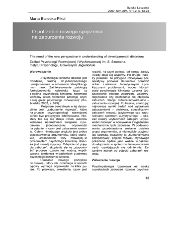 Sztuka Leczenia 2007, tom XIV, nr 1-2, s. 13-24 Marta Białecka-Pikul O potrzebie nowego spojrzenia na zaburzenia rozwoju The need of the new perspective in understanding of developmental disorders Zakład Psychologii Rozwojowej i Wychowawczej im. S. Szumana, Instytut Psychologii, Uniwersytet Jagielloński Wprowadzenie „Psychologia kliniczna dziecka jest dziedziną trudną do jednoznacznego umiejscowienia w schemacie klasyfikacyjnym nauk. Zainteresowanie patologią funkcjonowania człowieka łączy ją z ogólną psychologią kliniczną, natomiast wczesny okres tworzenia patologii czyni z niej gałąź psychologii rozwojowej” (Kościelska 2002, s. 623). Pojęciem centralnym w tej dyscyplinie jest „zaburzenie rozwoju”, które na gruncie psychopatologii rozwojowej winno być precyzyjnie zdefiniowane. Niestety tak się nie dzieje i wielu autorów wskazuje na trudności związane z podaniem jednoznacznej odpowiedzi na pytanie, – czym jest zaburzenie rozwoju. Celem niniejszego artykułu jest próba przedstawienia argumentów, które stanowią uzasadnienie tezy mówiącej, iż przedmiotem psychologii klinicznej dziecka jest rozwój atypowy. Odejście od pojęcia zaburzeń, skupiania się na „atypowości” procesu rozwoju jest ważną, współczesną tendencją w badaniach z zakresu psychologii klinicznej dziecka. Ukazanie nowego podejścia do rozwoju, który nie przebiega w sposób typowy wymaga odpowiedzi na kilka pytań. Po pierwsze, określenia, czym jest rozwój, na czym polega, od czego zależy i kiedy staje się atypowy. Po drugie, należy pokazać, że przyjęcie rozwojowej perspektywy pozwala skutecznie poradzić sobie z wieloma teoretycznymi i praktycznymi problemami, wobec których staje psychologia kliniczna dziecka (poszukiwanie etiologii zaburzeń, współwystępowanie czy nakładanie się objawów zaburzeń, relacja: różnice indywidualne – zaburzenia rozwoju). Po trzecie, analizując najnowsze wyniki badań nad wybranymi zaburzeniami – dysleksją, specyficznym zaburzeń rozwoju językowego czy zaburzeniami spektrum autystycznego – ukazać należy użyteczność kategorii „atypowości rozwoju” w opisywaniu i wyjaśnianiu mechanizmu tych zaburzeń. W podsumowaniu przedstawiona zostanie ostatnia grupa argumentów, a mianowicie przyjmując szerszą, nazwijmy ją „humanistyczną perspektywę”, pojęcie rozwoju atypowego pokazane będzie jako ważne w dążeniu do włączania w społeczne funkcjonowanie osób rozwijających się odmiennie. Zacznijmy jednak od pojęcia zaburzeń rozwoju. Zaburzenie rozwoju Psychopatologia rozwojowa jest nauką o postaciach zaburzeń rozwoju psychicz- 13 O potrzebie nowego spojrzenia na zaburzenia rozwoju nego, o ich przyczynach, mechanizmach powstawania i skutkach. Jako teoretyczna podstawa psychologii klinicznej dziecka dziedzina ta uznaje pojęcie zaburzeń rozwoju za kluczowe i podejmuje próby określenia istoty zaburzeń (Kazdin 1989, Cicchetti 1993). Zaburzenie rozwoju, a zatem zaburzenie ujawniające się w okresie dzieciństwa lub adolescencji, niezwykle trudno zdefiniować. Jak piszą Garson, Butcher i Mineka (2005) „nie sposób zrozumieć zaburzeń okresu dzieciństwa bez odniesienia się do procesów rozwojowych” (s. 769). To oczywiste stwierdzenie zmusza nas do prób określenia, czym są procesy rozwojowe i w związku z tym – do czego odnosimy się, kiedy badamy lub opisujemy nieprawidłowe, zaburzone zachowania u dzieci. Co jest zatem podstawową kategorią, którą należy uwzględnić? Odpowiedź brzmi – wiek dziecka. Jak pisze Małgorzata Kościelska (2002) „w zależności od wieku zmieniają się formy patologii, możliwości adaptacyjne, rodzaje czynników ryzyka zaburzeń i sposoby radzenia sobie z trudnościami” (s. 633). Dane zachowanie można uznać za normalne w określonym wieku (np. moczenie nocne u rocznego dziecka, napady złości u trzylatka czy lęki przed ciemnością u pięciolatka). Jeśli większość (2/3) populacji dzieci w danym wieku prezentuje określone zachowanie – to stosując tzw. normę rozwojową – nie uznajemy tego zachowania za zaburzone. Znajomość takich norm rozwojowych, świadomość istnienia tzw. kamieni milowych w rozwoju, które szeroko opisano w podręcznikach psychologii rozwoju, wydaje się zatem kluczowa dla określenia – czym jest zaburzenie rozwoju. Czy jednak taka opisowa wiedza wystarcza? Inne istotne kryteria, będące podstawą określania, czy dane zachowanie jest objawem, a zatem świadczy o zaburzeniu rozwoju, stanowią nasilenie, częstotliwość oraz czas trwania danego zachowania. Siła przeżywania lęku, to czy pojawia się on każdej nocy czy raz w miesiącu oraz czy powoduje trudności w życiu 14 dziecka i rodziny, bo nie przestaje występować już od pół roku, z pewnością decydują o tym, jak bardzo zachowanie dziecka nas, dorosłych, niepokoi. A zatem możemy zwrócić uwagę, że pełny opis zaburzenia rozwoju powinien dawać informacje o objawach, czyli takich dających się zaobserwować zachowaniach, które nie są charakterystyczne dla dziecka w danym wieku, występują często, z dużą siłą i powtarzają się przez dłuższy czas. Jednocześnie objawy te utrudniają funkcjonowanie dziecka w domu, w szkole, w relacjach z rówieśnikami. Trudność, kłopot, a nawet ból czy cierpienie stanowią ważne kryterium zaburzenia. W przypadku dzieci należy podkreślić, że poczucie dyskomfortu czy utrudnienia w codziennym życiu może w związku objawem odczuwać samo dziecko (np. dziecko moczące się wstydzi się i nie chce wyjechać na kolonię) i/lub jego rodzice, opiekunowie (np. nieprzespane noce, lęk o dziecko itd.). Pytanie, jak dane zachowanie dziecka jest odbierane przez rodziców stanowi kolejne ważne zagadnienie, gdy rozważamy istotę zaburzenia rozwoju. Dodatkowym źródłem trudności w określaniu zaburzeń u dzieci jest fakt, że podstawą opisu dziecięcych zachowań są rozmowy, standaryzowane wywiady 