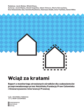 Redakcja: Jacek Białas, Witold Klaus, Autorzy: Jacek Białas, Dawid Cegiełka, Adam Chmura, Marta Górczyńska, Ewa Ostaszewska-Żuk, Karolina Rusiłowicz, Katarzyna Słubik, Anna Trylińska, Daniel Witko Wciąż za kratami Raport z monitoringu strzeżonych ośrodków dla cudzoziemców przeprowadzonego przez Helsińską Fundację Praw Człowieka i Stowarzyszenie Interwencji Prawnej Jacek Białas, Dawid Cegiełka, Adam Chmura, Marta Górczyńska, Ewa Ostaszewska-Żuk, Karolina Rusiłowicz, Katarzyna Słubik, Anna Trylińska, Daniel Witko Wciąż za kratami Raport z monitoringu strzeżonych ośrodków dla cudzoziemców przeprowadzonego przez Helsińską Fundację Praw Człowieka i Stowarzyszenie Interwencji Prawnej pod redakcją Jacka Białasa i Witolda Klausa Helsińska Fundacja Praw Człowieka Stowarzyszenie Interwencji Prawnej Warszawa 2014 Redakcja: Jacek Białas, Witold Klaus Autorzy: Jacek Białas, Dawid Cegiełka, Adam Chmura, Marta Górczyńska, Ewa Ostaszewska-Żuk, Karolina Rusiłowicz, Katarzyna Słubik, Anna Trylińska, Daniel Witko Redakcja językowa i korekta: Elżbieta Dajksler Projekt okładki, skład i łamanie: Kolektyw Wizualny (www.kolektywwizualny.pl) ISBN: 978-83-62245-32-1 Wydanie I, Warszawa 2014 Wydawcy: Stowarzyszenie Interwencji Prawnej ul. Siedmiogrodzka 5/51, 01-204 Warszawa tel./fax 22 621-51-65 e-mail: [email protected] www.interwencjaprawna.pl Helsińska Fundacja Praw Człowieka ul. Zgoda 11, 00-018 Warszawa tel.: 22 556-44-66 fax: 22 556-44-50 e-mail: [email protected] www.hfhr.pl © Copyright by Stowarzyszenie Interwencji Prawnej, Helsińska Fundacja Praw Człowieka SPIS TREŚCI I. WSTĘP.......................................................................................................................................................6 1. Cel i kontekst monitoringu................................................................................................ 7 2. Metodologia monitoringu.................................................................................................. 9 3. Informacje statystyczne..................................................................................................... 10 II. WYNIKI MONITORINGU.............................................................................................................. 14 1. Stan techniczny, wygląd oraz sprofilowanie ośrodków................................... 15 15 1.1. Ogólny wygląd ośrodków......................................................................................................... 1.2. Pokoje dla cudzoziemców i pomieszczenia wspólne........................................................... 16 17 1.3. Sprofilowanie ośrodków.......................................................................................................... 2. Zasady pobytu cudzoziemców w strzeżonym ośrodku.................................. 17 2.1. Porządek wewnętrzny ośrodków............................................................................................ 17 18 2.2. Porządek dnia i swoboda poruszania się po ośrodku.......................................................... 2.3. Zajęcia kulturalno-oświatowe, sportowe i czas wolny.......................................................... 19 I. WSTĘP 2.4. Wyżywienie.............................................................................................................................. 21 2.5. Możliwość robienia zakupów poza ośrodkiem...................................................................... 22 3. Kontakt pomiędzy personelem ośrodków a cudzoziemcami...................... 23 3.1. Stosunek funkcjonariuszy do cudzoziemców........................................................................ 23 3.2. Umundurowanie i ubiór funkcjonariuszy i pracowników strzeżonych ośrodków................ 24 3.3. Znajomość języków obcych wśród funkcjonariuszy i pracowników ośrodków................... 25 3.4. Tłumaczenia............................................................................................................................. 26 4. Informowanie cudzoziemców o ich sytuacji prawnej....................................... 27 4.1. Informacja o sytuacji prawnej udzielana cudzoziemcom przez administrację ośrodka......................................................................................................... 27 4.2. Kontakt z organizacjami pozarządowymi i dostęp do pomocy prawnej............................. 28 5. Prawo cudzoziemców do kontaktu ze światem zewnętrznym..................... 29 5.1. Korzystanie z telefonu stacjonarnego i komórkowego.......................................................... 29 5.2. Prawo do korespondencji........................................................................................................ 30 5.3. Prawo do widzeń...................................................................................................................... 32 4 6. Pomoc medyczna i psychologiczna............................................................................ 33 6.1. Dostęp do pomocy medycznej................................................................................................ 33 6.2. Specjalizacje i płeć zatrudnionych lekarzy............................................................................ 33 6.3. Dostęp do specjalistycznej pomocy medycznej i transport do zewnętrznych placówek medycznych.................................................................................................................... 34 6.4. Pomoc psychologiczna........................................................................................................... 35 6.5. Identyfikacja ofiar traumy lub tortur........................................................................................ 36 7. Sytuacja dzieci przebywających w strzeżonych ośrodkach......................... 36 7.1. Warunki lokalowe.............................