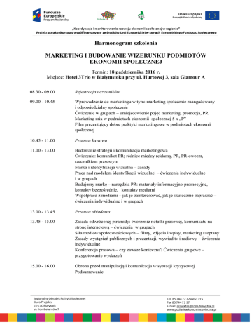 Harmonogram szkolenia MARKETING I BUDOWANIE WIZERUNKU PODMIOTÓW EKONOMII SPOŁECZNEJ Termin: 18 października 2016 r. Miejsce: Hotel 3Trio w Białymstoku przy ul. Hurtowej 3, sala Glamour A 08.30 - 09.00 Rejestracja uczestników 09.00 - 10.45 Wprowadzenie do marketingu w tym: marketing społecznie zaangażowany i odpowiedzialny społecznie Ćwiczenie w grupach – umiejscowienie pojęć marketing, promocja, PR Marketing mix w podmiotach ekonomii społecznej 5 x „P” Film prezentujący dobre praktyki marketingowe w podmiotach ekonomii społecznej 10.45 - 11.00 Przerwa kawowa 11.00 - 13.00 Budowanie strategii i komunikacja marketingowa Ćwiczenia: komunikat PR; różnice miedzy reklamą, PR, PR-owcem, rzecznikiem prasowym Marka i identyfikacja wizualna – zasady Praca nad modelem identyfikacji wizualnej – ćwiczenia indywidualne i w grupach Budujemy markę – narzędzia PR: materiały informacyjno-promocyjne, kontakty bezpośrednie, kontakty mediami Współpraca z mediami – jak je zainteresować, jak je skutecznie zapraszać – ćwiczenia indywidualne i w grupach 13.00 - 13.45 Przerwa obiadowa 13.45 - 15.00 Zasada odwróconej piramidy: tworzenie notatki prasowej, komunikatu na stronę internetową – ćwiczenia w grupach Siła mediów społecznościowych – filmy, zdjęcia i wpisy, marketing szeptany Zasady wystąpień publicznych i prezentacji, wywiad tv i radiowy – ćwiczenia indywidualne Konferencja prasowa – czy zawsze konieczna? Ćwiczenia grupowe – przygotowanie wydarzeń 15.00 - 16.00 Obrona przed manipulacją i komunikacja w sytuacji kryzysowej Podsumowanie