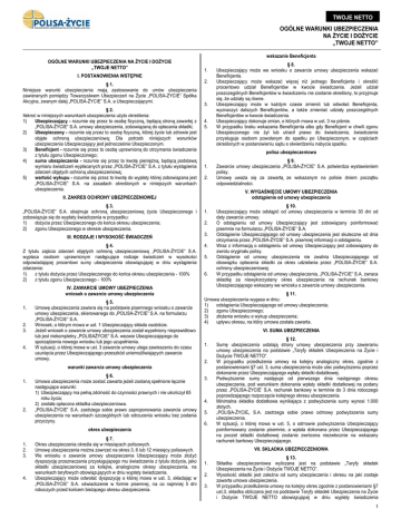 TWOJE NETTO OGÓLNE WARUNKI UBEZPIECZENIA NA ŻYCIE I DOŻYCIE „TWOJE NETTO” wskazanie Beneficjenta OGÓLNE WARUNKI UBEZPIECZENIA NA ŻYCIE I DOŻYCIE „TWOJE NETTO” 1. I. POSTANOWIENIA WSTĘPNE § 1. Niniejsze warunki ubezpieczenia mają zastosowanie do umów ubezpieczenia zawieranych pomiędzy Towarzystwem Ubezpieczeń na Życie „POLISA-ŻYCIE” Spółka Akcyjna, zwanym dalej „POLISA-ŻYCIE” S.A. a Ubezpieczającymi. § 2. Ilekroć w niniejszych warunkach ubezpieczenia użyto określenia: 1) Ubezpieczający - rozumie się przez to osobę fizyczną, będącą stroną zawartej z „POLISA-ŻYCIE” S.A. umowy ubezpieczenia, zobowiązaną do opłacania składki; 2) Ubezpieczony - rozumie się przez to osobę fizyczną, której życie lub zdrowie jest objęte ochroną ubezpieczeniową; Dla potrzeb niniejszych warunków ubezpieczenia Ubezpieczający jest jednocześnie Ubezpieczonym. 3) Beneficjent - rozumie się przez to osobę uprawnioną do otrzymania świadczenia z tytułu zgonu Ubezpieczonego; 4) suma ubezpieczenia - rozumie się przez to kwotę pieniężną, będącą podstawą wymiaru świadczeń wypłacanych przez „POLISA-ŻYCIE” S.A. z tytułu wystąpienia zdarzeń objętych ochroną ubezpieczeniową; 5) wartość wykupu - rozumie się przez to kwotę do wypłaty której zobowiązana jest „POLISA-ŻYCIE” S.A. na zasadach określonych w niniejszych warunkach ubezpieczenia. 2. 3. 4. 5. polisa ubezpieczeniowa 1. 2. III. RODZAJE I WYSOKOŚĆ ŚWIADCZEŃ § 4. Z tytułu zajścia zdarzeń objętych ochroną ubezpieczeniową „POLISA-ŻYCIE” S.A. wypłaca osobom uprawnionym następujące rodzaje świadczeń w wysokości odpowiadającej procentowi sumy ubezpieczenia obowiązującej w dniu wystąpienia zdarzenia: 1) z tytułu dożycia przez Ubezpieczonego do końca okresu ubezpieczenia - 100% 2) z tytułu zgonu Ubezpieczonego - 100% IV. ZAWARCIE UMOWY UBEZPIECZENIA wniosek o zawarcie umowy ubezpieczenia 1. 2. 3. 4. § 5. Umowę ubezpieczenia zawiera się na podstawie pisemnego wniosku o zawarcie umowy ubezpieczenia, skierowanego do „POLISA-ŻYCIE” S.A. na formularzu „POLISA-ŻYCIE” S.A. Wniosek, o którym mowa w ust. 1 Ubezpieczający składa osobiście. Jeżeli wniosek o zawarcie umowy ubezpieczenia został wypełniony nieprawidłowo lub jest niekompletny „POLISAŻYCIE” S.A. wezwie Ubezpieczającego do sporządzenia nowego wniosku lub jego uzupełnienia. W sytuacji, o której mowa w ust. 3 zawarcie umowy ulega zawieszeniu do czasu usunięcia przez Ubezpieczającego przeszkód uniemożliwiających zawarcie umowy. 1. 2. 3. 4. 5. 6. 2. § 6. Umowa ubezpieczenia może zostać zawarta jeżeli zostaną spełnione łącznie następujące warunki: 1) Ubezpieczający ma pełną zdolność do czynności prawnych i nie ukończył 65 roku życia; 2) została opłacona składka ubezpieczeniowa. „POLISA-ŻYCIE” S.A. zastrzega sobie prawo zaproponowania zawarcia umowy ubezpieczenia na warunkach szczególnych lub odrzucenia wniosku bez podania przyczyny. VI. SUMA UBEZPIECZENIA 1. 2. 3. 4. 5. 6. okres ubezpieczenia 1. 2. 3. 4. § 7. Okres ubezpieczenia określa się w miesiącach polisowych. Umowę ubezpieczenia można zawrzeć na okres 3, 6 lub 12 miesięcy polisowych. We wniosku o zawarcie umowy ubezpieczenia Ubezpieczający może złożyć dyspozycję przeznaczania przysługującego mu świadczenia z tytułu dożycia, jako składki ubezpieczeniowej za kolejne, analogiczne okresy ubezpieczenia, na warunkach taryfowych obowiązujących w dniu wypłaty świadczenia. Ubezpieczający może odwołać dyspozycję o której mowa w ust. 3, składając w „POLISA-ŻYCIE” S.A. oświadczenie w formie pisemnej, na co najmniej 5 dni roboczych przed końcem bieżącego okresu ubezpieczenia. § 10. Ubezpieczający może odstąpić od umowy ubezpieczenia w terminie 30 dni od daty zawarcia umowy. O odstąpieniu od umowy Ubezpieczający jest zobowiązany poinformować pisemnie na formularzu „POLISA-ŻYCIE” S.A. Odstąpienie Ubezpieczającego od umowy ubezpieczenia jest skuteczne od dnia otrzymania przez „POLISA-ŻYCIE” S.A. pisemnej informacji o odstąpieniu. Wraz z informacją o odstąpieniu od umowy Ubezpieczający jest zobowiązany do zwrotu oryginału polisy. Odstąpienie od umowy ubezpieczenia nie zwalnia Ubezpieczającego od obowiązku opłacenia składki za okres udzielania przez „POLISA-ŻYCIE” S.A. ochrony ubezpieczeniowej. W przypadku odstąpienia od umowy ubezpieczenia, „POLISA-ŻYCIE” S.A. zwraca składkę za niewykorzystany okres ubezpieczenia na rachunek bankowy Ubezpieczającego wskazany we wniosku o zawarcie umowy ubezpieczenia. § 11. Umowa ubezpieczenia wygasa w dniu: 1) odstąpienia Ubezpieczającego od umowy ubezpieczenia; 2) zgonu Ubezpieczonego; 3) złożenia wniosku o wykup ubezpieczenia; 4) upływu okresu, na który umowa została zawarta. warunki zawarcia umowy ubezpieczenia 1. § 9. Zawarcie umowy ubezpieczenia „POLISA-ŻYCIE” S.A. potwierdza wystawieniem polisy. Umowę uważa się za zawartą ze wskazanym na polisie dniem początku odpowiedzialności. V. WYGAŚNIĘCIE UMOWY UBEZPIECZENIA odstąpienie od umowy ubezpieczenia II. ZAKRES OCHRONY UBEZPIECZENIOWEJ § 3. „POLISA-ŻYCIE” S.A. obejmuje ochroną ubezpieczeniową życie Ubezpieczonego i zobowiązuje się do wypłaty świadczenia w przypadku: 1) dożycia przez Ubezpieczonego do końca okresu ubezpieczenia; 2) zgonu Ubezpieczonego w okresie ubezpieczenia. § 8. Ubezpieczający może we wniosku o zawarcie umowy ubezpieczenia wskazać Beneficjenta. Ubezpieczający może wskazać więcej niż jednego Beneficjenta i określić procentowo udział Beneficjentów w kwocie świadczenia. Jeżeli udział poszczególnych Beneficjentów w świadczeniu nie zostanie określony, to przyjmuje się, że udziały są równe. Ubezpieczający może w każdym czasie zmienić lub odwołać Beneficjenta, wyznaczyć dalszych Beneficjentów, a także zmieniać udziały poszczególnych Beneficjentów 