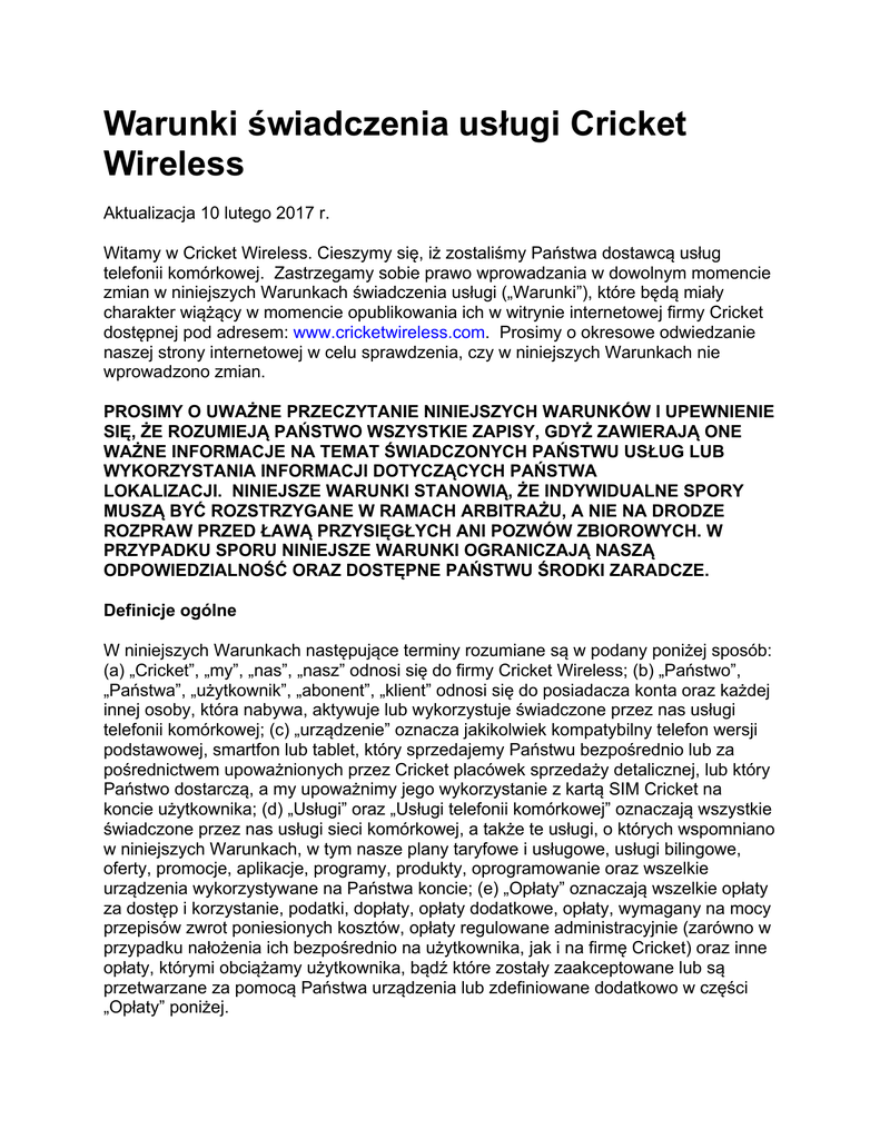 Warunki świadczenia usługi Cricket Wireless Aktualizacja 10 lutego 2017 r. Witamy w Cricket Wireless. Cieszymy się, iż zostaliśmy Państwa dostawcą usług telefonii komórkowej. Zastrzegamy sobie prawo wprowadzania w dowolnym momencie zmian w niniejszych Warunkach świadczenia usługi („Warunki”), które będą miały charakter wiążący w momencie opublikowania ich w witrynie internetowej firmy Cricket dostępnej pod adresem: www.cricketwireless.com. Prosimy o okresowe odwiedzanie naszej strony internetowej w celu sprawdzenia, czy w niniejszych Warunkach nie wprowadzono zmian. PROSIMY O UWAŻNE PRZECZYTANIE NINIEJSZYCH WARUNKÓW I UPEWNIENIE SIĘ, ŻE ROZUMIEJĄ PAŃSTWO WSZYSTKIE ZAPISY, GDYŻ ZAWIERAJĄ ONE WAŻNE INFORMACJE NA TEMAT ŚWIADCZONYCH PAŃSTWU USŁUG LUB WYKORZYSTANIA INFORMACJI DOTYCZĄCYCH PAŃSTWA LOKALIZACJI. NINIEJSZE WARUNKI STANOWIĄ, ŻE INDYWIDUALNE SPORY MUSZĄ BYĆ ROZSTRZYGANE W RAMACH ARBITRAŻU, A NIE NA DRODZE ROZPRAW PRZED ŁAWĄ PRZYSIĘGŁYCH ANI POZWÓW ZBIOROWYCH. W PRZYPADKU SPORU NINIEJSZE WARUNKI OGRANICZAJĄ NASZĄ ODPOWIEDZIALNOŚĆ ORAZ DOSTĘPNE PAŃSTWU ŚRODKI ZARADCZE. Definicje ogólne W niniejszych Warunkach następujące terminy rozumiane są w podany poniżej sposób: (a) „Cricket”, „my”, „nas”, „nasz” odnosi się do firmy Cricket Wireless; (b) „Państwo”, „Państwa”, „użytkownik”, „abonent”, „klient” odnosi się do posiadacza konta oraz każdej innej osoby, która nabywa, aktywuje lub wykorzystuje świadczone przez nas usługi telefonii komórkowej; (c) „urządzenie” oznacza jakikolwiek kompatybilny telefon wersji podstawowej, smartfon lub tablet, który sprzedajemy Państwu bezpośrednio lub za pośrednictwem upoważnionych przez Cricket placówek sprzedaży detalicznej, lub który Państwo dostarczą, a my upoważnimy jego wykorzystanie z kartą SIM Cricket na koncie użytkownika; (d) „Usługi” oraz „Usługi telefonii komórkowej” oznaczają wszystkie świadczone przez nas usługi sieci komórkowej, a także te usługi, o których wspomniano w niniejszych Warunkach, w tym nasze plany taryfowe i usługowe, usługi bilingowe, oferty, promocje, aplikacje, programy, produkty, oprogramowanie oraz wszelkie urządzenia wykorzystywane na Państwa koncie; (e) „Opłaty” oznaczają wszelkie opłaty za dostęp i korzystanie, podatki, dopłaty, opłaty dodatkowe, opłaty, wymagany na mocy przepisów zwrot poniesionych kosztów, opłaty regulowane administracyjnie (zarówno w przypadku nałożenia ich bezpośrednio na użytkownika, jak i na firmę Cricket) oraz inne opłaty, którymi obciążamy użytkownika, bądź które zostały zaakceptowane lub są przetwarzane za pomocą Państwa urządzenia lub zdefiniowane dodatkowo w części „Opłaty” poniżej. Umowa użytkownika usług bezprzewodowych Niniejsze Warunki stanowią część Umowy dla klienta sieci komórkowej („Umowa”) i regulują warunki relacji pomiędzy klientem a firmą Cricket w zakresie dostarczanych klientowi urządzeń i usług. Nasza Umowa z Państwem obejmuje również: (a) nasze Zasady dot. prywatności dostępne pod adresem www.cricketwireless.com/privacy; (b) nasze plany taryfowe i inne materiały transakcyjne, w tym rachunki i podsumowania usług podpisane lub zaakceptowane przez użytkownika bądź dostarczone mu w ramach dokumentów potwierdzających transakcje na rzecz użytkownika; (c) wszelkie warunki obowiązujące dla produktów i usług bezprzewodowych, funkcji, promocji i aplikacji, które dostarczamy klientom lub udostępniamy na naszej stronie internetowej (www.cricketwireless.com), a które nie zostały opisane w niniejszych Warunkach (łącznie zwane „Materiałami dodatkowymi”) oraz (d) nasze Zasady (zdefiniowane poniżej). W przypadku kolizji interpretacyjnej pomiędzy niniejszymi Warunkami a jakimikolwiek dodatkowymi materiałami lub zasadami, pierwszeństwo mają niniejsze Warunki. Akceptacja Warunków Użytkownik oświadcza, że ma co najmniej 18 lat i/lub jest uprawniony do akceptacji niniejszych Warunków i przystąpienia do Umowy. Użytkownik przystępuje do Umowy z firmą Cricket w momencie zaakceptowania przez niego niniejszych Warunków poprzez: (a) dostarczenie nam odręcznego lub elektronicznego podpisu bądź potwierdzenia ustnego akceptacji Warunków, a także w przypadku dostarczenia nam takiego oświadczenia w innej formie drukowanej, ustnej czy elektronicznej; (b) uiszczenie opłaty za usługę; (c) aktywację usługi; (d) korzystanie lub próbę skorzystania z usługi w jakikolwiek sposób; (e) aktualizację lub modyfikację usługi, a także (f) otwarcie opakowania urządzenia; (g) włączenie aplikacji, programu czy oprogramowania, których warunki zostały zaakceptowane. Jeśli nie akceptujecie Państwo niniejszych Warunków, prosimy nie wykonywać żadnej z wyżej wymienionych czynności. Zasady Usługi regulowane są naszymi zasadami biznesowymi, praktykami oraz procedurami („Zasady”), w tym Zasadami dot. dopuszczalnego użytkowania dostepnymi na stronie www.cricketwireless.com/aup. Korzystając z naszych usług, użytkownik zgadza się przestrzegać tych Zasad. Nasze Zasady mogą zostać w dowolnym momencie zmienione i otrzymują charakter wiążący po opublikowaniu ich w naszej witrynie internetowej dostępnej pod adresem www.cricketwireless.com. Pozostałe warunki Pozostałe warunki i postanowienia, w tym umowy licencyjne dla użytkowników końcowych, stosowane są w odniesieniu do konkretnych aplikacji, programów, produktów, usług, promocji i funkcji, które dostarczamy użytkownikom, które użytkownicy pozyskują od stron trzecich za naszym pośrednictwem lub bezpośrednio. Te pozostałe warunki mogą znacząco różnić się od Warunków stanowiących część Umowy użytkownika. Obowiązek przeczytania i zrozumienia ewentualnych pozostałych warunków i postanowień przed ich akceptacją spoczywa na użytkowniku. Nie jesteśmy odpowiedzialni za żadne