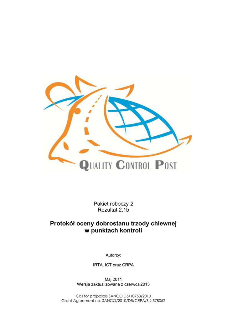 Pakiet roboczy 2 Rezultat 2.1b Protokół oceny dobrostanu trzody chlewnej w punktach kontroli Autorzy: IRTA, ICT oraz CRPA Maj 2011 Wersja zaktualizowana z czerwca 2013 Call for proposals SANCO D5/10753/2010 Grant Agreement no. SANCO/2010/D5/CRPA/SI2.578062 Kolofon Ten raport jest oficjalnym rezultatem projektu Quality Control Post. Projekt “Odnowienie i promowanie punktów kontroli wysokiej jakości w Unii europejskiej”(“Renovation and promoting high quality control posts in the European Union”) przewiduje znaczącą poprawę wyposażenia oraz zarządzania w 12 punktach kontroli (CPs) położonych na przecięciach ważnych dróg transportu długodystansowego zwierząt na terenie EU. Badania, które doprowadziły do uzyskania zamierzonych rezultatów, uzyskały finansowanie w wyniku wezwania Komisji Europejskiej do składania wniosków SANCO D5/10753/2010, Umowa Grantu numer SANCO/2010/D5/CRPA/SI2.578062 Project Office Quality Control Post Centro Ricerche Produzioni Animali Spa Corso Garibaldi 42 IT-42121 Reggio Emilia Italy Phone +39 0522 436999 Fax +39 0522 435142 e-mail [email protected] Tekst tego raportu reprezentuje punkt widzenia autorów i nie reprezentuje stanowiska Komisji Europejskiej, która nie odpowiada za wykorzystanie informacji zawartych w tekście. Podziękowania Patrick Chevillon (Institut du Porc, France); Kees De Roest (Centro Ricerche Produzioni Animali, Italy); Monika Gebska (Warsaw University of Life Sciences, Faculty of Economic Sciences, Poland); Luc Mirabito (Institut de l’Elevage, France) Wijbrand Ouweltjes (WUR,Wageningen,The Netherlands); Marco Ruis (WUR,Wageningen,The Netherlands); Eva Sossidou National Agricultural Research Foundation, Greece); Karin Steinkamp (Federal Research Institute of Animal Health, Germany), Béatrice Mounaix (Institut de l’Elevage, France) Eva Mainau (IRTA, Spain). List of co-authors SP: Institut de Recerca i Tecnologia Agroalimentàries (IRTA) Antonio Velarde; Antoni Dalmau; Cecilia Pedernera IT: Instituto “G. Caporale” Teramo-ICT Paolo Dalla Villa; Bernardo Catanese; Elisa Di Fede; Stefano Messori IT: Centro Ricerche Produzioni Animali (CRPA) Paolo Ferrari, Paolo Rossi Tekst tego raportu reprezentuje punkt widzenia autorów i nie reprezentuje stanowiska Komisji Europejskiej, która nie odpowiada za wykorzystanie informacji zawartych w tekście. 3 3 Spis treści Kolofon ................................................................................................................. 2 1. WPROWADZENIE ...................................................................................................... 6 2. METODOLOGIA.......................................................................................................... 7 3. KOLEJNOŚĆ DZIAŁAŃ ZGODNIE Z PROTOKOŁEM ............................................... 8 4. REGULACJE PRAWNE .............................................................................................. 9 5. OCENA DOBROSTANU NA PODSTAWIE OBSERWACJI ZWIERZĄT ..................... 9 6. DOBÓR PRÓBY........................................................................................................ 11 7. POMIARY PODCZAS PRZYBYCIA I ROZŁADUNKU .............................................. 12 7.1A.1 ZASADA DOBROSTANU: właściwy system utrzymania .................................... 12 7.1A.1.1 Swoboda poruszania się .............................................................................. 12 7.1C.2 ZASADA DOBROSTANU: dobre zdrowie .......................................................... 12 7.1C.2.1 Brak chorób .................................................................................................... 12 7.1A.3 ZASADA DOBROSTANU: przejawianie zachowania właściwego dla gatunku ... 13 7.1A.3.1 Pozytywny stan emocjonalny ....................................................................... 13 8. OCENA DOBROSTANU W KOJCACH .................................................................... 14 METODOLOGIA ........................................................................................................... 14 8.1 A.1 ZASADA DOBROSTANU: właściwy system utrzymania ................................... 14 8.1A.1.1 Komfort wypoczynku.................................................................................... 14 8.1A.1.2 Komfort termiczny ........................................................................................ 14 8.1A.2 ZASADA DOBROSTANU: dobre zdrowie .......................................................... 15 8.1A.2.1 Brak urazów ................................................................................................ 15 8.1A.2.2 Brak chorób ................................................................................................. 16 8.1A.3 ZASADA DOBROSTANU: przejawianie zachowań właściwych dla gatunku ...... 17 8.1B.3.1 zachowania społeczne ................................................................................. 17 OCENA DOBROSTANU PODCZAS ZAŁADUNKU .................................................. 19 9. Korytarz ........................................................................................................................ 19 9.1B.1 ZASADA DOBROSTANU: przejawianie zachowań właściwych dla gatunku ...... 19 9.1B.1.1 Dobra relacja człowiek - zwierzę .................................................................. 19 9.1B.2 ZASADA DOBROSTANU : dobre zdrowie ........................................................ 19 9.1B.1.1 Brak chorób ................................................................................................. 19 Rampa .......................................................................................................................... 20 9.1C.1 ZASADA DOBROSTANU: właściwy system utrzymania .................................... 20 9.1C.1.1 Swoboda poruszania się ............................................................................. 20 9.1C.2 ZASADA DOBROSTANU