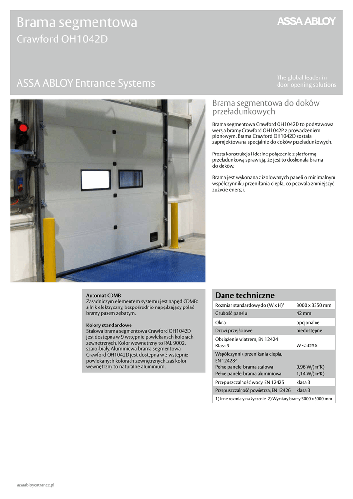 Brama segmentowa Crawford OH1042D The global leader in door opening solutions ASSA ABLOY Entrance Systems Brama segmentowa do doków przeładunkowych Brama segmentowa Crawford OH1042D to podstawowa wersja bramy Crawford OH1042P z prowadzeniem pionowym. Brama Crawford OH1042D została zaprojektowana specjalnie do doków przeładunkowych. Prosta konstrukcja i idealne połączenie z platformą przeładunkową sprawiają, że jest to doskonała brama do doków. Brama jest wykonana z izolowanych paneli o minimalnym współczynniku przenikania ciepła, co pozwala zmniejszyć zużycie energii. Automat CDMB Zasadniczym elementem systemu jest napęd CDMB: silnik elektryczny, bezpośrednio napędzający połać bramy pasem zębatym. Kolory standardowe Stalowa brama segmentowa Crawford OH1042D jest dostępna w 9 wstępnie powlekanych kolorach zewnętrznych. Kolor wewnętrzny to RAL 9002, szaro-biały. Aluminiowa brama segmentowa Crawford OH1042D jest dostępna w 3 wstępnie powlekanych kolorach zewnętrznych, zaś kolor wewnętrzny to naturalne aluminium. Dane techniczne Rozmiar standardowy do (W x H)1 3000 x 3350 mm Grubość panelu 42 mm Okna opcjonalne Drzwi przejściowe niedostępne Obciążenie wiatrem, EN 12424 Klasa 3 W < 4250 Współczynnik przenikania ciepła, EN 124282 Pełne panele, brama stalowa Pełne panele, brama aluminiowa 0,96 W/(m2K) 1,14 W/(m2K) Przepuszczalność wody, EN 12425 klasa 3 Przepuszczalność powietrza, EN 12426 klasa 3 1) Inne rozmiary na życzenie 2) Wymiary bramy 5000 x 5000 mm assaabloyentrance.pl Rodzaje paneli Okna Dostępne są różne modele okien, wykonane z różnych materiałów, z ramami antywłamaniowymi. Na zewnątrz Q2.0-2015 Wewnątrz Kompletny zamek z uchwytem i bębenkiem po obu stronach albo tylko wewnątrz. Każdą bramę wyposażoną w zamek elektryczny można zaryglować zdalnie przełącznikiem lub za pomocą zintegrowanego komputera. Tryb ryglowania może być monitorowany. © ASSA ABLOY Entrance Systems AB Opcje dostępu i automatyki Standardowe kolory zewnętrzne Dane techniczne mogą ulec zmianie bez uprzedniego powiadomienia. Specyfikacja wymiarów Stal Aluminium Żółty RAL 1021 Niebieski RAL 5010 Szary antracytowy RAL 7016 Jasnoszary RAL 9006 Biały RAL 9010 Czerwony RAL 3002 Zielony RAL 6005 Szaro-biały RAL 9002 Szary aluminiowy Na RAL 9007 życzenie Inne kolory Niebieski RAL 5010 Biały RAL 9010 Aluminium ASSA ABLOY, Besam, Crawford, Megadoor i Albany, jako słowa i logotypy, to przykłady znaków towarowych, będących własnością ASSA ABLOY Entrance Systems lub firm należących do ASSA ABLOY Group. Na życzenie Inne kolory assaabloyentrance.pl