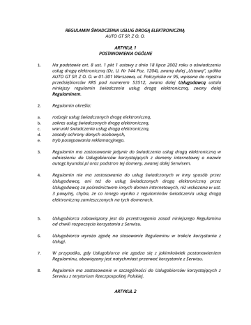 REGULAMIN ŚWIADCZENIA USŁUG DROGĄ ELEKTRONICZNĄ AUTO GT SP. Z O. O. ARTYKUŁ 1 POSTANOWIENIA OGÓLNE 1. Na podstawie art. 8 ust. 1 pkt 1 ustawy z dnia 18 lipca 2002 roku o oświadczeniu usług drogą elektroniczną (Dz. U. Nr 144 Poz. 1204), zwaną dalej „Ustawą”, spółka AUTO GT SP. Z O. O. w 01-301 Warszawa, ul. Połczyńska nr 95, wpisana do rejestru przedsiębiorców KRS pod numerem 53512, zwana dalej Usługodawcą ustala niniejszy regulamin świadczenia usług drogą elektroniczną, zwany dalej Regulaminem. 2. Regulamin określa: a. b. c. d. e. rodzaje usług świadczonych drogę elektroniczną, zakres usług świadczonych drogą elektroniczną, warunki świadczenia usług drogą elektroniczną, zasady ochrony danych osobowych, tryb postępowania reklamacyjnego. 3. Regulamin ma zastosowanie jedynie do świadczenia usług drogą elektroniczną w odniesieniu do Usługobiorców korzystających z domeny internetowej o nazwie autogt.hyundai.pl oraz podstron tej domeny, zwanej dalej Serwisem. 4. Regulamin nie ma zastosowania do usług świadczonych w inny sposób przez Usługodawcę, ani też do usług świadczonych drogą elektroniczną przez Usługodawcę za pośrednictwem innych domen internetowych, niż wskazana w ust. 3 powyżej, chyba, że co innego wynika z regulaminów świadczenia usług drogą elektroniczną zamieszczonych na tych domenach. 5. Usługobiorca zobowiązany jest do przestrzegania zasad niniejszego Regulaminu od chwili rozpoczęcia korzystania z Serwisu. 6. Usługobiorca wyraża zgodę na stosowanie Regulaminu w trakcie korzystania z Usługi. 7. W przypadku, gdy Usługobiorca nie zgadza się z jakimkolwiek postanowieniem Regulaminu, obowiązany jest natychmiast przerwać korzystanie z Serwisu. 8. Regulamin ma zastosowanie w szczególności do Usługobiorców korzystających z Serwisu z terytorium Rzeczpospolitej Polskiej. ARTYKUŁ 2 DEFINICJE Użyte w Regulaminie zwroty oznaczają: 1. Usługodawca – spółka działająca pod firmą AUTO GT SP. Z O. O. z siedzibą w Warszawa, wpisana do rejestru przedsiębiorców Krajowego Rejestru Sądowego pod numerem 53512, świadcząca usługi drogą elektroniczną z wykorzystaniem Serwisu. 2. Usługobiorca – każda osoba fizyczna, prawna bądź jednostka organizacyjna nieposiadającą osobowości prawnej, która korzysta z usługi świadczonej przez Usługodawcę z wykorzystaniem Serwisu. 3. Adres Poczty Elektronicznej – oznaczenie systemu teleinformatycznego umożliwiającego porozumiewanie się za pomocą poczty elektronicznej (email), 4. System Teleinformatyczny – zespół współpracujących ze sobą urządzeń informatycznych i oprogramowania, zapewniający przetwarzanie i przechowywanie, także wysyłanie i odbieranie danych przez sieci telekomunikacyjne za pomocą właściwego dla danego rodzaju sieci urządzenia końcowego w rozumieniu przepisów Prawa telekomunikacyjnego. 5. Usługa – usługa świadczona drogą elektroniczną w rozumieniu przepisów Ustawy, przez Usługodawcę. ARTYKUŁ 3 ROZPOCZĘCIE I ZAKOŃCZENIE KORZYSTANIA Z USŁUGI 1. Usługobiorca rozpoczyna korzystanie z Usługi z chwilą rozpoczęcia odbierania danych dostarczanych przez Usługodawcę za pomocą Serwisu. 2. Natychmiast po wyświetleniu się strony głównej Serwisu na monitorze Usługobiorcy, Usługobiorca powinien zapoznać się z treścią Regulaminu, do którego dostęp możliwy jest przy użyciu odpowiedniego odnośnika (linku). 3. Usługobiorca kończy korzystanie z Usługi wraz z zakończeniem odbierania danych dostarczanych przez Usługodawcę za pomocą Serwisu, chyba, że korzysta z usługi „Zapytanie o broszurę”. 4. Usługobiorca może w każdej, dowolnie obranej przez siebie chwili zakończyć korzystanie z Usługi. ARTYKUŁ 4 RODZA JE I ZAKRES USŁUG. 1. W ramach korzystania z Serwisu Usługodawca świadczy następujące usługi: (i) Usługi Informacyjne - polegające na udostępnieniu na indywidualne żądanie Usługobiorcy danych znajdujących się w Serwisie w ten sposób, iż następuje ich wyświetlenie w formie przygotowanej przez Usługodawcę i przetworzonej przez system komputerowy Usługobiorcy, a także zapisaniu tych danych na dysku twardym lub innych nośnikach Usługobiorcy, a dotyczących w szczególności: (a) informacji o produktach, w tym modelach samochodów, wersjach wyposażania, cenach, promocjach, danych technicznych, (b) informacji o usługach serwisowych oferowanych przez Usługodawcę w miejscu prowadzenia działalności, (c) informacji o produktach finansowych i ubezpieczeniowych oferowanych nabywcom samochodów Hyundai, (d) informacji o głównych zasadach gwarancji, (e) informacji o dostępnych akcesoriach do samochodów, (f) informacji o działalności Usługodawcy, (g) informacji o dostępnych do nabycia samochodach używanych w ramach programu Hyundai i-BEST, (ii) Zapytanie o ofertę – umożliwienie nawiązania kontaktu między Usługobiorcą a Usługodawcą w celu prezentacji Usługobiorcy informacji o możliwości nabycia samochodu marki Hyundai, (iii) Jazda Testowa (Jazda Próbna) – umożliwienie nawiązania kontaktu między Usługobiorcą a Usługodawcą w celu umożliwienia obydwu tym podmiotom ustalenia czasu i miejsca odbycia przez Usługobiorcę jazdy testowej (próbnej) dostępnym samochodem marki Hyundai, (iv) Zapytanie o broszurę - udostępnienie Usługobiorcy, na jego życzenie, możliwości pobrania z Serwisu broszury (katalogu) z wykorzystaniem unikalnego linku wygenerowanego na skutek zapytania Usługobiorcy i przesłanego mu na Adres Poczty Elektronicznej. (v) Konfigurator - umożliwienie Usługobiorcy w ramach wyboru spośród dostępnych w Serwisie opcji preferowanej przez Usługobiorcę konfiguracji samochodu, w tym dobrania rodzaju silnika, wyposażenia dodatkowego, skorzystania z dostępnych akcji promocyjnych, akcesoriów, (vi) Kontakt – umożliwienie Usługobiorcy przesłania Usługodawcy wiadomości z wykorzystaniem formularza dostępnego w ramach