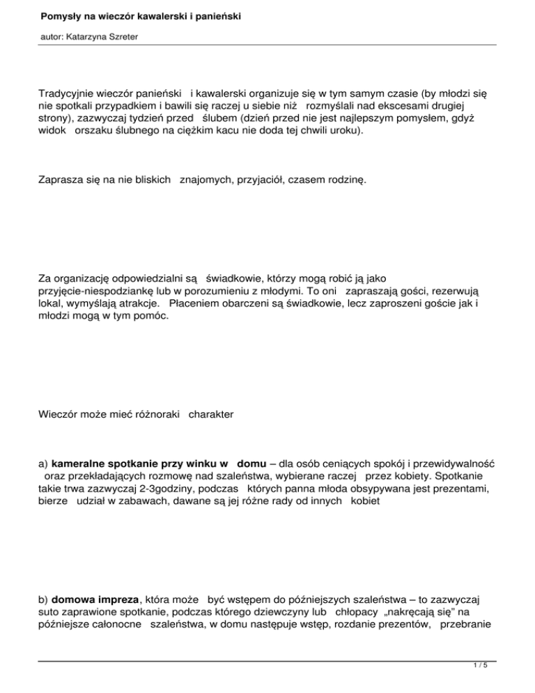 Pomysły na wieczór kawalerski i panieński autor: Katarzyna Szreter Tradycyjnie wieczór panieński i kawalerski organizuje się w tym samym czasie (by młodzi się nie spotkali przypadkiem i bawili się raczej u siebie niż rozmyślali nad ekscesami drugiej strony), zazwyczaj tydzień przed ślubem (dzień przed nie jest najlepszym pomysłem, gdyż widok orszaku ślubnego na ciężkim kacu nie doda tej chwili uroku). Zaprasza się na nie bliskich znajomych, przyjaciół, czasem rodzinę. Za organizację odpowiedzialni są świadkowie, którzy mogą robić ją jako przyjęcie-niespodziankę lub w porozumieniu z młodymi. To oni zapraszają gości, rezerwują lokal, wymyślają atrakcje. Płaceniem obarczeni są świadkowie, lecz zaproszeni goście jak i młodzi mogą w tym pomóc. Wieczór może mieć różnoraki charakter a) kameralne spotkanie przy winku w domu – dla osób ceniących spokój i przewidywalność oraz przekładających rozmowę nad szaleństwa, wybierane raczej przez kobiety. Spotkanie takie trwa zazwyczaj 2-3godziny, podczas których panna młoda obsypywana jest prezentami, bierze udział w zabawach, dawane są jej różne rady od innych kobiet b) domowa impreza, która może być wstępem do późniejszych szaleństwa – to zazwyczaj suto zaprawione spotkanie, podczas którego dziewczyny lub chłopacy „nakręcają się” na późniejsze całonocne szaleństwa, w domu następuje wstęp, rozdanie prezentów, przebranie 1/5 Pomysły na wieczór kawalerski i panieński autor: Katarzyna Szreter się w śmieszne stroje i wyjście na miasto c) szalona impreza w wynajętym lokalu – to impreza o charakterze zazwyczaj mocno pijackim, wyróżniająca się głośnością i przebraniami kobiet (lub tylko młodej), podczas której młoda bierze udział w licznych zabawach d) wypad za miasto – może przybrać postać ogniska z kiełbaskami i noclegiem w namiotach, ze śpiewem przy gitarach i opowieściami dziwnej treści, lub surwiwalowe wspólne przeżycia w skałkach, na quadach, czy spokojniej na polu golfowym. Wybierane raczej przez kawalerów. Dawniej wieczór ten był ostatnią chwilą na „wyszumienie się” i stwierdzenie że faktycznie nikogo innego nie chce się bardziej niż potencjalną żonę/męża. Młodzi przed wieczorem muszą więc ustalić, jakich granic przekraczać nie wolno oraz na co sobie pozwalają. Im dokładniej tę kwestię omówią przed zabawą, tym mniej będzie nieporozumień po niej. Są pary w których ustalają, że wszystko jest dopuszczalne i nie będzie ograniczeń, w innych ustala się całkowity zakaz szaleństw. Atrakcje wieczoru: - śmieszne przebrania – panna młoda może założyć np. czerwony welon ślubny lub opaskę z 2/5 Pomysły na wieczór kawalerski i panieński autor: Katarzyna Szreter różkami, w czym mogą towarzyszyć jej inne dziewczyny. W wersji odważniejszej można przebrać się za diabełki, aniołki lub nawet prostytutki, wszystko zależy od wyczucia i nastroju - limuzyna – może być tylko fajnym środkiem transportu jak i wyłącznym miejscem imprezy, jeśli szampan i wspólne siedzenie na ekskluzywnej kanapie Wam wystarczy - prezenty – panna młoda obdarowywana jest zazwyczaj przez każdą z obecny jakimś prezentem, zazwyczaj związanym z seksem (bielizna, gadżety, poradniki, kajdanki itp.) W wersji łagodniejszej mogą to być dekoracje domu lub niewielkie gadżety do kuchni lub dla młodej, czasem dla dziecka - striptiz – niektórzy jako główny punkt programu traktują pokaz striptizera/striptizerki. Powinno się go jednak zamawiać wyłącznie w porozumieniu z młodymi. Z samym striptizerem powinno się umówić jak długo będzie trwało show, jak daleko może się posunąć (czy dozwolone jest dotykanie, ile odzieży zostanie niezdjętej) i co będzie po striptizie. (czy striptizer ubiera się i idzie do domu, czy zabawa trwa dalej) - zabawy – tu pole do popisu mają świadkowe. Zabawy mogą być mniej lub bardziej wyszukane, oto niektóre z nich: 3/5 Pomysły na wieczór kawalerski i panieński autor: Katarzyna Szreter 1. jak dobrze znasz przyszłego męża (dla panny) – przed przyjęciem świadkowa wypytuje młodego na okoliczność różnych zdarzeń z jego życia lub ich wspólnego życia. Za każdą zgodną odpowiedź młoda dostaje punkt (albo np. ciastko) za złą może dostać karę (odebrane ciastko lub karniak) 2. jak dobrze znasz młodą (dla koleżanek) – obecne panie wyciągają karteczki i odpowiadają na pytania zadawane przez młodą lub świadkową, kto uzyska więcej punktów ten wygrywa (a kto najmniej przegrywa np. karniaka) 3. rady dla młodej – obecne kobiety opowiadają ich zdaniem najcenniejsze rady i opinie na temat mężczyzn i małżeństw. Jeśli kobiety się wstydzą można zrobić to w wersji papierowej, później młoda musi porady przeczytać na głos. Można później o nich szerzej porozmawiać. W wersji papierowej częściej porady są szczere i traktujące o seksie. 4. Przypnij mu co nieco – na namalowanym przez jedną z Was lub gotowym plakacie mężczyzny zasłonięta jest część intymna. Panna młoda dostaje do ręki ostro zakończony przedmiot (np. szpilkę, agrafkę bądź nóż) i musi z zamkniętymi oczami trafić w odpowiednie miejsce. 5. Golenie balona – na napompowany balon nakłada się piankę do golenia, panna młoda dostaje do ręki golarkę i musi tak ogolić by balon nie pękł 6. Zadania do wykonania przez młodą – młoda dostaje listę rzeczy do zrobienia, którą musi wypełnić w trakcie nocy – związane są one zazwyczaj z obcymi mężczyznami np. pocałować 5 obcych facetów, zebrać podpisy od 15, przekonać jednego, by się oświadczył, poprosić by zrobił 5 pompek itp. Mogą też być do wykonania przez młodą – wejść do fontanny, zaśpiewać na cały głos jakąś piosenkę, zatańczyć na latarni, seksownie zjeść loda na patyku itp. W wersji męskiej może to być wypicie iluś kieliszków wódki,