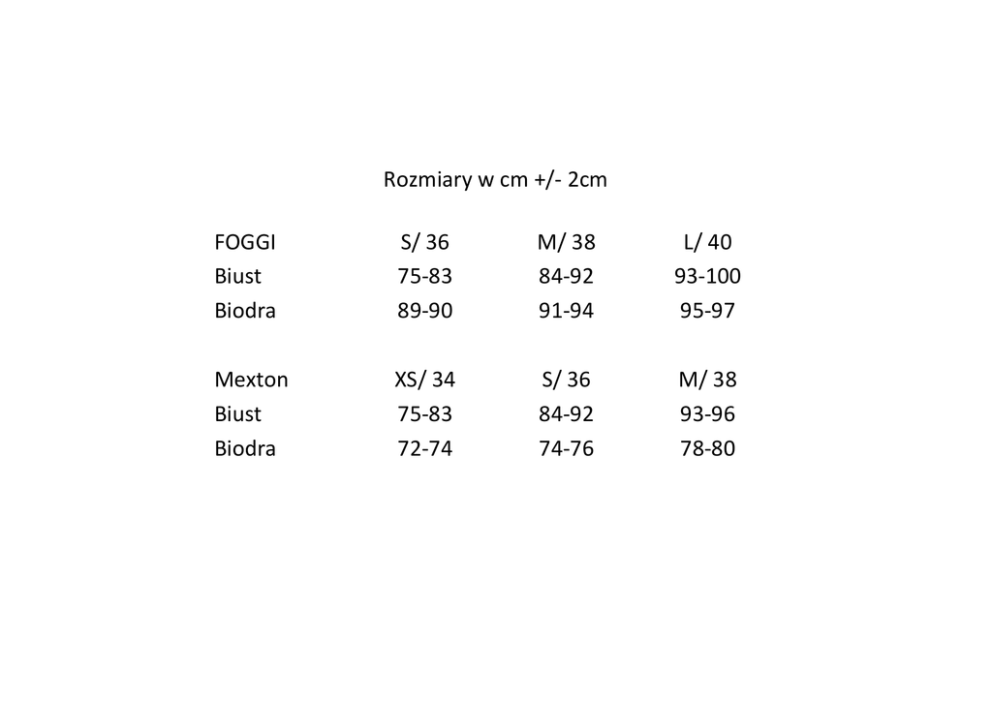 FOGGI Biust Biodra Mexton Biust Biodra Rozmiarywcm+/-2cm S/36 M/38 75-83 84-92 89-90 91-94 XS/34 S/36 75-83 84-92 72-74 74-76 L/40 93-100 95-97 M/38 93-96 78-80