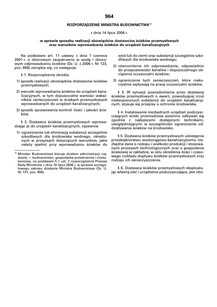 964 ROZPORZÑDZENIE MINISTRA BUDOWNICTWA1) z dnia 14 lipca 2006 r. w sprawie sposobu realizacji obowiàzków dostawców Êcieków przemys∏owych oraz warunków wprowadzania Êcieków do urzàdzeƒ kanalizacyjnych Na podstawie art. 11 ustawy z dnia 7 czerwca 2001 r. o zbiorowym zaopatrzeniu w wod´ i zbiorowym odprowadzaniu Êcieków (Dz. U. z 2006 r. Nr 123, poz. 858) zarzàdza si´, co nast´puje: § 1. Rozporzàdzenie okreÊla: wód lub do ziemi oraz substancji szczególnie szkodliwych dla Êrodowiska wodnego; 2) równomierne ich odprowadzanie, odpowiednio do przepustowoÊci kana∏ów i dopuszczalnego obcià˝enia oczyszczalni Êcieków; 1) sposób realizacji obowiàzków dostawców Êcieków przemys∏owych; 3) ograniczenie tych zanieczyszczeƒ, które niekorzystnie wp∏ywajà na prac´ oczyszczalni Êcieków. 2) warunki wprowadzania Êcieków do urzàdzeƒ kanalizacyjnych, w tym dopuszczalne wartoÊci wskaêników zanieczyszczeƒ w Êciekach przemys∏owych wprowadzanych do urzàdzeƒ kanalizacyjnych; § 3. W sytuacji powiadomienia przez dostawc´ Êcieków przemys∏owych o awarii, powodujàcej zrzut niebezpiecznych substancji do urzàdzeƒ kanalizacyjnych, stosuje si´ przepisy o ochronie Êrodowiska. 3) sposób sprawowania kontroli iloÊci i jakoÊci Êcieków. § 2. Dostawca Êcieków przemys∏owych wprowadzajàc je do urzàdzeƒ kanalizacyjnych, zapewnia: 1) ograniczenie lub eliminacj´ substancji szczególnie szkodliwych dla Êrodowiska wodnego, okreÊlonych w przepisach dotyczàcych warunków, jakie nale˝y spe∏niç przy wprowadzaniu Êcieków do ——————— 1) Minister Budownictwa kieruje dzia∏em administracji rzàdowej — budownictwo, gospodarka przestrzenna i mieszkaniowa, na podstawie § 1 ust. 2 rozporzàdzenia Prezesa Rady Ministrów z dnia 18 lipca 2006 r. w sprawie szczegó∏owego zakresu dzia∏ania Ministra Budownictwa (Dz. U. Nr 131, poz. 906). § 4. Instalowanie niezb´dnych urzàdzeƒ podczyszczajàcych Êcieki przemys∏owe powinno odbywaç si´ zgodnie z najlepszymi dost´pnymi technikami, uwzgl´dniajàcymi w szczególnoÊci ograniczenie oddzia∏ywania Êcieków na Êrodowisko. § 5. Dostawca Êcieków przemys∏owych udost´pnia przedsi´biorstwu wodociàgowo-kanalizacyjnemu niezb´dne dane o rodzaju i wielkoÊci produkcji i stosowanych procesach technologicznych oraz o gospodarce Êciekowej w zak∏adzie, w celu okreÊlenia iloÊci i czasowego rozk∏adu dop∏ywu Êcieków przemys∏owych oraz rodzaju ich zanieczyszczenia. § 6. Dostawca Êcieków przemys∏owych eksploatujàc w∏asnà sieç i urzàdzenia podczyszczajàce, jest obo- Dziennik Ustaw Nr 136 — 9657 — wiàzany post´powaç w sposób zapewniajàcy ochron´ Êrodowiska. § 7. Âcieki przemys∏owe nie mogà byç rozcieƒczane wodà w celu uzyskania dopuszczalnych wartoÊci wskaêników zanieczyszczeƒ okreÊlonych w rozporzàdzeniu. § 8. Âcieki przemys∏owe mogà byç wprowadzane do urzàdzeƒ kanalizacyjnych, je˝eli: 1) nie stanowi to zagro˝enia dla bezpieczeƒstwa i zdrowia osób obs∏ugujàcych urzàdzenia kanalizacyjne, stanu konstrukcji budowlanych i prawid∏owego dzia∏ania tych urzàdzeƒ oraz oczyszczalni Êcieków, a tak˝e dla spe∏nienia przez przedsi´biorstwo wodociàgowo-kanalizacyjne warunków pozwolenia wodnoprawnego na wprowadzanie Êcieków do wód lub do ziemi i stosowania osadów Êciekowych; 2) spe∏nione sà przez dostawc´ Êcieków przemys∏owych warunki posiadanego pozwolenia wodnoprawnego, gdy takie pozwolenie jest wymagane na podstawie przepisów Prawa wodnego; 3) temperatura tych Êcieków nie przekracza 35 °C, a odczyn pH mieÊci si´ w przedziale od 6,5 do 9,5, z wy∏àczeniem Êcieków zawierajàcych cyjanki i siarczki, dla których pH mieÊci si´ w przedziale od 8 do 10; 4) sà podatne na mechaniczno-biologiczne procesy oczyszczania. § 9. 1. Âcieki przemys∏owe zawierajàce substancje szczególnie szkodliwe dla Êrodowiska wodnego odprowadzane z okreÊlonych rodzajów produkcji do urzàdzeƒ kanalizacyjnych, z zastrze˝eniem § 15, nie powinny zawieraç tych substancji w iloÊciach przekraczajàcych dopuszczalne wartoÊci wskaêników zanieczyszczeƒ okreÊlonych w za∏àczniku nr 1 do rozporzàdzenia. 2. Dopuszczalne wartoÊci wskaêników zanieczyszczeƒ okreÊlone w za∏àczniku nr 1 do rozporzàdzenia powinny byç spe∏nione w próbce Êredniej dobowej, proporcjonalnej do przep∏ywu, zmieszanej z próbek pobranych przez dostawc´ Êcieków przemys∏owych r´cznie lub automatycznie, w odst´pach co najwy˝ej dwugodzinnych. 3. Pobór próbek Êcieków przemys∏owych zawierajàcych substancje szczególnie szkodliwe dla Êrodowiska wodnego, wymienione w za∏àczniku nr 1 do rozporzàdzenia, oraz pomiary st´˝eƒ tych substancji powinny byç wykonywane przez dostawc´ Êcieków przemys∏owych nie rzadziej ni˝ raz na kwarta∏, w miejscu reprezentatywnym dla odprowadzanych Êcieków. § 10. 1. Âcieki przemys∏owe wprowadzane do urzàdzeƒ kanalizacyjnych, zawierajàce substancje zanieczyszczajàce wymienione w za∏àczniku nr 2 do rozporzàdzenia, z zastrze˝eniem § 15, nie powinny zawieraç tych substancji w iloÊciach przekraczajàcych dopuszczalne wartoÊci wskaêników zanieczyszczeƒ okreÊlonych w tym za∏àczniku. Poz. 964 2. Dopuszczalne wartoÊci wskaêników zanieczyszczeƒ okreÊlone w za∏àczniku nr 2 do rozporzàdzenia powinny byç spe∏nione w próbce Êredniej dobowej, proporcjonalnej do przep∏ywu, zmieszanej z próbek pobranych przez dostawc´ Êcieków przemys∏owych r´cznie lub automatycznie, w odst´pach co najwy˝ej dwugodzinnych. W przypadku odczynu i temperatury wartoÊci odnoszà si´ do próbek jednorazowych pobranych losowo. 3. Pobór próbek Êcieków przemys∏owych zawierajàcych substancje zanieczyszczajàce wymienione w za∏àczniku nr 2 do rozporzàdzenia oraz pomiary st´˝eƒ tych substancji powinny byç wykonywane przez dostawc´ Êcieków przemys∏owych nie rzadziej ni