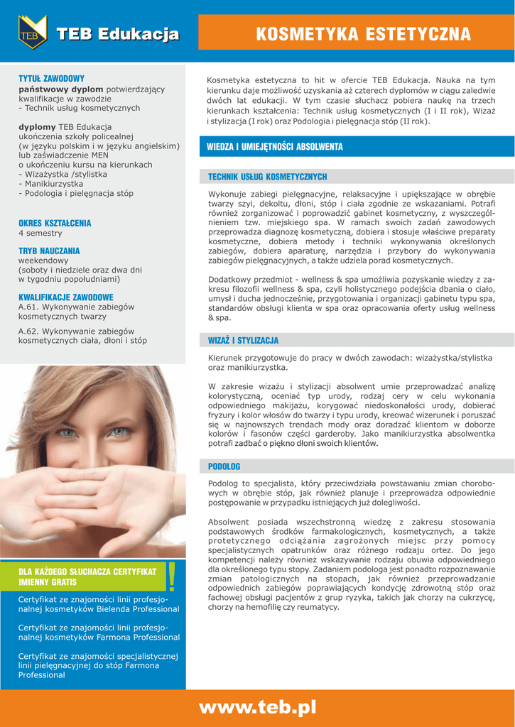 KOSMETYKA ESTETYCZNA TYTUŁ ZAWODOWY państwowy dyplom potwierdzający kwalifikacje w zawodzie - Technik usług kosmetycznych dyplomy TEB Edukacja ukończenia szkoły policealnej (w języku polskim i w języku angielskim) lub zaświadczenie MEN o ukończeniu kursu na kierunkach - Wizażystka /stylistka - Manikiurzystka - Podologia i pielęgnacja stóp OKRES KSZTAŁCENIA 4 semestry TRYB NAUCZANIA weekendowy (soboty i niedziele oraz dwa dni w tygodniu popołudniami) Kosmetyka estetyczna to hit w ofercie TEB Edukacja. Nauka na tym kierunku daje możliwość uzyskania aż czterech dyplomów w ciągu zaledwie dwóch lat edukacji. W tym czasie słuchacz pobiera naukę na trzech kierunkach kształcenia: Technik usług kosmetycznych (I i II rok), Wizaż i stylizacja (I rok) oraz Podologia i pielęgnacja stóp (II rok). WIEDZA I UMIEJĘTNOŚCI ABSOLWENTA TECHNIK USŁUG KOSMETYCZNYCH Wykonuje zabiegi pielęgnacyjne, relaksacyjne i upiększające w obrębie twarzy szyi, dekoltu, dłoni, stóp i ciała zgodnie ze wskazaniami. Potrafi również zorganizować i poprowadzić gabinet kosmetyczny, z wyszczególnieniem tzw. miejskiego spa. W ramach swoich zadań zawodowych przeprowadza diagnozę kosmetyczną, dobiera i stosuje właściwe preparaty kosmetyczne, dobiera metody i techniki wykonywania określonych zabiegów, dobiera aparaturę, narzędzia i przybory do wykonywania zabiegów pielęgnacyjnych, a także udziela porad kosmetycznych. A.61. Wykonywanie zabiegów kosmetycznych twarzy Dodatkowy przedmiot - wellness & spa umożliwia pozyskanie wiedzy z zakresu filozofii wellness & spa, czyli holistycznego podejścia dbania o ciało, umysł i ducha jednocześnie, przygotowania i organizacji gabinetu typu spa, standardów obsługi klienta w spa oraz opracowania oferty usług wellness & spa. A.62. Wykonywanie zabiegów kosmetycznych ciała, dłoni i stóp WIZAŻ I STYLIZACJA KWALIFIKACJE ZAWODOWE Kierunek przygotowuje do pracy w dwóch zawodach: wizażystka/stylistka oraz manikiurzystka. W zakresie wizażu i stylizacji absolwent umie przeprowadzać analizę kolorystyczną, oceniać typ urody, rodzaj cery w celu wykonania odpowiedniego makijażu, korygować niedoskonałości urody, dobierać fryzury i kolor włosów do twarzy i typu urody, kreować wizerunek i poruszać się w najnowszych trendach mody oraz doradzać klientom w doborze kolorów i fasonów części garderoby. Jako manikiurzystka absolwentka potrafi zadbać o piękno dłoni swoich klientów. PODOLOG Podolog to specjalista, który przeciwdziała powstawaniu zmian chorobowych w obrębie stóp, jak również planuje i przeprowadza odpowiednie postępowanie w przypadku istniejących już dolegliwości. DLA KAŻDEGO SŁUCHACZA CERTYFIKAT IMIENNY GRATIS Certyfikat ze znajomości linii profesjonalnej kosmetyków Bielenda Professional Absolwent posiada wszechstronną wiedzę z zakresu stosowania podstawowych środków farmakologicznych, kosmetycznych, a także protetycznego odciążania zagrożonych miejsc przy pomocy specjalistycznych opatrunków oraz różnego rodzaju ortez. Do jego kompetencji należy również wskazywanie rodzaju obuwia odpowiedniego dla określonego typu stopy. Zadaniem podologa jest ponadto rozpoznawanie zmian patologicznych na stopach, jak również przeprowadzanie odpowiednich zabiegów poprawiających kondycję zdrowotną stóp oraz fachowej obsługi pacjentów z grup ryzyka, takich jak chorzy na cukrzycę, chorzy na hemofilię czy reumatycy. Certyfikat ze znajomości linii profesjonalnej kosmetyków Farmona Professional Certyfikat ze znajomości specjalistycznej linii pielęgnacyjnej do stóp Farmona Professional www.teb.pl KOSMETYKA ESTETYCZNA PRZEDMIOTY KSZTAŁCENIA ZAWODOWEGO DODATKOWE KURSY TECHNIK USŁUG KOSMETYCZNYCH - Przedłużanie i zagęszczanie rzęs – 7 godz. - Kosmetyka pielęgnacyjna i upiększająca twarzy, szyi i dekoltu - Kosmetyka pielęgnacyjna i upiększająca dłoni, stóp i ciała - Zabiegi pielęgnacyjne i upiększające twarzy, szyi i dekoltu - Zabiegi pielęgnacyjne i upiększające dłoni, stóp i ciała - Wellness & SPA - Podstawy anatomiczno-dermatologiczne w kosmetyce - Język angielski w kosmetyce - Manicure hybrydowy – 5 godz. - Masaż gorącymi kamieniami – 10 godz. - Drenaż limfatyczny – 40 godz. - Masażu bańką chińską – 10 godz. - Trwała na rzęsy – 5 godz. - Henna i regulacja brwi – pielęgnacja i korekta oprawy oka – 8 godz. PERSPEKTYWY ZATRUDNIENIA - Gabinety kosmetyczne, salony urody - Gabinety odnowy biologicznej, gabinety masażu WIZAŻ I STYLIZACJA - Podstawy kosmetyki - Podstawy makijażu - Psychologia zawodu z komunikacją interpersonalną - Elementy makijażu stylizowanego - Analiza kolorystyczna - Stylizacja fryzur - Stylizacja ubioru - Kreowanie wizerunku - Ośrodki spa i wellness, centra fitness - Agencje modelek, agencje reklamowe, teatr – jako wizażysta - Firmy kosmetyczne jako przedstawiciele handlowi oraz szkoleniowcy, drogerie, sklepy kosmetyczne - Sanatoria, domy opieki społecznej i hospicja - Placówki oświatowe (przyszkolne i międzyszkolne ośrodki gimnastyki korekcyjnej) - Gabinety stopy cukrzycowej i trudno gojących się ran, gabinety podologiczne, gabinety pedicure - Fryzjerstwo artystyczne - Przychodnie specjalistyczne, poradnie i gabinety rehabilitacyjne, gabinety terapii manualnej i usprawniania - Fotografia i kreowanie portfolio - Pracownie zaopatrzenia ortopedycznego - Technika wykonania makijażu - Własna działalność gospodarcza - Technika zdobienia paznokci - Metodyka zabiegów pielęgnacyjnych dłoni i paznokci PAKIET KORZYŚCI EDU BOX, CZYLI DLACZEGO WARTO UCZYĆ SIĘ U NAS! Cykl kształcenia zakończony egzaminem przeprowadzanym w szkole w ramach którego słuchaczki wykonują kompleksową stylizację. - własne e-podręczniki - e-learning - Office 365 PODOLOGIA I PIELĘGNACJA STÓP - praktyczna nauka zawodu - Anatomia i fizjologia człowieka kończyn dolnych - wykwalifikowani nauczyciele-praktycy - certyfikaty i referenc