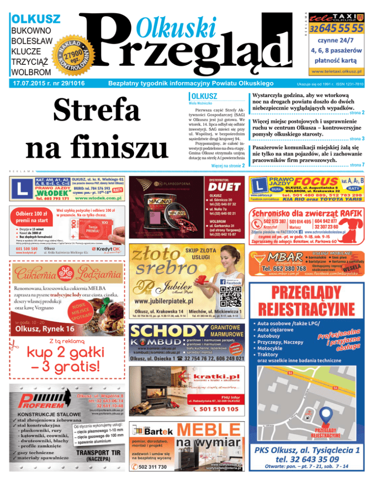 BUKOWNO BOLESŁAW KLUCZE TRZYCIĄŻ WOLBROM Przegl¹d 17.07.2015 r. nr 29/1016 Olkuski Bezpłatny tygodnik informacyjny Powiatu Olkuskiego Strefa na finiszu R E K L A M A # Z tą reklamą kup 2 gałki – 3 gratis! olkusz Wiola Woźniczko Pierwsza część Strefy Aktywności Gospodarczej (SAG) w Olkuszu jest już gotowa. We wtorek, 14. lipca odbył się odbiór inwestycji. SAG mieści się przy ul. Wspólnej, w bezpośrednim sąsiedztwie drogi krajowej 94. Przypomnijmy, że całość inwestycji podzielono na dwa etapy. Gmina Olkusz otrzymała unijną dotację na strefę A ( powierzchnia Więcej na stronie 2 R E K L A M A OLKUSZ Ukazuje się od 1991 r. ISSN 1231-7810 Wystarczyła godzina, aby we wtorkową noc na drogach powiatu doszło do dwóch niebezpiecznie wyglądających wypadków. strona 2 Więcej miejsc postojowych i usprawnienie ruchu w centrum Olkusza – kontrowersyjne pomysły olkuskiego starosty. strona 3 Pasażerowie komunikacji miejskiej żalą się nie tylko na stan pojazdów, ale i zachowanie pracowników firm przewozowych. strona 7 2 | 17 lipca 2016 | Przegląd Olkuski www.przeglad.olkuski.pl Niebezpieczny wtorek na drogach Ciąg dalszy ze strony 1 28 ha) w wysokości 6 mln 658 tys. złotych przy wartości przedsięwzięcia w tej strefie na poziomie 8 mln 323 tys. złotych. Na około 16 ha działa tam jedenaście firm, a wolne nieruchomości stanowią około 8,9 ha. Pozostałe grunty zajmują tereny komunikacyjne. W listopadzie 2013 r. ówczesny burmistrz Dariusz Rzepka mówił, że „(…) strefa A to zasadniczy etap, w którym wybudujemy infrastrukturę: drogi, sieć kanalizacyjną, oświetlenie. To nas przygotuje do rozszerzenia terenów przemysłowych na strefę B, która sięgnie do linii kolejowej, co powinno otworzyć nowe możliwości logistyczne. Mamy nadzieję, że drugi etap zostanie zakończony do 2018 roku. Wówczas całość terenów inwestycyjnych wyniesie 40 ha”. Obecne władze miasta zapewniają, że trwają przygotowania do poszerzenia SAG - u o Strefę B. Najpierw jednak należy uporać się z dość żmudną procedurą regulacji stanu prawnego gruntów, które mogłyby zostać – w sąsiedztwie Strefy A – udostępnione pod inwestycje. Czy potencjalni inwestorzy wykazują zainteresowanie działkami w Strefie? Na etapie podpisywania umowy na dofinansowanie w listopadzie 2013 roku, w firmach działających w strefie A było zatrudnionych 370 osób. Wówczas szacowano, że po powstaniu Strefy zatrudnienie ulegnie podwojeniu. Jak olkusz, KLUCZE Piotr Kubiczek, fot. KPP Olkusz gmina zamierza pozyskać przedsiębiorców, którzy stworzą nowe miejsca pracy? - Na chwilę obecną zainteresowanie terenami Strefy A jest umiarkowane, jednak chcemy diametralnie zmienić podejście do promocji terenów inwestycyjnych. Planujemy m. in. utworzyć specjalny serwis internetowy, którego celem będzie informowanie o dostępnych w Gminie Olkusz gruntach, wskazywanie odpowiednich osób i instytucji niezbędnych do załatwienia spraw związanych z działalnością gospodarczą itp. Ponadto, w Urzędzie zostanie wskazana osoba, która będzie się zajmować przede wszystkim promocją terenów inwestycyjnych Gminy Olkusz, popularyzacją przyjmo- wanych przez Burmistrza i Radę Miejską rozwiązań ułatwiających prowadzenie działalności oraz bieżącą obsługą przedsiębiorców, poprzez stałą pomoc w załatwianiu spraw. Promocja olkuskiego potencjału inwestycyjnego będzie również ważnym zadaniem dla Rady Gospodarczej, powołanej przy Burmistrzu Miasta i Gminy Olkusz, w skład której wchodzą przedstawiciele przedsiębiorców. W Radzie reprezentowany jest również Olkuski Oddział Izby Przemysłowo-Handlowej w Krakowie. – odpowiada rzecznik prasowy magistratu Michał Latos. Miasto chce promować nie tylko tereny inwestycyjne, ale również przyjmowane rozwiązania, wychodzące naprzeciw oczekiwaniom przedsiębior- Wystarczyła godzina, aby we wtorkową noc na drogach powiatu doszło do dwóch niebezpiecznie wyglądających wypadków. W Olkuszu z drogi wypadło cinquecento, natomiast w Kluczach 44-latek najechał na leżącego na drodze pijanego mężczyznę. Skończyło się jedynie na strachu i wizytach w szpitalu. ców. Chodzi przede wszystkim o zwolnienia z podatku od nieruchomości dla przedsiębiorców Najpierw, przy strugach padazwiększających zatrudnienie czy jącego deszczu (około godz. 22:20) obniżenie podatku od środków 30-letni olkuszanin na ul. Mazaniec transportowych, który, zwłaszcza dla posiadaczy samochodów spełniających normę EURO 4 jest najniższy w powiecie. - Chcemy jak najszerzej pokazywać rosnący potencjał gospodarczy Gminy Olkusz. Nowi przedsiębiorcy nie przyjdą do nas, jeśli najpierw my nie wyjdziemy do nich, przygotowując dobrą ofertę i w atrakcyjny sposób ją prezentując - mówi burmistrz Roman Piaśnik. stracił panowanie nad kierownicą swojego cinquecento, zjechał z drogi i uderzył w drzewo. 27-letni pasażer fiata z obrażeniami ciała został odwieziony do olkuskiej lecznicy. Kierujący samochodem był trzeźwy. Na miejscu zdarzenia pojawił się policyjny technik, który zabezpieczył ślady, zrobił zdjęcia i wykonał szkic sytuacyjny. Godzinę później w Kluczach na ul. Górnej, 44-letni mieszkaniec Klucz najechał na leżącego na jezdni mężczyznę. Potrącony 22-latek miał w swoim organizmie 3,3 promila alkoholu. Z urazem nogi trafił do szpitala. Policjanci wyjaśniają szczegółowe przyczyny i okoliczności tego zdarzenia. Czy Strefa okaże się atrakcyjnym miejscem dla przedsiębiorców? Zachęcamy do dyskusji na www.pzreglad.olkuski.pl! R E K L A M A WIDOCZNIE WIĘCEJ W PROMOCJI! KUP DOWOLNE OKNO Z ROLETĄ I ODBIERZ RABAT *SZCZEGÓŁY W SALONACH SPRZEDAŻY WWW.OKNOPLAST.COM.PL PARTNER HANDLOWY: WAMAR OLKUSZ UL. KRÓLA KAZIMIERZA WIELKIEGO 46, TEL. 32 645 02 36 [email protected] * Przegląd Olkuski | 17 lipca 2016 | 3 www.przeglad.olkuski.pl Uwaga objazd! Starosta kontra SPP, czyli drog