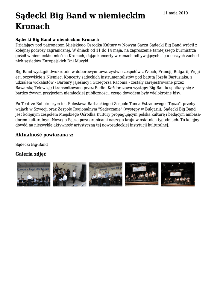 Sądecki Big Band w niemieckim Kronach 11 maja 2010 Sądecki Big Band w niemieckim Kronach Działający pod patronatem Miejskiego Ośrodka Kultury w Nowym Sączu Sądecki Big Band wrócił z kolejnej podróży zagranicznej. W dniach od 11 do 14 maja, na zaproszenie tamtejszego burmistrza gościł w niemieckim mieście Kronach, dając koncerty w ramach odbywających się u naszych zachodnich sąsiadów Europejskich Dni Muzyki. Big Band wystąpił dwukrotnie w doborowym towarzystwie zespołów z Włoch, Francji, Bułgarii, Węgier i oczywiście z Niemiec. Koncerty sądeckich instrumentalistów pod batutą Józefa Bartusiaka, z udziałem wokalistów - Barbary Jajeśnicy i Grzegorza Raconia - zostały zarejestrowane przez Bawarską Telewizję i transmitowane przez Radio. Każdorazowo występy Big Bandu spotkały się z bardzo żywym przyjęciem niemieckiej publiczności, czego dowodem były wielokrotne bisy. Po Teatrze Robotniczym im. Bolesława Barbackiego i Zespole Tańca Estradowego "Tęcza", przebywająch w Szwecji oraz Zespole Regionalnym "Sądeczanie" (występy w Bułgarii), Sądecki Big Band jest kolejnym zespołem Miejskiego Ośrodka Kultury propagującym polską kulturę i będącym ambasadorem kulturalnym Nowego Sącza poza granicami naszego kraju w ostatnich tygodniach. To kolejny dowód na niezwykłą aktywność artystyczną tej nowosądeckiej instytucji kulturalnej. Aktualność powiązana z: Sądecki Big-Band Galeria zdjęć