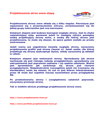 Projektowanie stron www etapy Projektowanie strony www składa się z kilku etapów. Pierwszym jest zapoznanie się z przeznaczeniem witryny, zorientowaniem się do jakiej grupy internautów jest ona kierowana. Kolejnym etapem jest budowa koncepcji wyglądu strony. Jest to chyba najważniejszy etap, ponieważ jeżeli tu nastąpią różnice pomiędzy osobą projektującą stronę www, a osobą dla której strona jest projektowana, to może się okazać, że sporo godzin zostało po prostu zmarnowane. Jeżeli mamy już uzgodniona kwestię wyglądu strony, zaczynamy projektowanie grafiki pod stronę (layout u). Jeżeli osoba, dla której projektuje się stronę zaakceptuje layout, wtedy zaczynamy ją składać w całość. Kolejnym etapem jest testowanie strony. Sprawdzamy jak strona zachowuje się pod różnego rodzaju przeglądarkami, sprawdzamy czy oskryptowanie jest poprawnie napisane i czy spełnia założenia. Ważne jest sprawdzenie jak zachowuje się strona pod róznymi przeglądarkami. Niejednokrotnie (szczególnie jeżeli nie trzymamy się standardów) może się okazać, że coś co jest dobrze interpretowane przez IE może być zupełnie inaczej wyswietlane przez przeglądarkę NS. Po przetestowaniu strony i zaczynamy promocje strony. uwzględnieniu ostatnich poprawek, Tak w wielkim skrócie przebiega projektowanie strony www. http://www.projektowanie-www.pl http://www.portfolio.projektowanie-www.pl