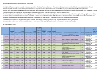 Program Erasmus Plus 2014/2015.Wyjazd na praktykę. Komisja Kwalifikacyjna przyznała prawo do wyjazdu ze stypendium z funduszy Programu Erasmus + 47 studentom. 2 osoby nie otrzymały kwalifikacji z powodu braku Letter of Intent. 29 osób otrzymało prawo do wyjazdu bez stypendium z funduszy Programu Erasmus + (Lista rezerwowa). Uniwersytet Medyczny wystąpił do Agencji Narodowej Programu Erasmus Plus z wnioskiem o dodatkowe fundusze na stypendium. Jeśli Uniwersytet Medyczny otrzyma dodatkowe fundusze, stypendia otrzymają kolejni studenci z listy rezerwowej. Decyzja Agencji Narodowej Programu Erasmus +o ew. przyznaniu dodatkowej subwencji na stypendia będzie znana do końca maja 2015 roku. Formularze zgłoszeniowe osób, które nie otrzymają stypendium z ew. dodatkowych funduszy zostaną skierowane do rozpatrzenia na posiedzeniu Komisji Kwalifikacyjnej 10 czerwca 2015, na którym będą przyznawane stypendia na wyjazd na praktykę w ramach roku akademickiego 2015/2016 (Wyjazd na praktykę w okresie od czerwca 2015 roku do 30 września 2016 roku. Wystapiło kilka przypadków jednakowej punktacji dla 2 osób. Zgodnie z pkt. 5 "Zasad udziału w Programie ERASMUS + na Uniwersytecie Medycznym w roku akademickim 2014/2015. Wyjazdy studentów na praktykę" w przypadku uzyskania jednakowej liczby punktów o kolejności na liście kandydatów decyduje wyższa średnia ocen. Jeśli średnia jest identyczna o wyborze kandydata decydują kryteria dodatkowe i ostatecznie komisja kwalifikacyjna. WYNIKI KWALIFIKACJI LP Numer indeksu 1 2 3 101118 Kierunek /rok studiów Lek V 41/NDS/2011/Z NoZdIVSD 101027 Lek V E.Czynny udział w F. kongresach działalność A.Ocena D.Prace , naukowa w Ocena język język obcy B.Średni C.publika nagrodzo konferencj kole obcy x 1,5 a cje ne ach naukowym G.Udział Punktacja po raz 1- A+B+C+D wnioskowany szy +E+F+G okres pobytu Instytucja, w której będzie odbywana praktyka letter of Intent 3+ dst+ (A) 5,25 4,48 0,00 8,25 5,55 0,50 1,00 25,03 2 University Hospitals Southampton, Wielka Brytania ok. 3.0 dst(A) 4,50 5,00 5,05 0,00 5,05 0,00 1,00 20,60 2 Medical University of Innsbruck, Austria ok. 5 bdb (I) 7,50 4,56 0,00 2,50 3,00 0,50 0,00 18,06 2 University of Cagliari, Włochy ok. NoZdIIISD 5 bdb (A) 7,50 5,00 2,80 0,00 1,00 0,00 1,00 17,30 2 91890 Lek V 5 bdb (A) 7,50 4,69 0,00 2,00 1,50 0,50 1,00 17,19 2 6 101025 Lek V 4,5+ db+(A) 6,75 4,81 0,00 2,00 2,00 0,50 1,00 17,06 2 7 101016059 W-Lek V 5 bdb (I) 7,50 4,09 0,00 1,50 3,75 0,00 0,00 16,84 2 8 91904 Lek V 4,0 db (A) 6,00 4,67 1,00 1,50 2,00 0,50 0,00 15,67 2 9 100924 Lek V 5 bdb (H) 7,50 4,62 0,00 1,50 1,50 0,50 0,00 15,62 2 Wesfalian Wilhelms University of Munster, Niemcy Hospital General Universitario De Alicante,Hiszpania Hospital General Universitario De Alicante,Hiszpania Univeristy Hospital Policlinico San Mateo, Pavia, Włochy Hospital General Universitario De Alicante, Hiszpania Hospital General Universitario De Alicante,Hiszpania 10 101015 Lek V 5 bdb (A) 7,50 4,67 0,00 0,00 2,50 0,50 0,00 15,17 2 Royal Brompton Hospital, UK ok. 11 110183 Lek IV 4,5+ db+(N) 6,75 4,38 0,00 0,75 1,50 0,50 1,00 14,88 2 Medizinische Hochschule Hannover, Niemcy ok. 12 101603 Biotech II 2 4,5+ db+(A) 6,75 4 2 0,00 0,5 0,5 1,00 14,75 2 University de Rouen, Francja ok. 13 102517 Lek IV 5 bdb+(F) 8,25 4,61 0,00 0,00 0,00 0,5 1,00 14,36 2 Universite de Nice, Francja ok. 4 12/SSD/2012 5 ok. ok. ok. ok. ok. ok. DECYZJA Komisji Kwalifikacyjnej kwalifikacja ze stypendium kwalifikacja ze stypendium kwalifikacja ze stypendium kwalifikacja ze stypendium kwalifikacja ze stypendium kwalifikacja ze stypendium kwalifikacja ze stypendium kwalifikacja ze stypendium kwalifikacja ze stypendium kwalifikacja ze stypendium kwalifikacja ze stypendium kwalifikacja ze stypendium kwalifikacja ze stypendium Kwota stypendi um w Euro 1200 1200 1200 1000 1000 1000 1200 1000 1000 1200 1000 1200 1200 14 302016741 Lek V 5 bdb (N) 7,50 4,3 0,00 0,00 1,00 0,50 1,00 14,30 2 Technische Universitat Munchen, Niemcy ok. 15 120214 W-Lek V 4,0 db (N) 6,00 4,2 0,00 1,00 1,50 0,50 1,00 14,20 2 Klinikum Augsburg, Augsburg, Niemcy ok. 16 101009 Lek V 5 bdb (N) 7,50 4,69 0,00 0,00 1,50 0,50 0,00 14,19 2 ok. 4 db (A) 6,00 4,92 0,2 0,00 1,50 0,50 1,00 14,12 2 Klinikum Friedrichshafen, Niemcy University of Rijeka, Medical Faculty, Chorwacja ok. 17 201116456 W-Lek VI 18 101102 Lek V 5 bdb (N) 7,50 4,56 0,00 0,00 1,50 0,50 0,00 14,06 2 19 91311 Lek V 3+ dst+ (A) 5,25 4,31 1,00 1,50 1,50 0,50 0,00 14,06 2 5,0 Bdb (A) 7,50 4,35 0,30 0,50 0,75 0,50 0,00 13,90 2 Klinikum Friedrichshafen, Niemcy Hospital General Universitario De Alicante,Hiszpania JSC Limedika, Ramucial, Kaunas region, Lithuania UZA Universitair Ziekenhuis, Antwerpen, Belgia 20 52/SSD/2014 Farm SD I 21 100036 W-Lek IV 22 100975 23 90492 4,5+ db+(A) 6,75 4,15 0,00 1,00 1,50 0,50 0 13,90 2 Lek V 4,0 db (A) 6,00 4,31 0,00 1,00 2 0,50 0 13,81 3 W-Lek VI 3+ dst+ (A) 5,25 4,83 0,20 0,00 2,00 0,50 1,00 13,78 2 Universitaatklinikum, Saarlandes, Niemcy University of Rijeka, Medical Faculty, Chorwacja ok. ok. ok. ok. ok. ok. 24 121100 Lek III 4,0 db (N) 6,00 4,22 0,00 1,00 1,00 0,50 1,00 13,72 2 University Medicine Greiswald, Niemcy ok. 25 102473 Lek IV 5 bdb+(F) 7,50 4,5 0,00 0,00 0,00 0,50 1,00 13,50 2 Universite de Nice, Francja ok. 26 120996 Lek III 5 bdb (I) 7,50 3,87 0,00 0,00 0,50 0,50 1,00 13,37 2 PoliclinicoSan Mateo, Pavia, Włochy ok. 27 102587 Lek IV 5 bdb (A) 7,50 4,32 0,00 0,00 0,00 0,50 1,00 13,32 2 ok. 28 100432 W-Lek IV 5,0 bdb (A) 7,50 4,36 0,00 0,00 0,00 0,00 1,00 12,86 2 29 102616 W-Lek IV 5 bdb (A) 7,50 4,36 0,00 0,00 0,00 0,00 1,00 12,86 2 30 121181 Lek III 4,0 db (A) 6,00 4,35 1,00 0,00 1,00 0,50 0 12,85 2 31 120103 W-Lek III 4,5+ db+(A) 6,75 4,10 0,00 0,00 0,50 0,50 1,00 12,85 2 C.H.Algarve -Unidade de Faro, Faro, Portugalia University of Rijeka, Medical Faculty, Chorwacja University of Rijeka, Medical Faculty, Chorwacja University of Rijeka, Medical Faculty, Chorwacja Hungarian Institute of Cardiolo