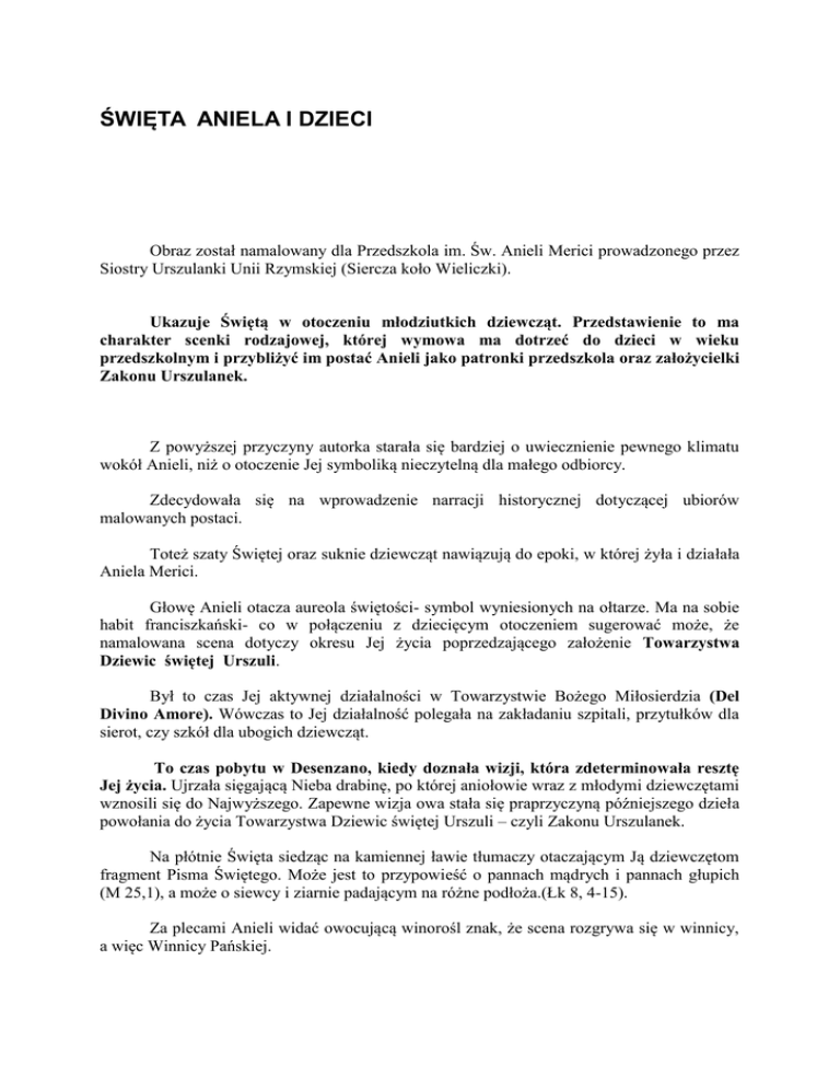 ŚWIĘTA ANIELA I DZIECI Obraz został namalowany dla Przedszkola im. Św. Anieli Merici prowadzonego przez Siostry Urszulanki Unii Rzymskiej (Siercza koło Wieliczki). Ukazuje Świętą w otoczeniu młodziutkich dziewcząt. Przedstawienie to ma charakter scenki rodzajowej, której wymowa ma dotrzeć do dzieci w wieku przedszkolnym i przybliżyć im postać Anieli jako patronki przedszkola oraz założycielki Zakonu Urszulanek. Z powyższej przyczyny autorka starała się bardziej o uwiecznienie pewnego klimatu wokół Anieli, niż o otoczenie Jej symboliką nieczytelną dla małego odbiorcy. Zdecydowała się na wprowadzenie narracji historycznej dotyczącej ubiorów malowanych postaci. Toteż szaty Świętej oraz suknie dziewcząt nawiązują do epoki, w której żyła i działała Aniela Merici. Głowę Anieli otacza aureola świętości- symbol wyniesionych na ołtarze. Ma na sobie habit franciszkański- co w połączeniu z dziecięcym otoczeniem sugerować może, że namalowana scena dotyczy okresu Jej życia poprzedzającego założenie Towarzystwa Dziewic świętej Urszuli. Był to czas Jej aktywnej działalności w Towarzystwie Bożego Miłosierdzia (Del Divino Amore). Wówczas to Jej działalność polegała na zakładaniu szpitali, przytułków dla sierot, czy szkół dla ubogich dziewcząt. To czas pobytu w Desenzano, kiedy doznała wizji, która zdeterminowała resztę Jej życia. Ujrzała sięgającą Nieba drabinę, po której aniołowie wraz z młodymi dziewczętami wznosili się do Najwyższego. Zapewne wizja owa stała się praprzyczyną późniejszego dzieła powołania do życia Towarzystwa Dziewic świętej Urszuli – czyli Zakonu Urszulanek. Na płótnie Święta siedząc na kamiennej ławie tłumaczy otaczającym Ją dziewczętom fragment Pisma Świętego. Może jest to przypowieść o pannach mądrych i pannach głupich (M 25,1), a może o siewcy i ziarnie padającym na różne podłoża.(Łk 8, 4-15). Za plecami Anieli widać owocującą winorośl znak, że scena rozgrywa się w winnicy, a więc Winnicy Pańskiej. Winnica – to złożony symbol, którego użycie w kompozycji – jako tła, było celowym zabiegiem. Życie i Dzieło Anieli Merici, która w człowieku widziała Boga, a w Bogu człowieka - było pracą robotnika w Winnicy Pańskiej. Ten symbol ma przypominać, że to Bóg jest troskliwym właścicielem winnicy, a ludzie to pojedyncze krzewy winorośli. Cała winnica symbolizuje Jezusa zjednoczonego ze swymi uczniami. Jezus mówi do nich; „ Bez mojego życia w waszych żyłach, nic nie możecie uczynić, nie możecie przeżyć niczego głębokiego i prawdziwego(...) Jesteście tylko uschłą latoroślą”. (J 15, 1-8). Troskliwa uprawa winorośli daje dorodny plon - w postaci pełnych słońca, soczystych winnych gron. Święta swoją działalnością i spuścizną (zakon urszulański i jego reguła) przysporzyła i przysparza go Bogu (właścicielowi winnicy) w obfitości. Dziewczęta – otaczające Anielę są w różnym wieku. Autorka w ten sposób podkreślić, że urszulańskie wychowanie do miłości Boga i ludzi ma swój początek już u zarania życia. Malutka dziewczynka kryjąca się za plecami starszej siostrzyczki – to alegoria współczesnych przedszkolaków. Ostrożnie, nieśmiało, ale z wielką ciekawością otwierająca się na Słowo Boże. Siostra małej - ubrana w białą sukienkę – to dziecko, które przystąpiło już do Pierwszej Komunii, to pierwszy plon winorośli. Czerwona szarfa przepasująca sukienkę dziewczynki mówi o emocjonalnym zaangażowaniu w sprawy wiary. Trzy panienki – siedząca u stóp Anieli, tuląca się do Świętej oraz umieszczona w centrum obrazu mają szatki o różnym nasyceniu czerwoną barwą. Kolor ten symbolizować ma w ich przypadku radość, miłość i wiarę, która wraz z wiekiem urszulańskich wychowanic wzrasta ( suknia stojącej, jasnowłosej dziewczynki). Najstarsza dziewczyna- to właściwie panna, o ukształtowanym wnętrzu. Dłonie złożone do modlitwy są znakiem zaawansowanej formacji duchowej. Kim zostanie w dorosłym życiu? Jej zielona suknia ( kolor wyrażający nadzieję) o tym nie przesądza. Wszystko jeszcze przed nią. Może pójdzie drogą konsekrowaną, może zostanie dobrą matką gromadki dzieci. Jedno jest pewne- droga wyznaczona przez Świętą Urszulę i Świętą Anielę założycielkę Zakonu Urszulanek jest drogą miłości prowadzącej do Zbawienia, do Boga i Życia Wiecznego. namalowała i opisała Anna Gallas- Dropińska Wieliczka/ Siercza 2017
