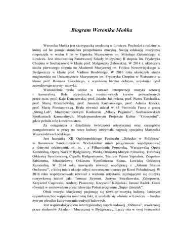 Biogram Weronika Mońka Weronika Mońka jest skrzypaczką urodzoną w Łowiczu. Pochodzi z rodziny w której od lat panuje atmosfera przepełniona muzyką. Swoją edukację muzyczną rozpoczęła w wieku 8 lat w Ognisku Muzycznym im. Mikołaja Zieleńskiego w Łowiczu. Jest absolwentką Państwowej Szkoły Muzycznej II stopnia im. Fryderyka Chopina w Sochaczewie w klasie prof. Małgorzaty Zalewskiej. W 2014 r. ukończyła studia pierwszego stopnia na Akademii Muzycznej im. Feliksa Nowowiejskiego w Bydgoszczy w klasie prof. Vadima Brodskiego. W 2016 roku ukończyła studia magisterskie na Uniwersytecie Muzycznym im. Fryderyka Chopina w Warszawie w klasie prof. Romana Lasockiego, z wynikiem bardzo dobrym, uzyskując tytuł zawodowego artysty- muzyka. Wielokrotnie brała udział w kursach interpretacji muzyki solowej i kameralnej. Była uczestniczką mistrzowskich kursów prowadzonych przez m.in. prof. Kaje Danczowską, prof. Jakuba Jakowicza, prof. Piotra Tarcholika, prof. Marię Orzechowską, prof. Janusza Kucharskiego, prof. Adama Klocka, prof. Marię Pomianowską. Brała również udział w 45 Festiwalu Fama z grupą „String.Lab”, Międzynarodowym Konkursie „Młody Paganini”, Sochaczewskich Spotkaniach Kameralnych, Międzynarodowym Projekcie Kultur ‘’Crosspoint’’, gdzie pełniła rolę koncertmistrza. Za osiągnięcia z dziedzinie twórczości artystycznej oraz szczególne zaangażowanie w pracę na rzecz kultury otrzymała nagrodę specjalną Marszałka Województwa Łódzkiego. Jest laureatką XII Ogólnopolskiego Festiwalu „Dziecko w Folklorze” w Baranowie Sandomierskim. Wielokrotnie miała przyjemność współpracować z różnymi orkiestrami, m. in. ; z Filharmonią Pomorską, Warszawską Operą Kameralną, Operą Nova w Bydgoszczy, Polską Orkiestrą Muzyki Filmowej, Toruńską Orkiestrą Symfoniczną, Capellą Bydgostiensis, Teatrem Pijana Sypialnia, Zespołem Sabionetta, Młodzieżową Orkiestra Symfoniczna Sonus, Łowicką Orkiestrą Kameralną. W 2014 roku nawiązała również współpracę z „Johann Strauss Orchestra’’, z którą miała okazje odbyć noworoczne tournee po Korei Południowej. W 2016 roku współpracowała również z wieloma artystami, zajmującymi się muzyką rozrywkową takimi jak: Tomasz Szymuś, Justyna Steczkowska, Zakopower, Krzysztof Cugowski, Andrzej Piaseczny, Krzysztof Kilijański, Janusz Radek. Grała również w emitowanym przez telewizje Polsat programie „Super dzieciak”. Obok muzyki klasycznej pasjonuję się również muzyką ludową. Istotnym czynnikiem bez wątpienia miał tutaj fakt, iż urodziła się właśnie w Łowiczu – bardzo żywym ośrodku kultywowania tradycji ludowych. Jest współzałożycielem interregionalnej kapeli ludowej „Oldnova”, stworzonej przez studentów Akademii Muzycznej w Bydgoszczy. Łączy ona w swej twórczości autentyczny folklor kilku regionów Polski: kujawsko-pomorskiego, lubelskiego, opoczyńskiego, nowosądeckiego oraz regionu łowickiego, którego jest przedstawicielką. Kapela działa od 2013 roku, ale miała przyjemność koncertować na wielu ogólnopolskich festiwalach (XXXVII Targi Kultury Ludowej Kraków 2013, Noc Kultury Lublin 2013, 50 Tydzień Kultury Beskidzkiej, Finału Roku im. Oskara Kolberga w Filharmonii Pomorskiej). Współtworzy rodzinną kapelę ludową, która uświetnia wiele imprez i uroczystości organizowanych na terenie miasta, regionu i nie tylko (Międzynarodowy Festiwal Opoczno 2011, 2015), „XVI Międzynarodowe Spotkania Rodzin Muzykujących” w Dobrym Mieście, „The World Festivals of Creativity 2009” w San Remo, „IV Smaki Ziemi Łódzkiej” Konkurs Folk-Nuta II miejsce, XIX Międzywojewódzki Przegląd Kapel Ludowych Bedlno 2009 II miejsce). Od najmłodszych lat gra w wielu zespołach i kapelach ludowych działających na terenie całej Polski; Ksinzoki, Masovia, Regionalny ZPiT „Sanniki”, Jarzębina, Kapela Ludowa Ziemi Łowickiej, Zespół Śpiewaczy z Boguszyc, Kapela Ziemi Skierniewickiej im St. Klejnasa ze Skierniewic, ZPiT Ziemia Bydgoska, ZPiT Bańdurka z Łowicza, ZPiT Tramblanka z Opoczna („Festivalul Internațional de folclor ”Ceahlăul” 2014” Rumunia 2014), ZPiT Płomienie z Bydgoszczy („TUFAG 2014 GOLDEN CARNATION FESTİVAL’’ Turcja 2014, Podlaska Oktawa Kultur Białystok 2015), ZPiT Koderki z Łowicza (I miejsce na XVII Ogólnopolskim Festiwalu Kolęd i Pastorałek - Będzin 2011, I miejsce na X Ogólnopolskim Festiwalu Zespołów Tanecznych "Gorzów 2002", I miejsce na Festiwalu Zespołów Dziecięcych Centralnej Polski "Łódź 2003", I miejsce i nagroda główna "Złota Jodła” na XXX Międzynarodowym Festiwalu Dzieci i Młodzieży "Kielce 2003", I miejsce na Festiwalu Folklorystycznym "Tradycje 2005" w Łodzi, I miejsce na VI Ogólnopolskim Festiwalu Kolęd i Pastorałek - Niepokalanów 2006, I miejsce na VII Ogólnopolskich Spotkaniach Folklorystycznych "Łowicz 2008” Brała udział w wielu sesjach nagraniowych, których efektem jest m. in. album „Łowickie granie” (2001), „A zagrejta muzykanty”(2008), „Kolędy i Pastorałki”(2010), „ Po nasymu i wasymu” (2014). Brała udział w publikacji: GwaraKsiężaków ‘’język ojczysty’’ Dziedzictwo regionu łowickiego”. W 2016 roku została nagrodzona tytułem „Księżanki Roku”.