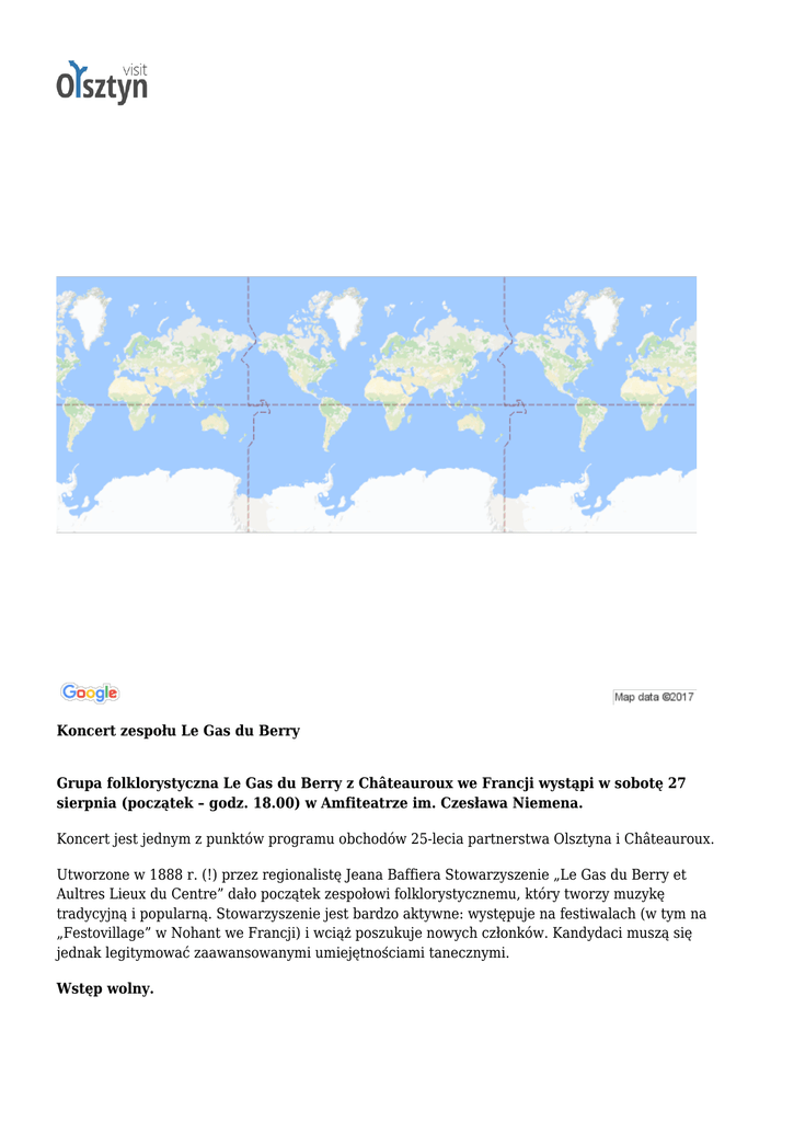 Koncert zespołu Le Gas du Berry Grupa folklorystyczna Le Gas du Berry z Châteauroux we Francji wystąpi w sobotę 27 sierpnia (początek – godz. 18.00) w Amfiteatrze im. Czesława Niemena. Koncert jest jednym z punktów programu obchodów 25-lecia partnerstwa Olsztyna i Châteauroux. Utworzone w 1888 r. (!) przez regionalistę Jeana Baffiera Stowarzyszenie „Le Gas du Berry et Aultres Lieux du Centre” dało początek zespołowi folklorystycznemu, który tworzy muzykę tradycyjną i popularną. Stowarzyszenie jest bardzo aktywne: występuje na festiwalach (w tym na „Festovillage” w Nohant we Francji) i wciąż poszukuje nowych członków. Kandydaci muszą się jednak legitymować zaawansowanymi umiejętnościami tanecznymi. Wstęp wolny. 1)Amfiteatr im. Czesława Niemena, (2016-08-27 18:00-2016-08-27 19:00) www.visit.olsztyn.eu