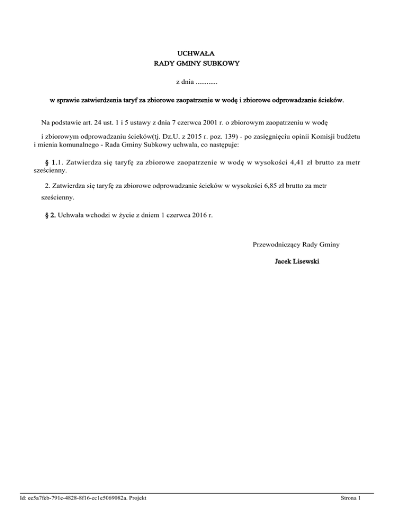 UCHWAŁA RADY GMINY SUBKOWY z dnia ............ w sprawie zatwierdzenia taryf za zbiorowe zaopatrzenie w wodę i zbiorowe odprowadzanie ścieków. Na podstawie art. 24 ust. 1 i 5 ustawy z dnia 7 czerwca 2001 r. o zbiorowym zaopatrzeniu w wodę i zbiorowym odprowadzaniu ścieków(tj. Dz.U. z 2015 r. poz. 139) - po zasięgnięciu opinii Komisji budżetu i mienia komunalnego - Rada Gminy Subkowy uchwala, co następuje: § 1.1. Zatwierdza się taryfę za zbiorowe zaopatrzenie w wodę w wysokości 4,41 zł brutto za metr sześcienny. 2. Zatwierdza się taryfę za zbiorowe odprowadzanie ścieków w wysokości 6,85 zł brutto za metr sześcienny. § 2. Uchwała wchodzi w życie z dniem 1 czerwca 2016 r. Przewodniczący Rady Gminy Jacek Lisewski Id: ee5a7feb-791e-4828-8f16-ec1e5069082a. Projekt Strona 1 Uzasadnienie Stosownie do art. 24 ust. 1 ustawy z dnia 7 czerwca 2001 r. o zbiorowym zaopatrzeniu w wodę i zbiorowym odprowadzaniu ścieków (t.j. Dz.U. z 2015 r. poz. 139), zwanej dalej "ustawą", taryfy podlegają zatwierdzeniu w drodze uchwały rady gminy i obowiązują przez okres jednego roku. Jednocześnie, w myśl art. 24 ust. 5 ustawy, rada gminy podejmuje uchwałę o zatwierdzeniu taryf w terminie 45 dni od dnia złożenia wniosku, o którym mowa w ust. 2 albo o odmowie zatwierdzenia taryf, jeżeli zostały one sporządzone niezgodnie z przepisami. Spółdzielnia Kółek Rolniczych w Subkowach, zwana dalej "Spółdzielnią" w trybie art. 24 ust. 2 ustawy, w dniu 22 marca 2016 r. złożyła wniosek o zatwierdzenie taryf dla zbiorowego zaopatrzenia w wodę i zbiorowego odprowadzania ścieków na okres od 1 czerwca 2016 r. do 31 maja 2017 r. na terenie objętym zezwoleniem wydanym przez Wójta Gminy Subkowy, znak : RK.I. 7021.6.2014 z dnia 14. 03. 2014 r. Na podstawie przeprowadzonej weryfikacji stwierdza się, że wniosek przygotowany został zgodnie z przepisami ustawy oraz Rozporządzenia Ministra Budownictwa z dnia 28 czerwca 2006 r. w sprawie określania taryf, wzoru wniosku o zatwierdzenie taryf oraz warunków rozliczeń za zbiorowe zaopatrzenie w wodę i zbiorowe odprowadzanie ścieków (Dz.U. Nr 127, poz. 886), zwanego dalej "rozporządzeniem" w zakresie: I. Podstawa prawna weryfikacji Podstawą prawną jest art. 24 ust. 4 ustawy, w myśl którego wójt (burmistrz, prezydent miasta) sprawdza, czy taryfy i plan zostały opracowane zgodnie z przepisami ustawy i weryfikuje koszty, o których mowa w art. 20 ust. 4 pkt 1, pod względem celowości ich ponoszenia. II. Ocena prawidłowości zastosowania roku obrachunkowego oraz daty złożenia wniosku Zgodnie z § 2 pkt 7 rozporządzenia rok obrachunkowy poprzedzający wprowadzenie nowych taryf określa się jako 12 kolejnych miesięcy poprzedzających nie więcej niż o 2 miesiące dzień złożenia wniosku. Spółdzielnia złożyła wniosek w dniu 22.03.2016 r. zaś jako rok obrachunkowy przyjęła okres od 1 lutego 2015 r. do 31 stycznia 2016 r., zatem prawidłowo, ponieważ obejmował 12 miesięcy. Wniosek o zatwierdzenie taryf został złożony z zachowaniem terminu ustawowego. Zgodnie z art. 24 ust. 2 ustawy, przedsiębiorstwo wodociągowo–kanalizacyjne, w terminie 70 dni przed planowanym dniem wejścia taryf w życie, przedstawia wójtowi (burmistrzowi, prezydentowi miasta) wniosek o ich zatwierdzenie. III. Sprawdzenie wniosku o zatwierdzenie taryf pod kątem kompletności Zgodnie z § 4 rozporządzenia, w taryfach za zbiorowe zaopatrzenie w wodę i zbiorowe odprowadzanie ścieków określa się następujące dane: 1. Rodzaje prowadzonej działalności. Spółdzielnia określiła rodzaje prowadzonej działalności na terenie gminy Subkowy. Działalność obejmuje zbiorowe zaopatrzenie w wodę i zbiorowe odprowadzanie ścieków, obejmuje łącznie ujmowanie, uzdatnianie Id: ee5a7feb-791e-4828-8f16-ec1e5069082a. Projekt Strona 2 i dostarczanie wody za pomocą urządzeń wodociągowych oraz oczyszczanie i odprowadzanie ścieków dostarczanych przez usługobiorców za pomocą urządzeń kanalizacyjnych. 2. Rodzaj i struktura taryfy. a) zbiorowe zaopatrzenie w wodę Rodzaj i struktura taryfy wskazane są we wniosku taryfowym. Zgodnie z § 14 pkt 1 lit. a oraz pkt 2 lit. b rozporządzenia oraz z przedstawioną przez Spółdzielnię kalkulacją cen i stawek opłat (tab A-H kalkulacji), zaproponowana taryfa jest taryfą jednolitą dwuczłonową dla zbiorowego zaopatrzenia w wodę zawierającą jednakowe ceny 1m3 dostarczanej wody i jednakowe stawki opłat abonamentowych; b) zbiorowe odprowadzanie ścieków. Rodzaj i struktura taryfy wskazane są we wniosku taryfowym. Zgodnie z § 14 pkt 1 lit. a oraz pkt 2 lit. b rozporządzenia oraz kalkulacją, Spółdzielnia zaproponowała taryfę jednolitą dwuczłonową dla zbiorowego odprowadzania ścieków. Spółdzielnia nie zaproponowała taryfy sezonowej ani progresywnej – przepis § 14 pkt 3 rozporządzenia jest w tym względzie fakultatywny dla przedsiębiorstwa wodociągowo-kanalizacyjnego. 3. Taryfowe grupy odbiorców usług. Przepisy rozporządzenia oraz ustawy nie wymagają wyodrębnienia konkretnej grupy taryfowej. Spółdzielnia przyjęła jedną grupę taryfową odbiorców usług dla zbiorowego zaopatrzenia w wodę oraz jedną taryfową grupę odbiorców usług dla zbiorowego odprowadzania ścieków. We wniosku określono grupy odbiorców usług. 4. Rodzaje i wysokość cen i stawek opłat: 1) cena za m3 dostarczonej wody – ustalona została jednolicie na poziomie 4,08 zł netto dla wszystkich taryfowych grup odbiorców wody, 2) stawki opłaty abonamentowej na odbiorcę w rozliczeniach za dostarczoną wodę. Zgodnie z § 2 pkt 11 rozporządzenia, stawka opłaty abonamentowej składa się z kosztów utrzymania w gotowości do świadczenia usług urządzeń wodociągowych oraz jednostkę usługi odczytu wodomierza oraz rozliczenia należności za ilość dostarczonej wody. Opłata stała zaproponowana przez Spółdzielnię wynosi 2 zł. Jej wysokość wynika z umowy z Gminą, 3) cena 