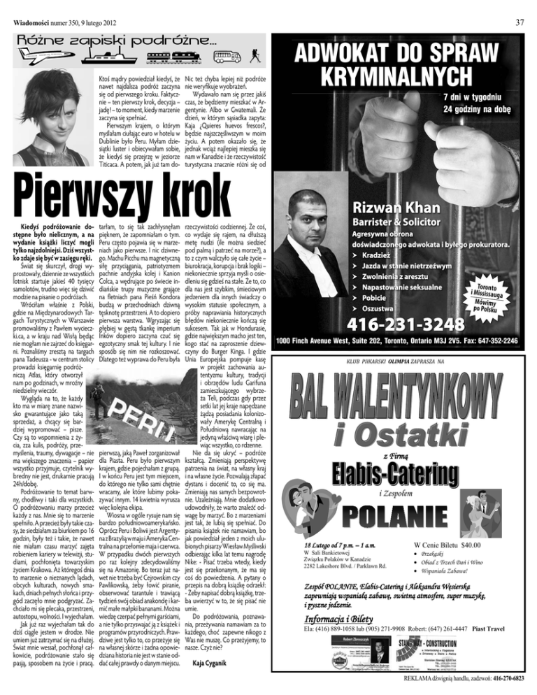 37 Wiadomości numer 350, 9 lutego 2012 Różne zapiski podróżne... Ktoś mądry powiedział kiedyś, że nawet najdalsza podróż zaczyna się od pierwszego kroku. Faktycznie – ten pierwszy krok, decyzja – jadę! – to moment, kiedy marzenie zaczyna się spełniać. Pierwszym krajem, o którym myślałam ciułając euro w hotelu w Dublinie było Peru. Myłam dziesiątki luster i obiecywałam sobie, że kiedyś się przejrzę w jeziorze Titicaca. A potem, jak już tam do- Nic też chyba lepiej niż podróże nie weryfikuje wyobrażeń. Wydawało nam się przez jakiś czas, że będziemy mieszkać w Argentynie. Albo w Gwatemali. Że dzień, w którym sąsiadka zapyta: Kaja ¿Quieres huevos frescos?, będzie najszczęśliwszym w moim życiu. A potem okazało się, że jednak wciąż najlepiej mieszka się nam w Kanadzie i że rzeczywistość turystyczna znacznie różni się od !$7/+!4$/302!7 +29-).!,.9#( DNIWTYGODNIU GODZINYNADOBÃ Pierwszy krok Kiedyś podróżowanie dostępne było nielicznym, a na wydanie książki liczyć mogli tylko najzdolniejsi. Dziś wszystko zdaje się być w zasięgu ręki. Świat się skurczył, drogi wyprostowały, dziennie ze wszystkich lotnisk startuje jakieś 40 tysięcy samolotów, trudno więc się dziwić modzie na pisanie o podróżach. Wróciłam właśnie z Polski, gdzie na Międzynarodowych Targach Turystycznych w Warszawie promowaliśmy z Pawłem wycieczki.ca, a w kraju nad Wisłą będąc nie mogłam nie zajrzeć do księgarni. Poznaliśmy zresztą na targach pana Tadeusza - w centrum stolicy prowadzi księgarnię podróżniczą Atlas, który otworzył nam po godzinach, w mroźny niedzielny wieczór. Wygląda na to, że każdy kto ma w miarę znane nazwisko gwarantujące jako taką sprzedaż, a chcący się bardziej wypromować – pisze. Czy są to wspomnienia z życia, zza kulis, podróży, przemyślenia, traumy, dywagacje – nie ma większego znaczenia – papier wszystko przyjmuje, czytelnik wybredny nie jest, drukarnie pracują 24h/dobę. Podróżowanie to temat barwny, chodliwy i taki dla wszystkich. O podróżowaniu marzy przecież każdy z nas. Mnie się to marzenie spełniło. A przecież były takie czasy, że siedziałam za biurkiem po 16 godzin, były też i takie, że nawet nie miałam czasu marzyć zajęta robieniem kariery w telewizji, studiami, pochłonięta towarzyskim życiem Krakowa. Aż któregoś dnia to marzenie o nieznanych lądach, obcych kulturach, nowych smakach, dniach pełnych słońca i przygód zaczęło mnie podgryzać. Zachciało mi się plecaka, przestrzeni, autostopu, wolności. I wyjechałam. Jak już raz wyjechałam tak do dziś ciągle jestem w drodze. Nie umiem już zatrzymać się na dłużej. Świat mnie wessał, pochłonął całkowicie, podróżowanie stało się pasją, sposobem na życie i pracą. tarłam, to się tak zachłysnęłam pięknem, że zapomniałam o tym. Peru często pojawia się w marzeniach jako pierwsze. I nic dziwnego. Machu Picchu ma magnetyczną siłę przyciągania, patriotyzmem pachnie andyjska kolej i Kanion Colca, a wędrujące po świecie indiańskie trupy muzyczne grające na fletniach pana Pieśń Kondora budzą w przechodniach dziwną tęsknotę przestrzeni. A to dopiero pierwsza warstwa. Wgryzając się głębiej w gęstą tkankę imperium Inków dopiero zaczyna czuć się egzotyczny smak tej kultury. I nie sposób się nim nie rozkoszować. Dlatego też wyprawa do Peru była pierwszą, jaką Paweł zorganizował dla Piasta. Peru było pierwszym krajem, gdzie pojechałam z grupą. I w końcu Peru jest tym miejscem, do którego nie tylko sami chętnie wracamy, ale które lubimy pokazywać innym. 14 kwietnia wyrusza więc kolejna ekipa. Wiosna w ogóle rysuje nam się bardzo południowoamerykańsko. Oprócz Peru i Boliwii jest Argentyna z Brazylią w maju i Ameryka Centralna na przełomie maja i czerwca. W przypadku dwóch pierwszych po raz kolejny zdecydowaliśmy się na Amazonię. Bo teraz już nawet nie trzeba być Cejrowskim czy Pawlikowską, żeby łowić piranie, obserwować tarantule i trawiącą tydzień swój obiad anakondę i karmić małe małpki bananami. Można wiedzę czerpać pełnymi garściami, a nie tylko przyswajać ją z książek i programów przyrodniczych. Prawdziwe jest tylko to, co przeżyje się na własnej skórze i żadna opowiedziana historia nie jest w stanie oddać całej prawdy o danym miejscu. rzeczywistości codziennej. Że coś, co wydaje się rajem, na dłuższą metę nudzi (ile można siedzieć pod palmą i patrzeć na morze?), a to z czym walczyło się całe życie – biurokracja, korupcja i brak logiki – niekoniecznie sprzyja myśli o osiedleniu się gdzieś na stałe. Że to, co dla nas jest szybkim, śmieciowym jedzeniem dla innych świadczy o wysokim statusie społecznym, a próby naprawiania historycznych błędów niekoniecznie kończą się sukcesem. Tak jak w Hondurasie, gdzie największym macho jest ten, kogo stać na zaproszenie dziewczyny do Burger Kinga. I gdzie Unia Europejska pompuje kasę w projekt zachowania autentyzmu kultury, tradycji i obrzędów ludu Garifuna zamieszkującego wybrzeża Teli, podczas gdy przez setki lat jej kraje napędzane żądzą posiadania kolonizowały Amerykę Centralną i Południową nawracając na jedyną właściwą wiarę i plewiąc wszystko, co rdzenne. Nie da się ukryć – podróże kształcą. Zmieniają perspektywę patrzenia na świat, na własny kraj i na własne życie. Pozwalają złapać dystans i docenić to, co się ma. Zmieniają nas samych bezpowrotnie. Uzależniają. Mnie dodatkowo udowodniły, że warto znaleźć odwagę by marzyć. Bo z marzeniami jest tak, że lubią się spełniać. Do pisania książek nie namawiam, bo jak powiedział jeden z moich ulubionych pisarzy Wiesław Myśliwski odbierając kilka lat temu nagrodę Nike: - Pisać trzeba wtedy, kiedy jest się przekonanym, że ma się coś do powiedzenia. A pytany o przepis na dobrą książkę odrzekł: - 