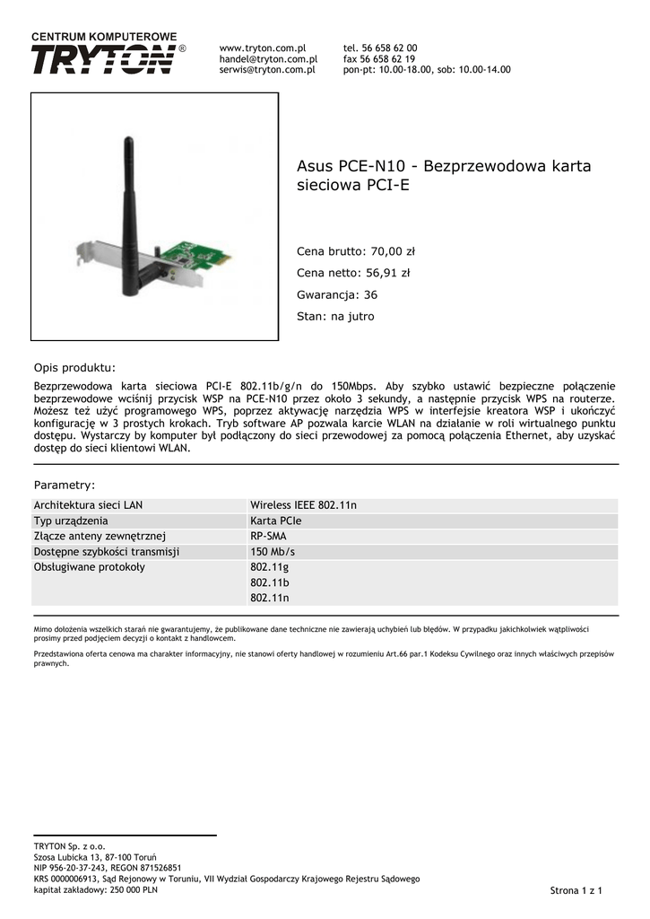 www.tryton.com.pl [email protected] [email protected] tel. 56 658 62 00 fax 56 658 62 19 pon-pt: 10.00-18.00, sob: 10.00-14.00 Asus PCE-N10 - Bezprzewodowa karta sieciowa PCI-E Cena brutto: 70,00 zł Cena netto: 56,91 zł Gwarancja: 36 Stan: na jutro Opis produktu: Bezprzewodowa karta sieciowa PCI-E 802.11b/g/n do 150Mbps. Aby szybko ustawić bezpieczne połączenie bezprzewodowe wciśnij przycisk WSP na PCE-N10 przez około 3 sekundy, a następnie przycisk WPS na routerze. Możesz też użyć programowego WPS, poprzez aktywację narzędzia WPS w interfejsie kreatora WSP i ukończyć konfigurację w 3 prostych krokach. Tryb software AP pozwala karcie WLAN na działanie w roli wirtualnego punktu dostępu. Wystarczy by komputer był podłączony do sieci przewodowej za pomocą połączenia Ethernet, aby uzyskać dostęp do sieci klientowi WLAN. Parametry: Architektura sieci LAN Typ urządzenia Złącze anteny zewnętrznej Dostępne szybkości transmisji Obsługiwane protokoły Wireless IEEE 802.11n Karta PCIe RP-SMA 150 Mb/s 802.11g 802.11b 802.11n Mimo dołożenia wszelkich starań nie gwarantujemy, że publikowane dane techniczne nie zawierają uchybień lub błędów. W przypadku jakichkolwiek wątpliwości prosimy przed podjęciem decyzji o kontakt z handlowcem. Przedstawiona oferta cenowa ma charakter informacyjny, nie stanowi oferty handlowej w rozumieniu Art.66 par.1 Kodeksu Cywilnego oraz innych właściwych przepisów prawnych. TRYTON Sp. z o.o. Szosa Lubicka 13, 87-100 Toruń NIP 956-20-37-243, REGON 871526851 KRS 0000006913, Sąd Rejonowy w Toruniu, VII Wydział Gospodarczy Krajowego Rejestru Sądowego kapitał zakładowy: 250 000 PLN Strona 1 z 1