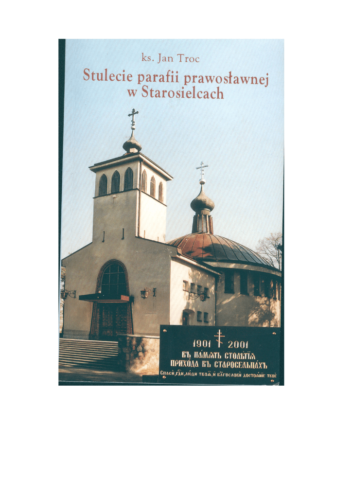 ks. prot. Jan Troc Stulecie parafii prawosławnej w Starosielcach Białystok – Starosielce 2002 r 2 W stęp W 2001 roku prawosławna parafia Zaśnięcia Najświętszej Marii Panny w Starosielcach obchodziła swoje stulecie. Sto lat temu, 15 lipca 1901 roku , w osadzie Starosielce, przy stacji kolejowej, uroczyście wyświęcono cerkiew św. św .braci Cyryla i M etodego. Pomysłodawcą budowy cerkwi był w 1895 r , katecheta ks. M ichał Pieszkowski. M ieszkańcy Starosielc oraz dyrektor szkoły Piotr Kradikow zaaprobowali ten pomysł i po zebraniu funduszy, w 1898 roku, dobudowano do frontu szkoły pomieszczenie, w którym do 1901 r. odprawiane były wieczorne nabożeństwa. Cerkiew św. św. Cyryla i M etodego dzięki wyposażeniu zaliczana była do najpiękniejszych w diecezji grodzieńskiej. Po powrocie z bieżeństwa ludność prawosławna nie odzyskała cerkwi. W 1919 r. została ona zamieniona na kościół rzymskokatolicki , a parafia prawosławna I wojna światowa całkowicie zdezorganizowała życie osady. Ze względu na jej strategiczne położenie i znaczenie przemysłu kolejowego, kolejarzy i sporą grupę innych mieszkańców ewakuowano w głąb Rosji. Wyposażenie zakładów kolejowych wywieziono, reszta została zbombardowana. Ocalała cerkiew i szkoła, wykorzystywane przez Niemców jako magazyny wojskowe i stajnie. zlikwidowana. Wiernym pozostała kapliczka na cmentarzu, którą z wielkim trudem rozbudowano. Prace budowlane trwały bardzo krótko ,założenie kamienia węgielnego dokonano w dzień święta Zaśnięcia Najświętszej M arii Panny 28 sierpnia 1928 roku, a wyświęcenie w dzień Wprowadzenia do Świątyni 4 grudnia 1928 r. Opiekę duszpasterską nad wiernymi roztoczył początkowo proboszcz parafii choroszczańskiej , później duchowni z cerkwi św. M ikołaja w Białymstoku. Wskutek działań wojennych II wojny światowej cerkiew znacznie ucierpiała, pamiątką po nich są odłamki w ikonie i przedziurawiony dzwon. Uszkodzona cerkiew wymagała kapitalnego remontu. Ówczesny proboszcz , ks. Aleksander Kudin-Kirykowicz , wielokrotnie zwracał się do władz z prośbą o zezwolenie na przebudowę cerkwi, ale nie wyrażały one zgody. Sytuacja w państwie nie sprzyjała ludziom wierzącym. Dopiero po długich zabiegach w 1972 roku ks. M ichałowi Chomczykowi , pod pretekstem rozbudowy, udało się rozpocząć wznoszenie nowej murowanej cerkwi. Wierni kolejny raz okazali wielkie przywiązanie do wiary ojców, nie zważając na różnego rodzaju trudności. 27 sierpnia 1972 r. biskup białostocki i gdański Nikanor poświęcił kamień węgielny pod budowę nowej cerkwi. Budowa trwała 7 lat, 25 maja 1979 r arcybiskup Nikanor wyświęcił nową cerkiew. W 1982 roku ks. M ichał Chomczyk otrzymał pozwolenie na rozbudowę plebanii , 28 sierpnia 1985 r ordynariusz diecezji białostocko- gdańskiej Sawa poświęcił dobudowaną część wraz z salą katechetyczną. 3 września 1985 r. nowym proboszczem został ks. prot. Andrzej Berezowiec, który pełnił tę funkcję przez 4 lata. 3 W grudniu 1989 r został proboszczem ks. został prot. Jan Troc. Zmiany w Polsce korzystnie zaowocowały i w życiu parafialnym, katechizacja młodzieży wkroczyła do szkół W parafii powstał chór którego dyrygentem została Joanna Chilimoniuk. M łodzież przybliżyła się do cerkwi. Parafialne Bractwo M łodzieży w 2000 r. rozpoczęło wydawać pismo THEOTOKOS. Uroczystości 100-lecia parafii odbyły się 27 i 28 sierpnia , okolicznościowe nabożeństwa odprawił biskup białostocki i gdański Jakub wraz z licznie przybyłymi duchownymi , przy udziale wielkiej rzeszy wiernych. Jubileusz parafii stał się bodźcem do napisania monografii . M ożna żywić nadzieję, że tak jak dotychczas M atka Boża , patronka cerkwi , nie zostawi jej bez opieki i nadziei na Swe wstawiennictwo, jak o tym mówią słowa troparionu święta Zaśnięcia; V rożdestve devstvo sochraniła, vo Uspenii mira nie ostaviła ... 4 Z historii Białegostoku Okolice Białegostoku w XV wieku należały do wielkoksiążęcej Puszczy Bielskiej1. Nieliczne wsie i osady chłopskie tworzyły w niej wyspy osadnicze, rozrzucone w puszczy i podlegające władzy namiestników starych grodów ruskich Suraża i Bielska. M iędzy rokiem 1437 a 1450 dobra białostockie otrzymał Raczko Tabutowicz , zapewne z rąk litewskiego księcia M ichała Zygmuntowicza. Najstarszymi osadami na obszarze dzisiejszego miasta Białegostoku były ruskie wsie Horodniany i Starosielce (Stare Sioło lub Stara Wieś) wymienione pod tymi nazwami w 1533 r.2 Nazwa ta pojawiła się29 marca 1533 r. w czasie rozgraniczenia przez namiestnika bielskiego, na prośbę dziedzica , wsi Horodniany. Wcześniej , bo w 1514 r., pojawia się nazwa wsi Klepacze. Droga Wielka Litewska biegła z Litwy przez Gródek i dobra Białystok obok gruntów wsi Klepacze do Choroszczy. Dzisiejszy bieg tej drogi to ulice Piasta, Słonimska, Kilińskiego, Rynek Kościuszki, Sosnowa i M arczukowska. Udokumentowane to zostało w kronice Ławry Supraskiej spisanej przez o. M ikołaja Rodkiewicza około 1747 roku: Na Perwiey poczawszy Kupli moieia Hranica, od Biełohostoka dorohuju Welikoiu Litowskoiu, Kotoraia idet z Litwy mimo Klepaczy do 1 Z 1536 r. pochodzi wzmianka mówiąca , że od wsi dobriniewo idut wielikie lesy aż do Bielska i bory. Zatem puszcza jeszcze sięgała do między rzecza Supraśli i Narwi. J. Wiśniewski, Początki Białegostoku i okolicznego osadnictwa, (w;) Studia i materiały do dziejów miasta białegostoku 1985, s. 25. Natomiast J. Maroszek puszczę tę określa jako < Puszcza Białystok >porostająca obszar dorzecza rzeki Białej aż do ujścia jej do Supraśli. J. Maroszek, Rewelacyjne odkrycie nieznanych najstarszych dokumentów dla Białegostoku < 1999 nr 1 s. 5. Białostoczyzna >, 2 T . Wasilewski, Białystok w XVI-XVII w., [w:] Studia i Materiały do dziejów miasta Białegostoku t.1, Białystok 1968 s. 107. 5 Choroszczy, az u dorohu K