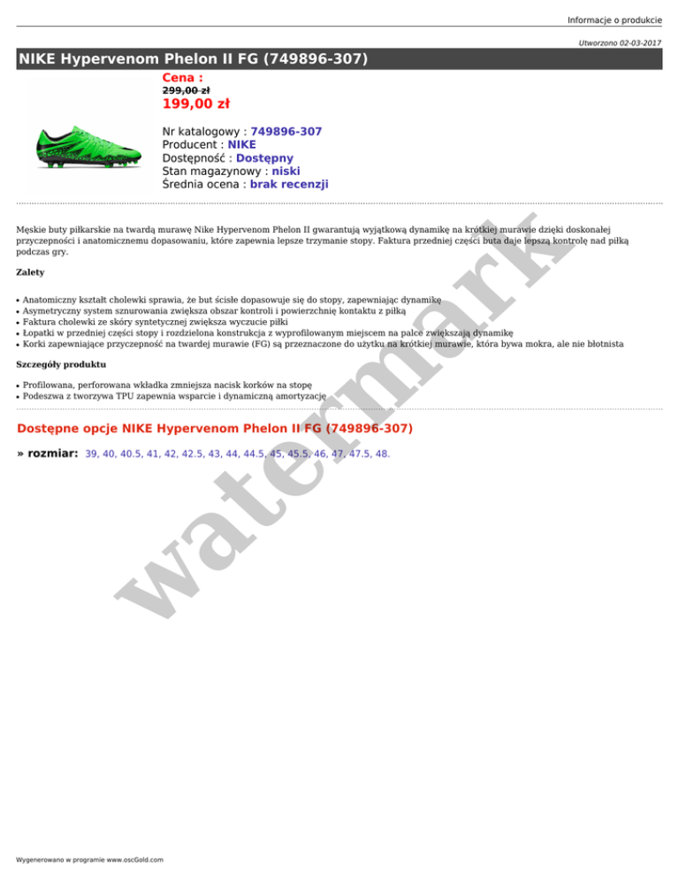 Informacje o produkcie Utworzono 02-03-2017 NIKE Hypervenom Phelon II FG (749896-307) Cena : 299,00 zł 199,00 zł Nr katalogowy : 749896-307 Producent : NIKE Dostępność : Dostępny Stan magazynowy : niski Średnia ocena : brak recenzji er m ar k Męskie buty piłkarskie na twardą murawę Nike Hypervenom Phelon II gwarantują wyjątkową dynamikę na krótkiej murawie dzięki doskonałej przyczepności i anatomicznemu dopasowaniu, które zapewnia lepsze trzymanie stopy. Faktura przedniej części buta daje lepszą kontrolę nad piłką podczas gry. Zalety ● ● ● ● ● Anatomiczny kształt cholewki sprawia, że but ścisłe dopasowuje się do stopy, zapewniając dynamikę Asymetryczny system sznurowania zwiększa obszar kontroli i powierzchnię kontaktu z piłką Faktura cholewki ze skóry syntetycznej zwiększa wyczucie piłki Łopatki w przedniej części stopy i rozdzielona konstrukcja z wyprofilowanym miejscem na palce zwiększają dynamikę Korki zapewniające przyczepność na twardej murawie (FG) są przeznaczone do użytku na krótkiej murawie, która bywa mokra, ale nie błotnista Szczegóły produktu ● ● Profilowana, perforowana wkładka zmniejsza nacisk korków na stopę Podeszwa z tworzywa TPU zapewnia wsparcie i dynamiczną amortyzację Dostępne opcje NIKE Hypervenom Phelon II FG (749896-307) w at » rozmiar: 39, 40, 40.5, 41, 42, 42.5, 43, 44, 44.5, 45, 45.5, 46, 47, 47.5, 48. Wygenerowano w programie www.oscGold.com