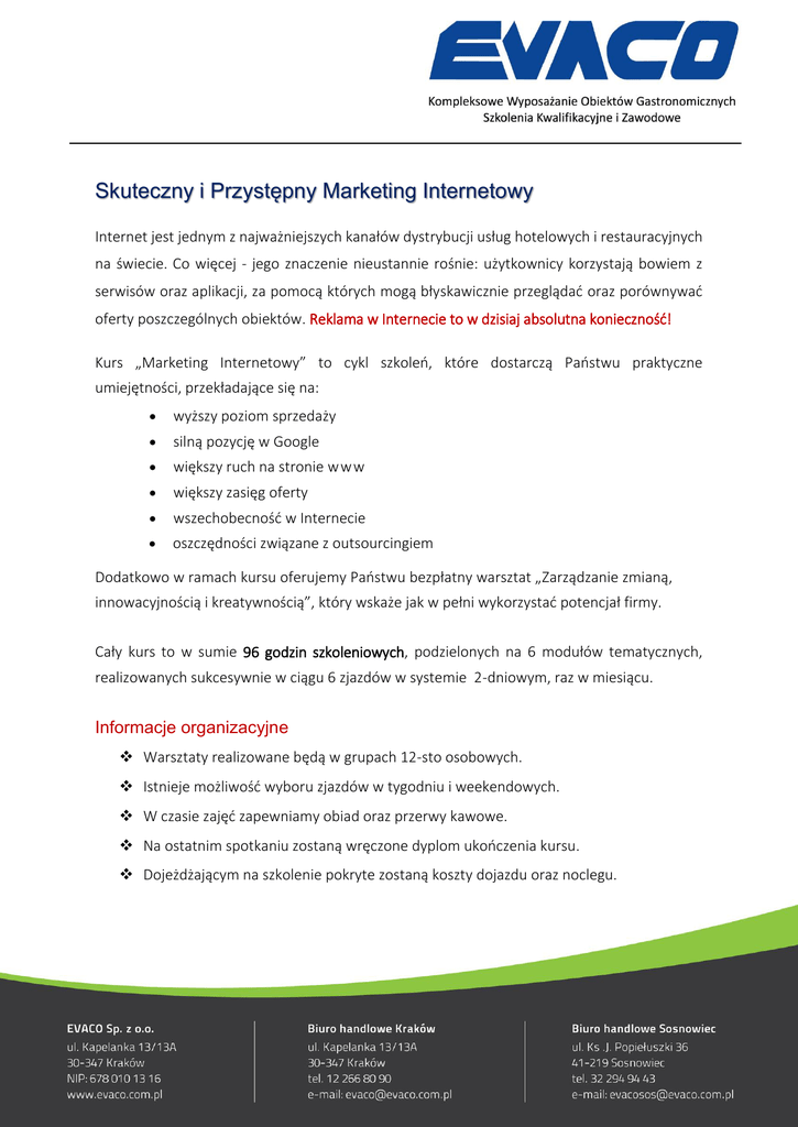 Skuteczny i Przystępny Marketing Internetowy Internet jest jednym z najważniejszych kanałów dystrybucji usług hotelowych i restauracyjnych na świecie. Co więcej - jego znaczenie nieustannie rośnie: użytkownicy korzystają bowiem z serwisów oraz aplikacji, za pomocą których mogą błyskawicznie przeglądać oraz porównywać oferty poszczególnych obiektów. Reklama w Internecie to w dzisiaj absolutna konieczność! Kurs „Marketing Internetowy” to cykl szkoleń, które dostarczą Państwu praktyczne umiejętności, przekładające się na: wyższy poziom sprzedaży silną pozycję w Google większy ruch na stronie w w w większy zasięg oferty wszechobecność w Internecie oszczędności związane z outsourcingiem Dodatkowo w ramach kursu oferujemy Państwu bezpłatny warsztat „Zarządzanie zmianą, innowacyjnością i kreatywnością”, który wskaże jak w pełni wykorzystać potencjał firmy. Cały kurs to w sumie 96 godzin szkoleniowych, podzielonych na 6 modułów tematycznych, realizowanych sukcesywnie w ciągu 6 zjazdów w systemie 2-dniowym, raz w miesiącu. Informacje organizacyjne Warsztaty realizowane będą w grupach 12-sto osobowych. Istnieje możliwość wyboru zjazdów w tygodniu i weekendowych. W czasie zajęć zapewniamy obiad oraz przerwy kawowe. Na ostatnim spotkaniu zostaną wręczone dyplom ukończenia kursu. Dojeżdżającym na szkolenie pokryte zostaną koszty dojazdu oraz noclegu. Program kursu Moduł 1: Marketing internetowy - najefektywniejsze narzędzie promocji i sprzedaży w XXI wieku Dlaczego marketing internetowy jest taki ważny Strona www, jako podstawowy kanał informacji o obiekcie/placówce Wprowadzenie do Facebook, Adwords, Mapy Google, Youtube, Marketing Szeptany, Remarketing, Pozycjonowanie, Mailing, Sms Moduł 2: FanPage, Facebook Założenie konta na Facebooku Jak pozyskać fanów na Facebooku Jak założyć pierwszą kampanię na Facebooku Jak mierzyć to co robimy? Moduł 3: Mapy Google, Google Inside Dlaczego mapy są takie ważne YouTub jako najtańsza forma reklamy Jak założyć pierwszą kampanie reklamowa w YouTube Pozycjonowanie filmów w Youtube Moduł 4 Adwords, linki sponsorowane w Google Sieć reklamowa, remarketing Założenie i uruchomienie pierwszej kampania Google Adwords Programy reklamowe Google - sposoby mierzenia i oceniania wyników Moduł 5 Public relations w sieci Marketing szeptany - opinie, blogi, fora Mailing, Newsletter, Sms Marketing Jak zdobyć i przechowywać bazy mailowe Jak przygotować pierwszą kampanie mailingową? Moduł 6: Zarządzanie zmianą, innowacyjnością i kreatywnością Innowacyjność jako kluczowa kompetencja i źródło przewagi konkurencyjne Metody rozwijania innowacyjności i twórczego myślenia Zarządzanie zmianami w przedsiębiorstwie Harmonogram i miejsce szkoleń terminy zjazdów 2015 Miejsce Grupa 1 zjazd 2 zjazd 3 zjazd 4 zjazd 5 zjazd 6 zjazd Kraków 1 18-19.04 16-17.05 13-14.06 11-12.07 1-2.08 5-6.09 Sosnowiec 2 22-23.04 20-21.05 24-25.06 22-23.07 26-27.08 23-24.09 Rzeszów 3 20-21.05 18-19.05 22-23.06 20-21.07 24-25.08 21-22.09 I dzień 10.00 - 11.30 11.30 - 11.45 11.45 - 13.15 13.15 - 14.00 14.00 - 15.30 15.30 - 15.45 15.45 - 17.15 II dzień warsztaty przerwa kawowa warsztaty lunch warsztaty przerwa kawowa warsztaty 8.30 - 10.00 10.00 -10.15 10.15 -11.45 11.45 - 12.00 12.00 - 13.30 13.30 - 14.15 14.15 -15.45 warsztaty przerwa kawowa warsztaty przerwa kawowa warsztaty lunch warsztaty Kontakt W celu otrzymania informacji, dotyczących przyjmowania zgłoszeń prosimy o kontakt. Paulina Jaynowska - kierownik projektu tel. 503 747 241 e-mail: [email protected]