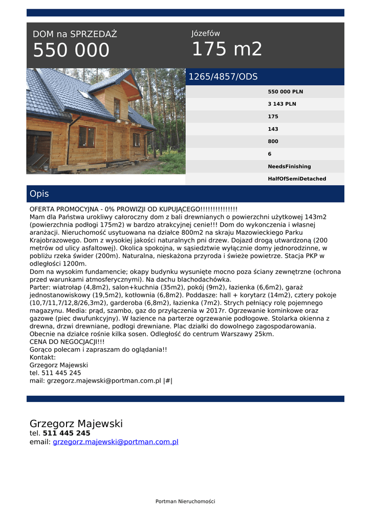 Józefów DOM na SPRZEDAŻ 175 m2 550 000 1265/4857/ODS 550 000 PLN 3 143 PLN 175 143 800 6 NeedsFinishing HalfOfSemiDetached Opis OFERTA PROMOCYJNA - 0% PROWIZJI OD KUPUJĄCEGO!!!!!!!!!!!!!!! Mam dla Państwa urokliwy całoroczny dom z bali drewnianych o powierzchni użytkowej 143m2 (powierzchnia podłogi 175m2) w bardzo atrakcyjnej cenie!!! Dom do wykonczenia i własnej aranżacji. Nieruchomość usytuowana na działce 800m2 na skraju Mazowieckiego Parku Krajobrazowego. Dom z wysokiej jakości naturalnych pni drzew. Dojazd drogą utwardzoną (200 metrów od ulicy asfaltowej). Okolica spokojna, w sąsiedztwie wyłącznie domy jednorodzinne, w pobliżu rzeka świder (200m). Naturalna, nieskażona przyroda i świeże powietrze. Stacja PKP w odległości 1200m. Dom na wysokim fundamencie; okapy budynku wysunięte mocno poza ściany zewnętrzne (ochrona przed warunkami atmosferycznymi). Na dachu blachodachówka. Parter: wiatrołap (4,8m2), salon+kuchnia (35m2), pokój (9m2), łazienka (6,6m2), garaż jednostanowiskowy (19,5m2), kotłownia (6,8m2). Poddasze: hall + korytarz (14m2), cztery pokoje (10,7/11,7/12,8/26,3m2), garderoba (6,8m2), łazienka (7m2). Strych pełniący rolę pojemnego magazynu. Media: prąd, szambo, gaz do przyłączenia w 2017r. Ogrzewanie kominkowe oraz gazowe (piec dwufunkcyjny). W łazience na parterze ogrzewanie podłogowe. Stolarka okienna z drewna, drzwi drewniane, podłogi drewniane. Plac działki do dowolnego zagospodarowania. Obecnie na działce rośnie kilka sosen. Odległość do centrum Warszawy 25km. CENA DO NEGOCJACJI!!! Gorąco polecam i zapraszam do oglądania!! Kontakt: Grzegorz Majewski tel. 511 445 245 mail: [email protected] |#| Grzegorz Majewski tel. 511 445 245 email: [email protected] Portman Nieruchomości Powered by TCPDF (www.tcpdf.org)