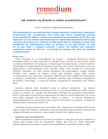 Jak zmienia się dziecko w wieku przedszkolnym? Anna I. Brzezińska, Małgorzata Rękosiewicz Wiek przedszkolny to czas wielu przemian, zarówno fizycznych, motorycznych, społecznych, emocjonalnych, jak i poznawczych. Sama nazwa tego okresu rozwojowego wskazuje na jej najważniejsze zadanie – dziecko ma przygotować się do pójścia do szkoły. Musi więc wykazywać się coraz większą samodzielnością oraz odpowiednią dojrzałością emocjonalną i społeczną do rozstania się z rodzicami na kilka godzin dziennie. Niezbędne są także takie umiejętności jak rozpoznawanie, kiedy coś wymyka mu się spod kontroli lub idzie nie po jego myśli, a następnie proszenie o pomoc. Na zdobycie tych wszystkich umiejętności dziecko ma kilka lat – od trzeciego do szóstego roku życia. Jak przebiega to przygotowanie? Nowe czasy Dzieci rozwijają się w zmieniających się czasach – następuje dynamiczny rozwój technologii, która na stałe wkroczyła do naszego życia, również do życia dzieci. Dzieci w wieku przedszkolnym korzystają już z telewizji, gier komputerowych, a nawet Internetu. Technologia w rozwoju dziecka ma zarówno swoje plusy, jak i minusy. Korzystanie z nich przy ograniczonym i kontrolowanym przez rodziców czasie może rozwijać ich wyobraźnię, zdolności manualne, czy takie funkcje poznawcze, jak spostrzeganie, uwagę, pamięć. Problem może pojawić się dopiero wtedy, gdy telewizja zastąpi bajki czytane czy opowiadane przez rodziców, a komputer zabierze czas, który mógłby być przeznaczony na zabawę z rówieśnikami. Jesteśmy świadkami przemian, jakie zachodzą w umiejętności korzystania z technologii – w miarę jej rozwoju umiejętność tę opanowują coraz młodsze dzieci. Jesteśmy obecnie także świadkami zmian w zakresie szkolnictwa – po okresie, w którym to rodzice podejmowali decyzję o tym, czy ich dziecko pójdzie do szkoły w wieku sześciu czy siedmiu lat, nastąpił czas obowiązku szkolnego dla wszystkich sześciolatków. Dzieci w tym wieku muszą być już przygotowane do wejścia w nowe środowisko, tzn. muszą mieć dobre podstawy do odniesienia sukcesu w szkole – w zakresie umiejętności podporządkowania się nauczycielom, pracy pod ich kierunkiem w skupieniu, umiejętności radzenia sobie z sytuacjami nowymi, itd. Zmieniają się więc zarówno czasy, same dzieci, jak i wychowanie i edukacja, które muszą wyjść im naprzeciw. Dbanie o optymalny rozwój we wszystkich jego aspektach musi brać pod uwagę zmieniające się otoczenie, z jego nowymi zaletami, jak i ograniczeniami. Rozwój w wieku przedszkolnym Wiek przedszkolny rozpoczyna się i kończy rozstaniem z rodzicami. Pierwsze rozstanie ma miejsce, gdy dziecko idzie do przedszkola, drugie, gdy idzie do szkoły. Aktywność dziecka odbywa się w kontakcie z ludźmi oraz przedmiotami i umożliwia rozwój na kilku 1 płaszczyznach – emocjonalnej, społecznej, moralnej, poznawczej, seksualnej, fizycznej. Aktywność dziecka pociąga za sobą zmiany w jego funkcjonowaniu psychicznym i społecznym – patrz rys. – tj. w wielu procesach regulujących jego zachowanie. Z kolei rozwój fizyczny, seksualny, emocjonalny, poznawczy i społeczny powodują kolejne zmiany w jego aktywności: zmiany rodzaju aktywności – zmiana relacji i proporcji między zabawą, uczeniem się i pracą rozumianą jako wypełnianie obowiązków; zmiany treści aktywności – treść zabaw, rysunków, treść komunikatów kierowanych do dorosłych i do innych dzieci; zmiany rodzaju motywacji i poziomu zaangażowania dziecka w aktywność; zmiany nastawienia dziecka – z koncentracji na procesie u dzieci młodszych do koncentracji na celu u dzieci starszych, z dążenia do uzyskania zewnętrznej nagrody (np. pochwały dorosłego) do powstania poczucia wewnętrznego zadowolenia z własnego działania i uzyskanego rezultatu. Obszary zmian w wieku przedszkolnym Na płaszczyźnie społecznej dziecko przechodzi od indywidualizmu i egocentryzmu do współdziałania, współpracy. Staje się coraz bardziej samodzielne i wymaga coraz mniejszego wsparcia i pomocy ze strony otoczenia, a jednocześnie uczy się, kiedy i w jaki sposób o pomoc prosić. Uczy się przyjmować i akceptować reguły, dzięki czemu nabywa kompetencji podporządkowania się normom czy innej osobie. Rodzi się autorefleksja, która umożliwia samokontrolę, dzięki której z kolei zmniejsza się labilność emocjonalna i impulsywność, a działanie jest coraz bardziej świadome i celowe. 2 Nawiązywanie kontaktów rówieśniczych stanowi źródło satysfakcji i radości, które kształtują pozytywny obraz świata dziecka. W zakresie rozwoju emocjonalnego dziecko przechodzi od syntonii, czyli współbrzmienia emocjonalnego, współodczuwania wraz z opiekunem – do empatii, czyli dojrzałego emocjonalnie zrozumienia uczuć drugiej osoby. Dzięki rozwijającej się refleksji dziecko jest w stanie zrozumieć położenie drugiej osoby. Istotną rolę odgrywa tu zabawa, w której dziecko przejmuje przeżycia bohatera, a jednocześnie samo przeżywa odgrywanie roli, dzięki czemu uczy się regulować stany emocjonalne i rozumieć przeżycia innych. W obszarze poznawczym poszerza się zakres wiedzy dziecka o świecie. z rodzicami, innymi dorosłymi, obserwowanie ich, zabawa z grupą rówieśniczą, z różnymi miejscami w przestrzeni publicznej oraz kontakt z mediami, ciągłe „dlaczego” poszerzają wiedzę zarówno o świecie ludzi, jak i przedmiotów i uczą umiejętności. Kontakt kontakt pytanie nowych Dziecko w wieku przedszkolnym jest „głodne ruchu”, co z powodzeniem może wykorzystać w zabawie, czyli głównej aktywności tego wieku. Zabawa, będąc odzwierciedleniem rozwoju dziecka, sama ulega przekształceniom. Od tak zwanej zabawy na serio, dziecko przechodzi do zabawy na niby. Rozwija się zabawa w „udawanie”, zabawa tematyczna – w piratów, w teatrzyk, w dom. Dzięki większej wytrzymałości fizyczn