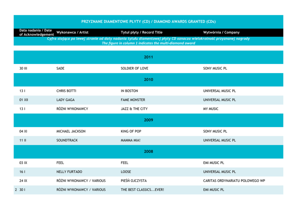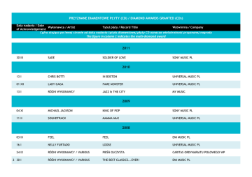 PRZYZNANE DIAMENTOWE PŁYTY (CD) / DIAMOND AWARDS GRANTED (CDs) Data nadania / Date Wykonawca / Artist Tytuł płyty / Record Title Wytwórnia / Company of Acknowledgement Cyfra stojąca po lewej stronie od daty nadania tytułu diamentowej płyty CD oznacza wielokrotność przyznanej nagrody The figure in column 1 indicates the multi-diamond award 2011 30 III SADE SOLDIER OF LOVE SONY MUSIC PL 2010 13 I CHRIS BOTTI IN BOSTON UNIVERSAL MUSIC PL 01 XII LADY GAGA FAME MONSTER UNIVERSAL MUSIC PL 13 I RÓŻNI WYKONAWCY JAZZ & THE CITY MY MUSIC 2009 04 XI MICHAEL JACKSON KING OF POP SONY MUSIC PL 11 II SOUNDTRACK MAMMA MIA! UNIVERSAL MUSIC PL 2008 03 IX FEEL FEEL EMI MUSIC PL 16 I NELLY FURTADO LOOSE UNIVERSAL MUSIC PL 24 IX RÓŻNI WYKONAWCY / VARIOUS PIEŚŃ OJCZYSTA CARITAS ORDYNARIATU POLOWEGO WP RÓŻNI WYKONAWCY / VARIOUS THE BEST CLASSICS...EVER! EMI MUSIC PL 2 30 I PRZYZNANE DIAMENTOWE PŁYTY (CD) / DIAMOND AWARDS GRANTED (CDs) Data nadania / Date Wykonawca / Artist Tytuł płyty / Record Title Wytwórnia / Company of Acknowledgement Cyfra stojąca po lewej stronie od daty nadania tytułu diamentowej płyty CD oznacza wielokrotność przyznanej nagrody The figure in column 1 indicates the multi-diamond award 2 30 I RÓŻNI WYKONAWCY / VARIOUS THE BEST SMOOTH JAZZ...EVER! EMI MUSIC PL 2007 10 I RÓŻNI WYKONAWCY / VARIOUS THE BEST CHRISTMAS...EVER! EMI MUSIC PL 05 XII RÓŻNI WYKONAWCY / VARIOUS RMF FM NAJLEPSZA MUZYKA PO POLSKU UNIVERSAL MUSIC PL RUBIK / KSIĄŻEK PSAŁTERZ WRZEŚNIOWY UNIVERSAL MUSIC PL RUBIK, RAK, KSIĄŻEK ORATORIUM TU ES PETRUS UNIVERSAL MUSIC PL 2 21 III 09 V 2006 15 III RÓŻNI WYKONAWCY / VARIOUS THE BEST CLASSICS...EVER EMI MUSIC PL 13 IX RÓŻNI WYKONAWCY / VARIOUS CHOPIN - DZIEŁA WSZYSTKIE POLSKIE RADIO 2005 07 XII RÓŻNI WYKONAWCY (VARIOUS) CHOPIN - DZIEŁA WSZYSTKIE POLSKIE RADIO S.A. 26 I RÓŻNI WYKONAWCY (VARIOUS) THE BEST SMOOTH JAZZ...EVER POMATON EMI 2004 25 II KRYSTIAN ZIMERMAN CHOPIN: PIANO CONCERTOS UNIVERSAL MUSIC PL PRZYZNANE DIAMENTOWE PŁYTY (CD) / DIAMOND AWARDS GRANTED (CDs) Data nadania / Date Wykonawca / Artist Tytuł płyty / Record Title Wytwórnia / Company of Acknowledgement Cyfra stojąca po lewej stronie od daty nadania tytułu diamentowej płyty CD oznacza wielokrotność przyznanej nagrody The figure in column 1 indicates the multi-diamond award 2002 07 X ICH TROJE PO PIĄTE...A NIECH GADAJĄ UNIVERSAL MUSIC PL 2001 17 X ICH TROJE AD.4 UNIVERSAL MUSIC PL 2000 05 VII KAYAH & GORAN KAYAH & GORAN BMG PL
