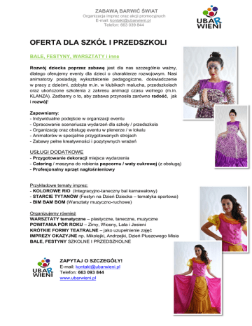 ZABAWĄ BARWIĆ ŚWIAT Organizacja imprez oraz akcji promocyjnych E-mail: [email protected] Telefon: 663 039 844 OFERTA DLA SZKÓŁ I PRZEDSZKOLI BALE, FESTYNY, WARSZTATY i inne Rozwój dziecka poprzez zabawę jest dla nas szczególnie ważny, dlatego oferujemy eventy dla dzieci o charakterze rozwojowym. Nasi animatorzy posiadają wykształcenie pedagogiczne, doświadczenie w pracy z dziećmi, zdobyte m.in. w klubikach malucha, przedszkolach oraz ukończone szkolenia z zakresu animacji czasu wolnego (m.in. KLANZA). Zadbamy o to, aby zabawa przynosiła zarówno radość, jak i rozwój! Zapewniamy: - Indywidualne podejście w organizacji eventu - Opracowanie scenariusza wydarzeń dla szkoły / przedszkola - Organizację oraz obsługę eventu w plenerze / w lokalu - Animatorów w specjalnie przygotowanych strojach - Zabawy pełne kreatywności i pozytywnych wrażeń USŁUGI DODATKOWE - Przygotowanie dekoracji miejsca wydarzenia - Catering / maszyna do robienia popcornu / waty cukrowej (z obsługą) - Profesjonalny sprzęt nagłośnieniowy Przykładowe tematy imprez: - KOLOROWE RIO (Integracyjno-taneczny bal karnawałowy) - STARCIE TYTANÓW (Festyn na Dzień Dziecka – tematyka sportowa) - BIM BAM BOM (Warsztaty muzyczno-ruchowe) Organizujemy również WARSZTATY tematyczne – plastyczne, taneczne, muzyczne POWITANIA PÓR ROKU – Zimy, Wiosny, Lata i Jesieni KRÓTKIE FORMY TEATRALNE – jako uzupełnienie zajęć IMPREZY OKAZYJNE np. Mikołajki, Andrzejki, Dzień Pluszowego Misia BALE, FESTYNY SZKOLNE I PRZEDSZKOLNE ZAPYTAJ O SZCZEGÓŁY! E-mail: [email protected] Telefon: 663 093 844 www.ubarwieni.pl