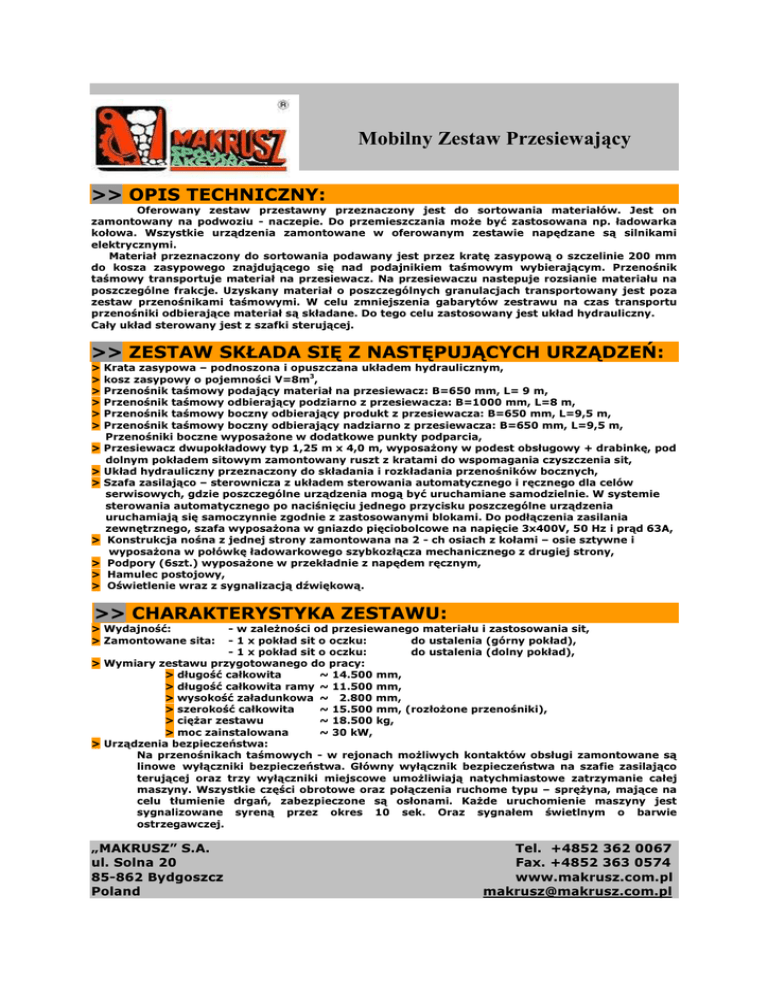 Mobilny Zestaw Przesiewający >> OPIS TECHNICZNY: Oferowany zestaw przestawny przeznaczony jest do sortowania materiałów. Jest on zamontowany na podwoziu - naczepie. Do przemieszczania może być zastosowana np. ładowarka kołowa. Wszystkie urządzenia zamontowane w oferowanym zestawie napędzane są silnikami elektrycznymi. Materiał przeznaczony do sortowania podawany jest przez kratę zasypową o szczelinie 200 mm do kosza zasypowego znajdującego się nad podajnikiem taśmowym wybierającym. Przenośnik taśmowy transportuje materiał na przesiewacz. Na przesiewaczu nastepuje rozsianie materiału na poszczególne frakcje. Uzyskany materiał o poszczególnych granulacjach transportowany jest poza zestaw przenośnikami taśmowymi. W celu zmniejszenia gabarytów zestrawu na czas transportu przenośniki odbierające materiał są składane. Do tego celu zastosowany jest układ hydrauliczny. Cały układ sterowany jest z szafki sterującej. >> ZESTAW SKŁADA SIĘ Z NASTĘPUJĄCYCH URZĄDZEŃ: > > > > > > > > > > > > > Krata zasypowa – podnoszona i opuszczana układem hydraulicznym, kosz zasypowy o pojemności V=8m3, Przenośnik taśmowy podający materiał na przesiewacz: B=650 mm, L= 9 m, Przenośnik taśmowy odbierający podziarno z przesiewacza: B=1000 mm, L=8 m, Przenośnik taśmowy boczny odbierający produkt z przesiewacza: B=650 mm, L=9,5 m, Przenośnik taśmowy boczny odbierający nadziarno z przesiewacza: B=650 mm, L=9,5 m, Przenośniki boczne wyposażone w dodatkowe punkty podparcia, Przesiewacz dwupokładowy typ 1,25 m x 4,0 m, wyposażony w podest obsługowy + drabinkę, pod dolnym pokładem sitowym zamontowany ruszt z kratami do wspomagania czyszczenia sit, Układ hydrauliczny przeznaczony do składania i rozkładania przenośników bocznych, Szafa zasilająco – sterownicza z układem sterowania automatycznego i ręcznego dla celów serwisowych, gdzie poszczególne urządzenia mogą być uruchamiane samodzielnie. W systemie sterowania automatycznego po naciśnięciu jednego przycisku poszczególne urządzenia uruchamiają się samoczynnie zgodnie z zastosowanymi blokami. Do podłączenia zasilania zewnętrznego, szafa wyposażona w gniazdo pięciobolcowe na napięcie 3x400V, 50 Hz i prąd 63A, Konstrukcja nośna z jednej strony zamontowana na 2 - ch osiach z kołami – osie sztywne i wyposażona w połówkę ładowarkowego szybkozłącza mechanicznego z drugiej strony, Podpory (6szt.) wyposażone w przekładnie z napędem ręcznym, Hamulec postojowy, Oświetlenie wraz z sygnalizacją dźwiękową. >> CHARAKTERYSTYKA ZESTAWU: > Wydajność: > Zamontowane sita: - w zależności od przesiewanego materiału i zastosowania sit, - 1 x pokład sit o oczku: do ustalenia (górny pokład), - 1 x pokład sit o oczku: do ustalenia (dolny pokład), > Wymiary zestawu przygotowanego do pracy: > długość całkowita ~ 14.500 mm, > długość całkowita ramy ~ 11.500 mm, > wysokość załadunkowa ~ 2.800 mm, > szerokość całkowita ~ 15.500 mm, (rozłożone przenośniki), > ciężar zestawu ~ 18.500 kg, > moc zainstalowana ~ 30 kW, > Urządzenia bezpieczeństwa: Na przenośnikach taśmowych - w rejonach możliwych kontaktów obsługi zamontowane są linowe wyłączniki bezpieczeństwa. Główny wyłącznik bezpieczeństwa na szafie zasilająco terującej oraz trzy wyłączniki miejscowe umożliwiają natychmiastowe zatrzymanie całej maszyny. Wszystkie części obrotowe oraz połączenia ruchome typu – sprężyna, mające na celu tłumienie drgań, zabezpieczone są osłonami. Każde uruchomienie maszyny jest sygnalizowane syreną przez okres 10 sek. Oraz sygnałem świetlnym o barwie ostrzegawczej. „MAKRUSZ” S.A. ul. Solna 20 85-862 Bydgoszcz Poland Tel. +4852 362 0067 Fax. +4852 363 0574 www.makrusz.com.pl [email protected] Mobilny Zestaw Przesiewający „MAKRUSZ” S.A. ul. Solna 20 85-862 Bydgoszcz Poland Tel. +4852 362 0067 Fax. +4852 363 0574 www.makrusz.com.pl [email protected] Mobilny Zestaw Przesiewający „MAKRUSZ” S.A. ul. Solna 20 85-862 Bydgoszcz Poland Tel. +4852 362 0067 Fax. +4852 363 0574 www.makrusz.com.pl [email protected]