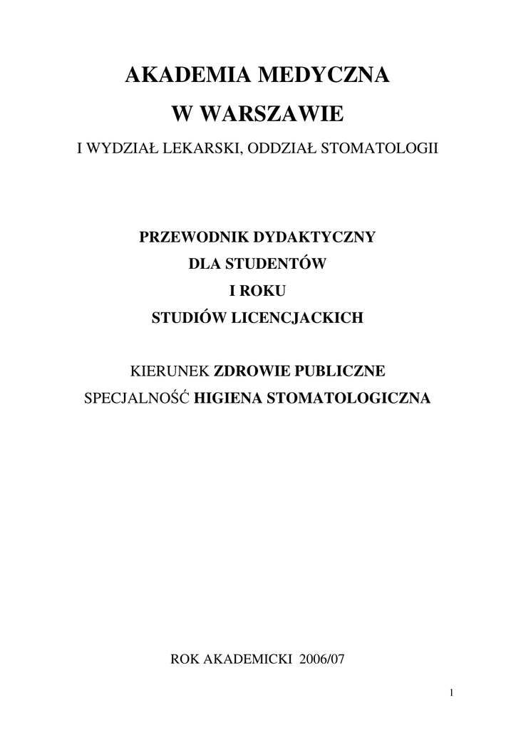 AKADEMIA MEDYCZNA W WARSZAWIE I WYDZIAŁ LEKARSKI, ODDZIAŁ STOMATOLOGII PRZEWODNIK DYDAKTYCZNY DLA STUDENTÓW I ROKU STUDIÓW LICENCJACKICH KIERUNEK ZDROWIE PUBLICZNE SPECJALNOŚĆ HIGIENA STOMATOLOGICZNA ROK AKADEMICKI 2006/07 1 WŁADZE UCZELNI i I WYDZIAŁU LEKARSKIEGO W ROKU AKADEMICKIM 2006/07 Rektor Prorektorzy - ds. Klinicznych i Inwestycji - ds. Nauki i Współpracy z Zagranicą - ds. Kadr - ds Dydaktyczno – Wychowawczych prof. Wiesław Gliński prof. Ryszarda Chazan prof. Jerzy Stelmachów prof. Piotr Zaborowski Dziekan I Wydziału Lekarskiego prof. Marek Krawczyk Prodziekan I Wydziału lekarskiego ds. Oddziału Stomatologii prof. Renata Górska Prodziekan I Wydziału Lekarskiego - ds. I/II r. Prodziekan I Wydziału Lekarskiego - ds. III/IV r. Prodziekan I Wydziału Lekarskiego - ds. V/VI r. Prodziekan I Wydziału Lekarskiego - ds. Przewodów Doktorskich Pełnomocnik Rektora - ds. Nauczania Elektroradiologii Pełnomocnik Dziekana - ds. Nauczania Higieny Stomatologicznej Pełnomocnik Dziekana - ds. Nauczania Technik Dentystycznych Sekretariat Oddziału Stomatologii: - Z-ca Kierownika Dziekanatu Prof. Leszek Pączek prof. Marek Kulus prof. Kazimierz Wardyn prof. Ireneusz Krasnodębski prof. Piotr Pruszczyk prof. Marek Gołębiowski dr hab. Sylwia Słotwińska dr hab. Leopold Wagner Jadwiga Szyperek Anna Furtak Magdalena Zawada - czynny codziennie w godz. 10:30 – 15:00 - Tel. (022) 57 20 245 lub 57 20 213 - Fax (022) 57 20 273 2 NAUKA O CZŁOWIEKU - ANATOMIA ZAKŁAD ANATOMII PRAWIDŁOWEJ CENTRUM BIOSTRUKTURY Warszawa, ul. Chałubińskiego 5, tel.628-10-41, bezp. Tel. i fax 629-52-83 e-mail : [email protected] Kierownik Zakładu: Prof. dr hab. Bogdan Ciszek Wymiar godzin: 30 godz. – wykłady / 30 godz. - ćwiczenia Odpowiedzialny za dydaktykę: dr Helena Deszczyńska Godziny przyjęć w sprawach studenckich zostaną podane do wiadomości przed rozpoczęciem zajęć. Wykłady i ćwiczenia odbywają się w I semestrze w gmachu Collegium Anatomicum Centrum Biostruktury. Ćwiczenia odbywają się w Zakładzie Anatomii Prawidłowej w salach do ćwiczeń prosektoryjnych wg grafiku podawanego do wiadomości przed rozpoczęciem zajęć. Forma zaliczenia przedmiotu Zaliczenie ćwiczeń w formie kolokwium jest jednocześnie warunkiem dopuszczenia do egzaminu. Egzamin jest testowy i obejmuje tematy ćwiczeń i wykładów. Egzamin odbywa się w sesji egzaminacyjnej zimowej. W przypadku uzyskania na egzaminie oceny niedostatecznej egzamin poprawkowy odbywa się w sesji poprawkowej zimowej. Zgodnie z regulaminem, nie zgłoszenie się na egzamin w ustalonym terminie bez usprawiedliwienia jest równoznaczne z uzyskaniem oceny niedostatecznej, którą wpisuje się do indeksu. Cel nauczania 1/ zapoznanie studentów z ogólną budową ciała ludzkiego. 2/ umożliwienie posługiwania się prawidłową i jednoznaczną nomenklaturą medyczną przy opisie części ciała człowieka, narządów i tkanek. 3/ przygotowanie podstaw morfologicznych do nauki o czynności poszczególnych narządów i tkanek. 4/zwrócenie uwagi na niektóre aspekty przydatne w udzielaniu pierwszej pomocy przed lekarskiej. Treść nauczania Treść nauczania obejmuje zagadnienia omawiane na wykładach i poznawane praktycznie na ćwiczeniach prowadzonych w pracowni dydaktycznej z użyciem modeli i preparatów muzealnych. 3 Tematy wykładów * * * * * * * * * * * * * * Budowa ciała ludzkiego: typy konstytucyjne, postawa ciała, osie i płaszczyzny, linie przeprowadzone na powierzchni ciała ludzkiego. Okolice ciała ludzkiego. Kształt i budowa wewnętrzna kości. Połączenia kości. Budowa i podział stawów. Połączenia i mechanika kręgosłupa. Połączenia kręgosłupa z czaszką. Czaszka jako całość. Budowa i czynność stawu skroniowo-żuchwowego. Okolice głowy i szyi. Mięśnie głowy i szyi. Budowa ogólna jamy ustnej. Ogólna budowa zębów mlecznych i stałych. Zgryz i zwarcie. Zaburzenia rozwojowe zębów. Uzębienie jako całość. Przyzębie. Układ mięśniowo-nerwowy narządu żucia. Gruczoły ślinowe. Droga smakowa. Rozwój jamy ustnej. Wady rozwojowe. Podział układu nerwowego. Znaczenie czynnościowe podziału. Rdzeń kręgowy – budowa ogólna. Nerw rdzeniowy. Łuk odruchowy. Kora mózgu i lokalizacja ośrodków korowych. Drogi czuciowe i ruchowe rdzenia kręgowego. Klatka piersiowa. Śródpiersie. Układ krążenia. Naczynia krążenia dużego i małego. Naczynia i węzły chłonne. Górne i dolne drogi oddechowe. Mechanika oddychania. Topografia narządów jamy brzusznej. Podział układu trawiennego. Budowa ogólna ściany przewodu pokarmowego. Wybrane zagadnienia z układu moczowo-płciowego. Tematy ćwiczeń Osteologia ogólna: kształt i budowa wewnętrzna kości. * Osteologia szczegółowa: kręgosłup, klatka piersiowa - (mostek, żebra), kości obręczy kończyny górnej - (obojczyk, łopatka), kości kończyny górnej wolnej - (kości ramienne, kości przedramienia, kości ręki), kości obręczy kończyny dolnej - (kość miedniczna), kości kończyny dolnej wolnej - (kość udowa, kości goleni, kości stopy). Kości czaszki: czołowa, ciemieniowa, potyliczna, klinowa, sitowa, skroniowa, nosowa * łzowa, podniebienna, szczęka, żuchwa, kość jarzmowa, małżowina nosowa dolna, lemiesz, kość gnykowa. Czaszka jako całość: sklepienie czaszki, powierzchnia wewnętrzna podstawy czaszki, * oczodół, jama nosowa, zatoki przynosowe. Staw skroniowo-żuchwowy. Nerwy czaszkowe – miejsca wyjścia z czaszki. Okolice głowy i szyi. Mięśnie głowy, szyi. Budowa ogólna jamy ustnej. Przedsionek * jamy ustnej, wargi, policzki, dziąsła. Zęby i uzębienie – budowa ogólna, rodzaje zębów, oznaczenie zębów. Właściwości * fizyczne i chemiczne zębów. Zęby mleczne i stałe – czas i kolejność wyrzynania się, kształt, cecha krzywizny, korzenia i kąta zębowego. Umocowanie zębów w zębodole. Uzębienie jako całość: łuki zębowe, zwarcie, zgryz. * Cechy prawidłowego zwarcia