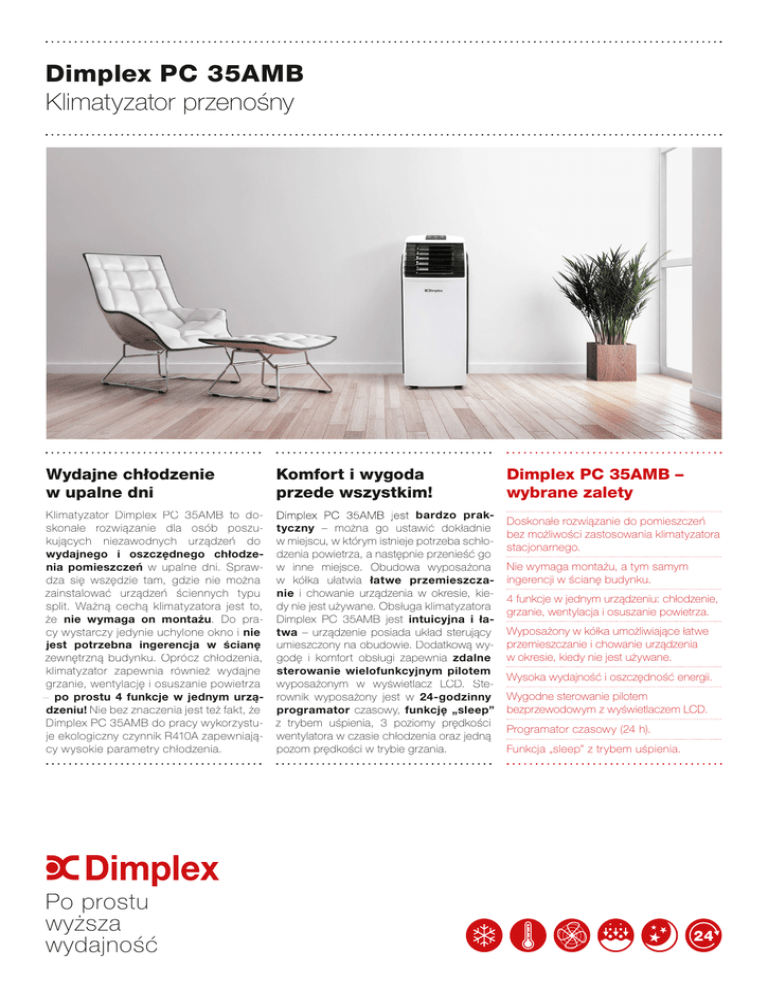 Dimplex PC 35AMB Klimatyzator przenośny Wydajne chłodzenie w upalne dni Komfort i wygoda przede wszystkim! Klimatyzator Dimplex PC 35AMB to doskonałe rozwiązanie dla osób poszukujących niezawodnych urządzeń do wydajnego i oszczędnego chłodzenia pomieszczeń w upalne dni. Sprawdza się wszędzie tam, gdzie nie można zainstalować urządzeń ściennych typu split. Ważną cechą klimatyzatora jest to, że nie wymaga on montażu. Do pracy wystarczy jedynie uchylone okno i nie jest potrzebna ingerencja w ścianę zewnętrzną budynku. Oprócz chłodzenia, klimatyzator zapewnia również wydajne grzanie, wentylację i osuszanie powietrza – po prostu 4 funkcje w jednym urządzeniu! Nie bez znaczenia jest też fakt, że Dimplex PC 35AMB do pracy wykorzystuje ekologiczny czynnik R410A zapewniający wysokie parametry chłodzenia. Dimplex PC 35AMB jest bardzo praktyczny – można go ustawić dokładnie w miejscu, w którym istnieje potrzeba schłodzenia powietrza, a następnie przenieść go w inne miejsce. Obudowa wyposażona w kółka ułatwia łatwe przemieszczanie i chowanie urządzenia w okresie, kiedy nie jest używane. Obsługa klimatyzatora Dimplex PC 35AMB jest intuicyjna i łatwa – urządzenie posiada układ sterujący umieszczony na obudowie. Dodatkową wygodę i komfort obsługi zapewnia zdalne sterowanie wielofunkcyjnym pilotem wyposażonym w wyświetlacz LCD. Sterownik wyposażony jest w 24-godzinny programator czasowy, funkcję „sleep” z trybem uśpienia, 3 poziomy prędkości wentylatora w czasie chłodzenia oraz jedną pozom prędkości w trybie grzania. Po prostu wyższa wydajność Dimplex PC 35AMB – wybrane zalety Doskonałe rozwiązanie do pomieszczeń bez możliwości zastosowania klimatyzatora stacjonarnego. Nie wymaga montażu, a tym samym ingerencji w ścianę budynku. 4 funkcje w jednym urządzeniu: chłodzenie, grzanie, wentylacja i osuszanie powietrza. Wyposażony w kółka umożliwiające łatwe przemieszczanie i chowanie urządzenia w okresie, kiedy nie jest używane. Wysoka wydajność i oszczędność energii. Wygodne sterowanie pilotem bezprzewodowym z wyświetlaczem LCD. Programator czasowy (24 h). Funkcja „sleep” z trybem uśpienia. Edited with the trial version of Foxit Advanced PDF Editor Model Dimplex PC 35AMB Zasilanie 220-240V ~50 Hz Moc znamionowa (chłodzenie)* 1480 W Moc znamionowa (ogrzewanie)* 1300 W Wydajność chłodzenia 3500 W Wydajność grzania 3500 W Wydajność osuszania ok. 60 l/dobę Czynnik chłodniczy R410A Przepływ powietrza 450 m 3 Maksymalny poziom hałasu 65 dBA Zakres temperatur (chłodzenie) 17-30°C Zakres temperatur (grzanie) 15-25°C Timer 24 h Wymiary (szer. x gł. x wys.) 300 x 505 x 778 mm Masa 29,5 kg Czynnik chłodniczy R410A Długość / średnica przewodu odprowadzającego ciepłe powietrze 135 / 15 cm Długość kabla zasilającego 1,82 m Stopnie prędkości wentylatora w trybie chłodzenia 3 Stopnie prędkości wentylatora w trybie grzania 1 Wodoodporność IPX4 * EN 60335 Projekt nr 097/01. Zastrzegamy sobie prawo do zmian i odstępstw w kolorach. Dimplex PC 35AMB – dane techniczne To remove this notice, visit: www.foxitsoftware.com/shopping