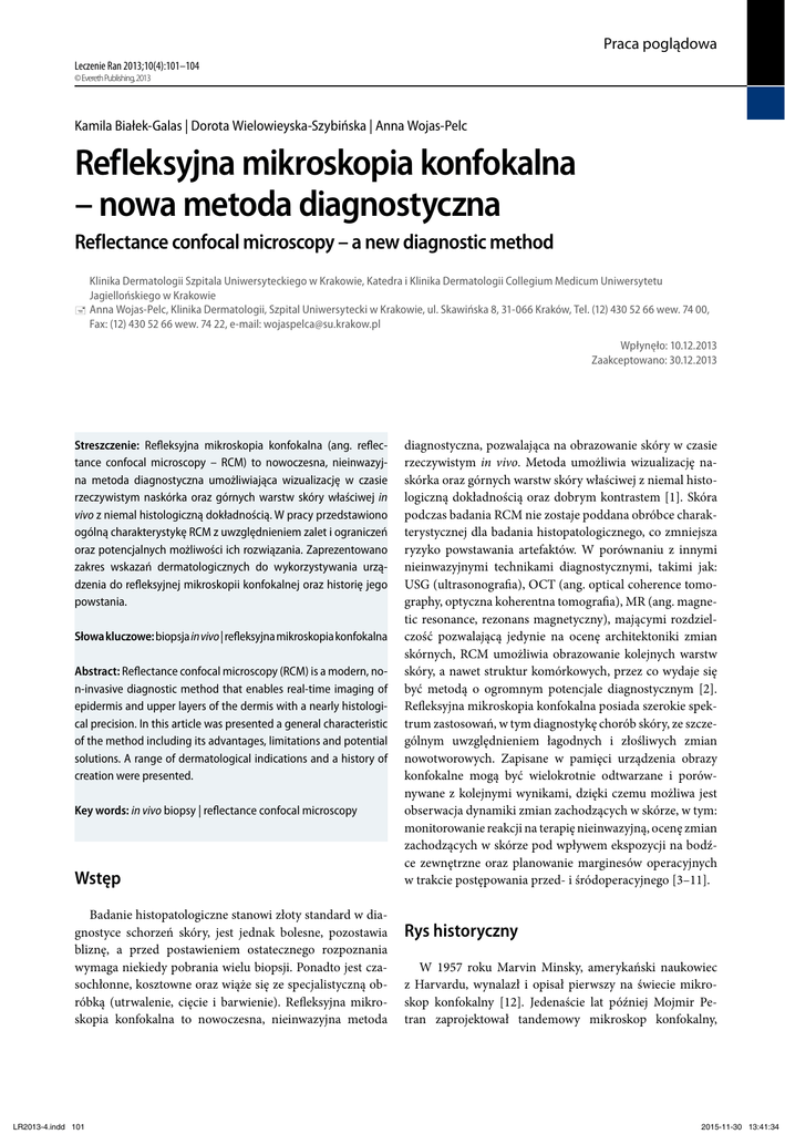 Praca poglądowa Leczenie Ran 2013;10(4):101–104 © Evereth Publishing, 2013 Kamila Białek-Galas | Dorota Wielowieyska-Szybińska | Anna Wojas-Pelc Refleksyjna mikroskopia konfokalna – nowa metoda diagnostyczna Reflectance confocal microscopy – a new diagnostic method Klinika Dermatologii Szpitala Uniwersyteckiego w Krakowie, Katedra i Klinika Dermatologii Collegium Medicum Uniwersytetu Jagiellońskiego w Krakowie }} Anna Wojas-Pelc, Klinika Dermatologii, Szpital Uniwersytecki w Krakowie, ul. Skawińska 8, 31-066 Kraków, Tel. (12) 430 52 66 wew. 74 00, Fax: (12) 430 52 66 wew. 74 22, e-mail: [email protected] Wpłynęło: 10.12.2013 Zaakceptowano: 30.12.2013 Streszczenie: Refleksyjna mikroskopia konfokalna (ang. reflectance confocal microscopy – RCM) to nowoczesna, nieinwazyjna metoda diagnostyczna umożliwiająca wizualizację w czasie rzeczywistym naskórka oraz górnych warstw skóry właściwej in vivo z niemal histologiczną dokładnością. W pracy przedstawiono ogólną charakterystykę RCM z uwzględnieniem zalet i ograniczeń oraz potencjalnych możliwości ich rozwiązania. Zaprezentowano zakres wskazań dermatologicznych do wykorzystywania urządzenia do refleksyjnej mikroskopii konfokalnej oraz historię jego powstania. Słowa kluczowe: biopsja in vivo | refleksyjna mikroskopia konfokalna Abstract: Reflectance confocal microscopy (RCM) is a modern, non-invasive diagnostic method that enables real-time imaging of epidermis and upper layers of the dermis with a nearly histological precision. In this article was presented a general characteristic of the method including its advantages, limitations and potential solutions. A range of dermatological indications and a history of creation were presented. Key words: in vivo biopsy | reflectance confocal microscopy Wstęp Badanie histopatologiczne stanowi złoty standard w diagnostyce schorzeń skóry, jest jednak bolesne, pozostawia bliznę, a przed postawieniem ostatecznego rozpoznania wymaga niekiedy pobrania wielu biopsji. Ponadto jest czasochłonne, kosztowne oraz wiąże się ze specjalistyczną obróbką (utrwalenie, cięcie i barwienie). Refleksyjna mikroskopia konfokalna to nowoczesna, nieinwazyjna metoda LR2013-4.indd 101 diagnostyczna, pozwalająca na obrazowanie skóry w czasie rzeczywistym in vivo. Metoda umożliwia wizualizację naskórka oraz górnych warstw skóry właściwej z niemal histologiczną dokładnością oraz dobrym kontrastem [1]. Skóra podczas badania RCM nie zostaje poddana obróbce charakterystycznej dla badania histopatologicznego, co zmniejsza ryzyko powstawania artefaktów. W porównaniu z innymi nieinwazyjnymi technikami diagnostycznymi, takimi jak: USG (ultrasonografia), OCT (ang. optical coherence tomography, optyczna koherentna tomografia), MR (ang. magnetic resonance, rezonans magnetyczny), mającymi rozdzielczość pozwalającą jedynie na ocenę architektoniki zmian skórnych, RCM umożliwia obrazowanie kolejnych warstw skóry, a nawet struktur komórkowych, przez co wydaje się być metodą o ogromnym potencjale diagnostycznym [2]. Refleksyjna mikroskopia konfokalna posiada szerokie spektrum zastosowań, w tym diagnostykę chorób skóry, ze szczególnym uwzględnieniem łagodnych i złośliwych zmian nowotworowych. Zapisane w pamięci urządzenia obrazy konfokalne mogą być wielokrotnie odtwarzane i porównywane z kolejnymi wynikami, dzięki czemu możliwa jest obserwacja dynamiki zmian zachodzących w skórze, w tym: monitorowanie reakcji na terapię nieinwazyjną, ocenę zmian zachodzących w skórze pod wpływem ekspozycji na bodźce zewnętrzne oraz planowanie marginesów operacyjnych w trakcie postępowania przed- i śródoperacyjnego [3–11]. Rys historyczny W 1957 roku Marvin Minsky, amerykański naukowiec z Harvardu, wynalazł i opisał pierwszy na świecie mikroskop konfokalny [12]. Jedenaście lat później Mojmir Petran zaprojektował tandemowy mikroskop konfokalny, 2015-11-30 13:41:34 Leczenie Ran 2013;10(4) umożliwiający optyczne sekcjonowanie tkanki w czasie rzeczywistym [13]. Pierwsze badania z wykorzystaniem urządzenia prowadzono in vitro, a jako źródło światła stosowano lampę rtęciową. Dzięki mającemu miejsce w latach 80. XX wieku postępowi techniki – w tym rozwojowi nowych metod oświetlenia, skanowania i komputeryzacji – nastąpiło udoskonalenie mikroskopii konfokalnej, pozwalające na zastosowanie metody do obrazowania tkanek in vivo. Kilka grup badawczych wykorzystało urządzenie do obrazowania ludzkich oraz zwierzęcych tkanek in vivo i ex vivo, demonstrując szczegółowe obrazy komórkowe: zębów, rogówki, nerki, wątroby, tarczycy, gruczołów nadnerczy, mięśni oraz tkanki łącznej [14–17]. W latach 90. XX wieku rozpoczęto pracę nad zastosowaniem mikroskopii konfokalnej do obrazowania struktury ludzkiej skóry [18–20]. W 1995 roku Rajadhyaksha i wsp. skonstruowali przełomowy prototyp laserowego mikroskopu konfokalnego, pozwalający na wizualizację w czasie rzeczywistym ludzkiej skóry in vivo [21]. W 1999 roku zaprezentowano udoskonalone urządzenie, posiadające lepszą rozdzielczość, kontrast oraz większą głębokość obrazowania [1]. W 2008 roku powstała międzynarodowa grupa ekspercka ds. refleksyjnej mikroskopii konfokalnej [22]. W jej skład wchodzą naukowcy i lekarze wykorzystujący RCM do diagnostyki oraz monitoringu postępów leczenia w dermatologii. Ich celem jest rozpowszechnianie zastosowania refleksyjnej mikroskopii konfokalnej w dermatologii, zapewnienie możliwości współpracy i dyskusji na temat wyników badania, a także dydaktyka. Charakterystyka metody refleksyjnej mikroskopii konfokalnej Głównym założeniem RCM jest eliminacja obrazów pochodzących spoza płaszczyzny ogniskowania, co w znaczący sposób poprawia kontrast oraz jakość uzyskanego obrazu. W tym celu do podświetlenia fragmentu tkanki wykorzystuje się punktowe źródło światła, którego wiązka skupia się dokładnie okre