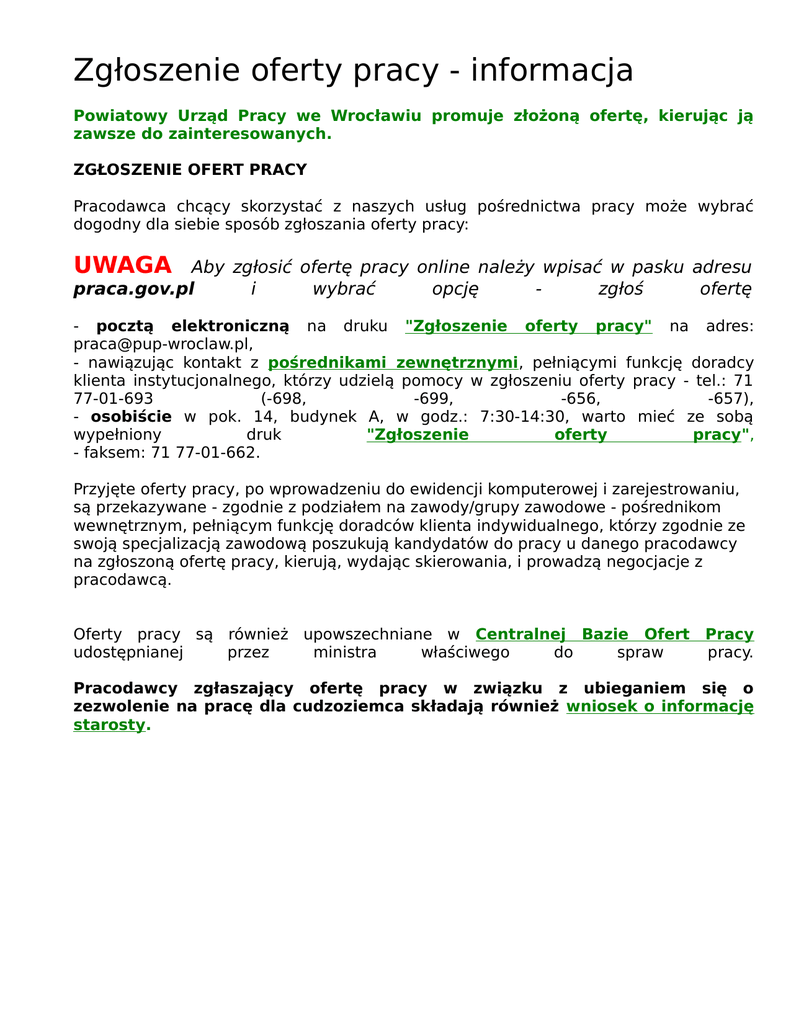Zgłoszenie oferty pracy - informacja Powiatowy Urząd Pracy we Wrocławiu promuje złożoną ofertę, kierując ją zawsze do zainteresowanych. ZGŁOSZENIE OFERT PRACY Pracodawca chcący skorzystać z naszych usług pośrednictwa pracy może wybrać dogodny dla siebie sposób zgłoszania oferty pracy: UWAGA Aby zgłosić ofertę pracy online należy wpisać w pasku adresu praca.gov.pl i wybrać opcję zgłoś ofertę - pocztą elektroniczną na druku "Zgłoszenie oferty pracy" na adres: [email protected], - nawiązując kontakt z pośrednikami zewnętrznymi, pełniącymi funkcję doradcy klienta instytucjonalnego, którzy udzielą pomocy w zgłoszeniu oferty pracy - tel.: 71 77-01-693 (-698, -699, -656, -657), - osobiście w pok. 14, budynek A, w godz.: 7:30-14:30, warto mieć ze sobą wypełniony druk "Zgłoszenie oferty pracy", - faksem: 71 77-01-662. Przyjęte oferty pracy, po wprowadzeniu do ewidencji komputerowej i zarejestrowaniu, są przekazywane - zgodnie z podziałem na zawody/grupy zawodowe - pośrednikom wewnętrznym, pełniącym funkcję doradców klienta indywidualnego, którzy zgodnie ze swoją specjalizacją zawodową poszukują kandydatów do pracy u danego pracodawcy na zgłoszoną ofertę pracy, kierują, wydając skierowania, i prowadzą negocjacje z pracodawcą. Oferty pracy są również upowszechniane w Centralnej Bazie Ofert udostępnianej przez ministra właściwego do spraw Pracy pracy. Pracodawcy zgłaszający ofertę pracy w związku z ubieganiem się o zezwolenie na pracę dla cudzoziemca składają również wniosek o informację starosty.