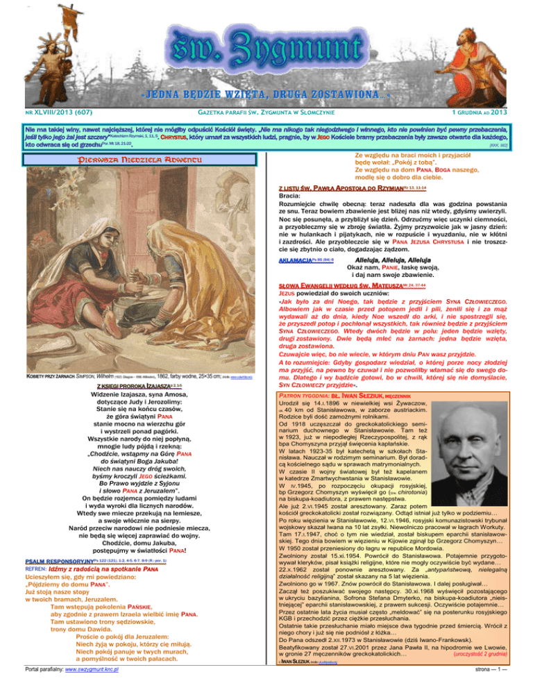 »JEDNA BĘDZIE WZIĘTA, DRUGA ZOSTAWIONA…« NR XLVIII/2013 (607) GAZETKA PARAFII ŚW. ZYGMUNTA W SŁOMCZYNIE 1 GRUDNIA AD 2013 Nie ma takiej winy, nawet najcięższej, której nie mógłby odpuścić Kościół święty. „Nie ma nikogo tak niegodziwego i winnego, kto nie powinien być pewny przebaczenia, jeśli tylko jego żal jest szczery”Katechizm Rzymski, 1, 11, 5. CHRYSTUS, który umarł za wszystkich ludzi, pragnie, by w JEGO Kościele bramy przebaczenia były zawsze otwarte dla każdego, kto odwraca się od grzechuPor. Mt 18, 21-22. [KKK, 982] Ze względu na braci moich i przyjaciół będę wołał: „Pokój z tobą”. Ze względu na dom PANA, BOGA naszego, modlę się o dobro dla ciebie. PIERWSZA NIEDZIELA ADWENTU Z LISTU ŚW. PAWŁA APOSTOŁA DO RZYMIANRz 13, 11-14 Bracia: Rozumiejcie chwilę obecną: teraz nadeszła dla was godzina powstania ze snu. Teraz bowiem zbawienie jest bliżej nas niż wtedy, gdyśmy uwierzyli. Noc się posunęła, a przybliżył się dzień. Odrzućmy więc uczynki ciemności, a przyobleczmy się w zbroję światła. Żyjmy przyzwoicie jak w jasny dzień: nie w hulankach i pijatykach, nie w rozpuście i wyuzdaniu, nie w kłótni i zazdrości. Ale przyobleczcie się w PANA JEZUSA CHRYSTUSA i nie troszczcie się zbytnio o ciało, dogadzając żądzom. AKLAMACJAPs 85 (84) 8 Alleluja, Alleluja, Alleluja Okaż nam, PANIE, łaskę swoją, i daj nam swoje zbawienie. SŁOWA EWANGELII WEDŁUG ŚW. MATEUSZAMt 24, 37-44 KOBIETY PRZY ŻARNACH: SIMPSON, Wilhelm (1823, Glasgow – 1899, Willesden), 1862, farby wodne, 25×35 cm; źródło: www.columbia.edu Z KSIĘGI PROROKA IZAJASZAIz 2, 1-5 Widzenie Izajasza, syna Amosa, dotyczące Judy i Jerozolimy: Stanie się na końcu czasów, że góra świątyni PANA stanie mocno na wierzchu gór i wystrzeli ponad pagórki. Wszystkie narody do niej popłyną, mnogie ludy pójdą i rzekną: „Chodźcie, wstąpmy na Górę PANA do świątyni Boga Jakuba! Niech nas nauczy dróg swoich, byśmy kroczyli JEGO ścieżkami. Bo Prawo wyjdzie z Syjonu i słowo PANA z Jeruzalem”. On będzie rozjemcą pomiędzy ludami i wyda wyroki dla licznych narodów. Wtedy swe miecze przekują na lemiesze, a swoje włócznie na sierpy. Naród przeciw narodowi nie podniesie miecza, nie będą się więcej zaprawiać do wojny. Chodźcie, domu Jakuba, postępujmy w światłości PANA! PSALM RESPONSORYJNYPs 122 (121), 1-2. 4-5. 6-7. 8-9 (R.: por. 1) Idźmy z radością na spotkanie PANA Ucieszyłem się, gdy mi powiedziano: „Pójdziemy do domu PANA”. Już stoją nasze stopy w twoich bramach, Jeruzalem. Tam wstępują pokolenia PAŃSKIE, aby zgodnie z prawem Izraela wielbić imię PANA. Tam ustawiono trony sędziowskie, trony domu Dawida. Proście o pokój dla Jeruzalem: Niech żyją w pokoju, którzy cię miłują. Niech pokój panuje w twych murach, a pomyślność w twoich pałacach. REFREN: Portal parafialny: www.swzygmunt.knc.pl JEZUS powiedział do swoich uczniów: »Jak było za dni Noego, tak będzie z przyjściem SYNA CZŁOWIECZEGO. Albowiem jak w czasie przed potopem jedli i pili, żenili się i za mąż wydawali aż do dnia, kiedy Noe wszedł do arki, i nie spostrzegli się, że przyszedł potop i pochłonął wszystkich, tak również będzie z przyjściem SYNA CZŁOWIECZEGO. Wtedy dwóch będzie w polu: jeden będzie wzięty, drugi zostawiony. Dwie będą mleć na żarnach: jedna będzie wzięta, druga zostawiona. Czuwajcie więc, bo nie wiecie, w którym dniu PAN wasz przyjdzie. A to rozumiejcie: Gdyby gospodarz wiedział, o której porze nocy złodziej ma przyjść, na pewno by czuwał i nie pozwoliłby włamać się do swego domu. Dlatego i wy bądźcie gotowi, bo w chwili, której się nie domyślacie, SYN CZŁOWIECZY przyjdzie«. PATRON TYGODNIA: BŁ. IWAN SŁEZIUK, MĘCZENNIK Urodził się 14.I.1896 w niewielkiej wsi Żywaczow, ok. 40 km od Stanisławowa, w zaborze austriackim. Rodzice byli dość zamożnymi rolnikami. Od 1918 uczęszczał do greckokatolickiego seminarium duchownego w Stanisławowie. Tam też w 1923, już w niepodległej Rzeczypospolitej, z rąk bpa Chomyszyna przyjął święcenia kapłańskie. W latach 1923-35 był katechetą w szkołach Stanisława. Nauczał w rodzimym seminarium. Był doradcą kościelnego sądu w sprawach matrymonialnych. W czasie II wojny światowej był też kapelanem w katedrze Zmartwychwstania w Stanisławowie. W IV.1945, po rozpoczęciu okupacji rosyjskiej, bp Grzegorz Chomyszyn wyświęcił go (tzw. chirotonia) na biskupa-koadiutora, z prawem następstwa. Ale już 2.VI.1945 został aresztowany. Zaraz potem kościół greckokatolicki został rozwiązany. Odtąd istniał już tylko w podziemiu… Po roku więzienia w Stanisławowie, 12.VI.1946, rosyjski komunazistowski trybunał wojskowy skazał Iwana na 10 lat zsyłki. Niewolniczo pracował w łagrach Workuty. Tam 17.I.1947, choć o tym nie wiedział, został biskupem eparchii stanisławowskiej. Tego dnia bowiem w więzieniu w Kijowie zginął bp Grzegorz Chomyszyn… W 1950 został przeniesiony do łagru w republice Mordowia. Zwolniony został 15.xi.1954. Powrócił do Stanisławowa. Potajemnie przygotowywał kleryków, pisał książki religijne, które nie mogły oczywiście być wydane… 22.X.1962 został ponownie aresztowany. Za „antypaństwową, nielegalną działalność religijną” został skazany na 5 lat więzienia. Zwolniono go w 1967. Znów powrócił do Stanisławowa. I dalej posługiwał… Zaczął też poszukiwać swojego następcy. 30.xi.1968 wyświęcił pozostającego w ukryciu bazylianina, Sofrona Stefana Dmyterko, na biskupa-koadiutora „nieistniejącej” eparchii stanisławowskiej, z prawem sukcesji. Oczywiście potajemnie… Przez ostatnie lata życia musiał często „meldować” się na posterunku rosyjskiego KGB i przechodzić przez ciężkie przesłuchania. Ostatnie takie przesłuchanie miało miejsce dwa tygodnie przed śmiercią. Wrócił z niego chory i już się nie podniósł z łóżka