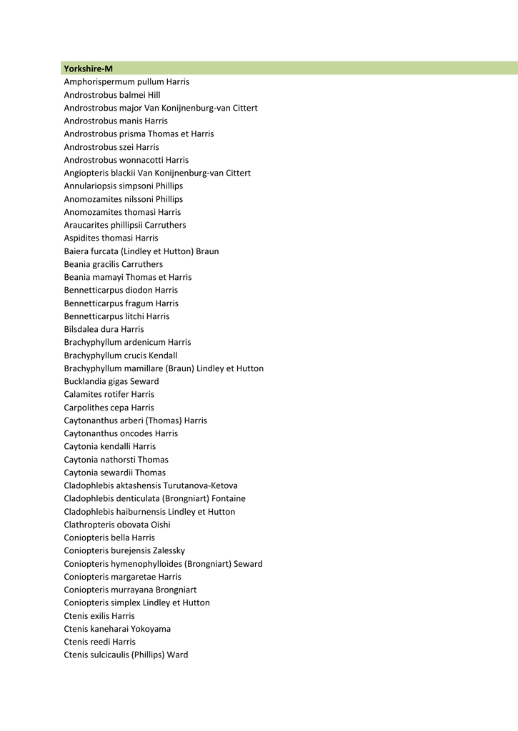 Yorkshire-M Amphorispermum pullum Harris Androstrobus balmei Hill Androstrobus major Van Konijnenburg-van Cittert Androstrobus manis Harris Androstrobus prisma Thomas et Harris Androstrobus szei Harris Androstrobus wonnacotti Harris Angiopteris blackii Van Konijnenburg-van Cittert Annulariopsis simpsoni Phillips Anomozamites nilssoni Phillips Anomozamites thomasi Harris Araucarites phillipsii Carruthers Aspidites thomasi Harris Baiera furcata (Lindley et Hutton) Braun Beania gracilis Carruthers Beania mamayi Thomas et Harris Bennetticarpus diodon Harris Bennetticarpus fragum Harris Bennetticarpus litchi Harris Bilsdalea dura Harris Brachyphyllum ardenicum Harris Brachyphyllum crucis Kendall Brachyphyllum mamillare (Braun) Lindley et Hutton Bucklandia gigas Seward Calamites rotifer Harris Carpolithes cepa Harris Caytonanthus arberi (Thomas) Harris Caytonanthus oncodes Harris Caytonia kendalli Harris Caytonia nathorsti Thomas Caytonia sewardii Thomas Cladophlebis aktashensis Turutanova-Ketova Cladophlebis denticulata (Brongniart) Fontaine Cladophlebis haiburnensis Lindley et Hutton Clathropteris obovata Oishi Coniopteris bella Harris Coniopteris burejensis Zalessky Coniopteris hymenophylloides (Brongniart) Seward Coniopteris margaretae Harris Coniopteris murrayana Brongniart Coniopteris simplex Lindley et Hutton Ctenis exilis Harris Ctenis kaneharai Yokoyama Ctenis reedi Harris Ctenis sulcicaulis (Phillips) Ward Ctenozamites cycadea Berger Ctenozamites leckenbyi (Leckenby) Nathorst Ctenozamites megalostoma Harris Cycadolepis eriphorus Harris Cycadolepis hallei Harris Cycadolepis hypene Harris Cycadolepis nitens Harris Cycadolepis pelecus Harris Cycadolepis spheniscus Harris Cycadolepis stenopus Harris Cycadolepis thysanota Harris Cyparisidium blachii Harris Cyparisidium rudlandicum Harris Czekanowskia blackii Harris Czekanowskia furcula Harris et Miller Czekanowskia microphylla Phillips Czekanowskia thomasii Harris Deltolepis calyptera Harris Deltolepis crepidota Harris Deltolepis mitra Harris Desmiophyllum gramineum Harris Dicksonia kendalli Harris Dicksonia mariopteris Wilson et Yates Dictyophyllum rugosum Lindley et Hutton Dictyozamites hawelli Seward Eboracia lobifolia (Philips) Thomas (Dicksonia lobifolia Phillips) Elatides thomassi Harris Elatides williamsonii (Lindley et Hutton) Nathorst Elatocladus laxus Phillips Elatocladus ramosus (Florin) Harris Elatocladus setosus (Phillips) Harris Elatocladus sideriticus Bose Elatocladus zamioides (Leckenby) Seward Equisetites lateralis (Phillips) Gould (Equisetum laterale Phillips ) Equisetum beani Bunbury Equisetum columnare Brongniart Eretmophyllum pubescens Thomas Eretmophyllum whitbiense Thomas Geinitzia divaricata (Bunbury) Harris Geinitzia rigida (Phillips) Harris Ginkgo digitata Brongniart Ginkgo huttoni (Sternberg) Heer Ginkgo longifolius (Phillips) Harris Ginkgo sibirica Heer Ginkgo whitbiensis Harris Hastyostrobus muirii Van Konijnenburg-van Cittert Hausmannia dichotoma Dunk Hepaticites arcuatus Lindley et Hutton Hepaticites haiburnensis Harris Hepaticites hymenoptera Harris Hepaticites wonnacotti Harris Hirmeriella estonensis (Kendall) Harris Hirmeriella kendaliae Harris Hirmeriella maculosum (Kendall) Van Konijnenburg-van Cittert (Pagiophyllum maculosum Kendall) Ixostrobus whitbiensis Harris Klukia exilis (Phillips) Raciborski Kylikipteris arguta Lindley et Hutton Leptostrobus cancer Harris Lindleycladus lanceolatus (Lindley et Hutton) Harris Marattia anglica Thomas Marskea jurassica (Florin) Harris Matonia braunii (Göppert) Harris Matonidium goepperti (Ettingshausen) Schenk Neocalamites hoerensis Schimper Neocalamites nathorsti Erdtman Nilssonia compta (Phillips) Brongniart Nilssonia kendalli Harris Nilssonia revoluta Harris Nilssonia syllis Harris Nilssonia tenuicaulis (Philips) Fox-Straggways Nilssonia tenuinervis Seward Nilssoniopteris major Lindley et Hutton Nilssoniopteris pristis Harris Nilssoniopteris vittata Brongniart Osmundopsis hillii Van Konijnenburg-van Cittert Osmundopsis sturi (Raciborski) Harris Otozamites anglica Seward Otozamites beani (Brongniart) Lindley et Hutton Otozamites falsus Harris Otozamites gramineus (Brongniart) Phillips Otozamites graphicus (Brongniart) Leckenby Otozamites leckenbyi Harris Otozamites marginatus Saporta Otozamites mimetes Harris Otozamites parallelus Philips Otozamites penna Harris Otozamites simpsoni Harris Otozamites tenuatus Leckenby Otozamites thomasi Harris Otozamites venosus Harris Pachypteris lanceolata Brongniart Pachypteris papillosa (Thomas et Bose) Harris Pagiophyllum fragilis (Bose) Harris Pagiophyllum insigne Kendall Pagiophyllum kurrii (Schimper) Salfeld Pagiophyllum ordinatum Kendall Paracycas ctenis Harris Phlebopteris dunkeri Schenk Phlebopteris polypodioides Brongniart Phlebopteris woodwardi Leckenby Pityanthus scalbergensis Van Konijnenburg-van Cittert Pityocladus scarburgensis Harris Poteridion hallei Harris Pseudoctenis herriesi Harris Pseudoctenis lanei Thomas Pseudoctenis locusta Harris Pseudoctenis oleosa Harris Pseudotorellia tibia Harris Pteroma thomasi Harris Pterophyllum cycadites Harris et Rest Pterophyllum fossum Harris Pterophyllum thomasii Harris Ptilophyllum hirsutum Thomas et Bancroft Ptilophyllum pecten Phillips Ptilophyllum pectinoides Phillips Rhaphidopteris nana (Harris) Barale (Stenopteris nana Harris) Rhaphidopteris williamsonis (Brongniart) Barale (Stenopteris williamsonis (Brongniart) Harris) Sagenopteris colpodes Harris Sagenopteris phillipsii Brongniart Scarburgia hillii Harris Schizolepis liasokeuperiana Braun Schizoneura stenophylla Harris Selaginellites falcatus (Lindley et Hutton) Schweitzer, Van Konijnenburg-van Cittert et Van der Burgh (Lycopodites falc Solenites vimineus (Phillips) Harris Sphenarion muiriae Harris Sphenobaiera gyron Harris Sphenobaiera longifolia (Pomel) Florin Sphenobaiera ophioglossum Harris Sphenobaiera pecten Harris Sphenopteris metzgerioides Harris Stachypteris spicans Pomel Thallites sp. Todites denticulatus B