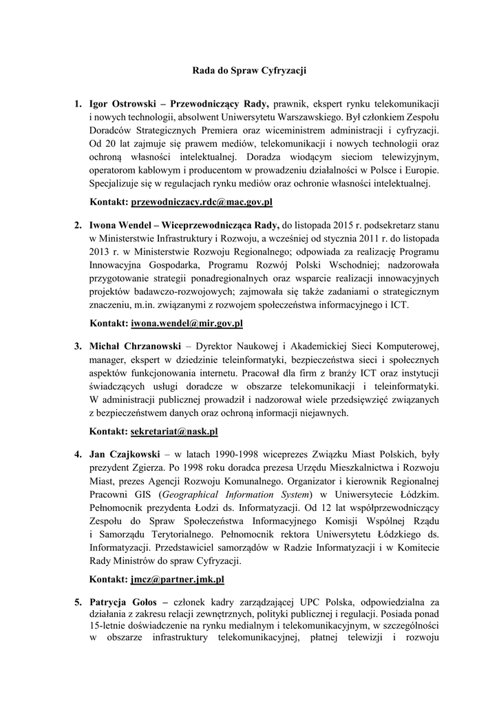Rada do Spraw Cyfryzacji 1. Igor Ostrowski – Przewodniczący Rady, prawnik, ekspert rynku telekomunikacji i nowych technologii, absolwent Uniwersytetu Warszawskiego. Był członkiem Zespołu Doradców Strategicznych Premiera oraz wiceministrem administracji i cyfryzacji. Od 20 lat zajmuje się prawem mediów, telekomunikacji i nowych technologii oraz ochroną własności intelektualnej. Doradza wiodącym sieciom telewizyjnym, operatorom kablowym i producentom w prowadzeniu działalności w Polsce i Europie. Specjalizuje się w regulacjach rynku mediów oraz ochronie własności intelektualnej. Kontakt: [email protected] 2. Iwona Wendel – Wiceprzewodnicząca Rady, do listopada 2015 r. podsekretarz stanu w Ministerstwie Infrastruktury i Rozwoju, a wcześniej od stycznia 2011 r. do listopada 2013 r. w Ministerstwie Rozwoju Regionalnego; odpowiada za realizację Programu Innowacyjna Gospodarka, Programu Rozwój Polski Wschodniej; nadzorowała przygotowanie strategii ponadregionalnych oraz wsparcie realizacji innowacyjnych projektów badawczo-rozwojowych; zajmowała się także zadaniami o strategicznym znaczeniu, m.in. związanymi z rozwojem społeczeństwa informacyjnego i ICT. Kontakt: [email protected] 3. Michał Chrzanowski – Dyrektor Naukowej i Akademickiej Sieci Komputerowej, manager, ekspert w dziedzinie teleinformatyki, bezpieczeństwa sieci i społecznych aspektów funkcjonowania internetu. Pracował dla firm z branży ICT oraz instytucji świadczących usługi doradcze w obszarze telekomunikacji i teleinformatyki. W administracji publicznej prowadził i nadzorował wiele przedsięwzięć związanych z bezpieczeństwem danych oraz ochroną informacji niejawnych. Kontakt: [email protected] 4. Jan Czajkowski – w latach 1990-1998 wiceprezes Związku Miast Polskich, były prezydent Zgierza. Po 1998 roku doradca prezesa Urzędu Mieszkalnictwa i Rozwoju Miast, prezes Agencji Rozwoju Komunalnego. Organizator i kierownik Regionalnej Pracowni GIS (Geographical Information System) w Uniwersytecie Łódzkim. Pełnomocnik prezydenta Łodzi ds. Informatyzacji. Od 12 lat współprzewodniczący Zespołu do Spraw Społeczeństwa Informacyjnego Komisji Wspólnej Rządu i Samorządu Terytorialnego. Pełnomocnik rektora Uniwersytetu Łódzkiego ds. Informatyzacji. Przedstawiciel samorządów w Radzie Informatyzacji i w Komitecie Rady Ministrów do spraw Cyfryzacji. Kontakt: [email protected] 5. Patrycja Gołos – członek kadry zarządzającej UPC Polska, odpowiedzialna za działania z zakresu relacji zewnętrznych, polityki publicznej i regulacji. Posiada ponad 15-letnie doświadczenie na rynku medialnym i telekomunikacyjnym, w szczególności w obszarze infrastruktury telekomunikacyjnej, płatnej telewizji i rozwoju nowoczesnych usług cyfrowych. Od lat zaangażowana na rzecz promocji kompetencji cyfrowych, przedsiębiorczości oraz konkurencyjnej gospodarki. Jest wiceprezesem Polskiej Izby Komunikacji Elektronicznej (PIKE), współprzewodniczy Komitetowi ds. Gospodarki Cyfrowej Amerykańskiej Izby Handlowej w Polsce oraz zasiada w zarządzie Związku Pracodawców Prywatnych Mediów Konfederacji Lewiatan. Kontakt: [email protected] 6. Adam Góral – Prezes Zarządu Asseco Poland S.A., największej polskiej spółki informatycznej notowanej na Giełdzie Papierów Wartościowych w Warszawie. Kontakt: [email protected] 7. Piotr Kabaj – założyciel jednej z pierwszych polskich wytwórni muzycznych, współzałożyciel Związku Producentów Audio Video, od ponad dwudziestu lat działa na rynku produkcji i dystrybucji muzyki polskiej i zagranicznej, także w sieci. Działa na rzecz korzystania z legalnych źródeł kultury w cyfrowym świecie, obecnie prezes Warner Music na Europę Wschodnią. Kontakt: [email protected] 8. Lidia Kołucka-Żuk – prawniczka, ekspertka do spraw administracji i prawa pracy. Była dyrektor CEE Trust na Polskę, organizacji powołanej w 2001 roku przez Atlantic Philanthropies, Charles Stewart Mott Foundation, Ford Foundation, German Marshall Fund of the United States, Open Society Institute, Rockefeller Brothers Fund w celu wspierania rozwoju demokracji w Polsce. Członkini zespołu Doradców Strategicznych Premiera. Kontakt: [email protected] 9. Jarosław Lipszyc – prezes Fundacji Nowoczesna Polska, członek prezydium Koalicji Otwartej Edukacji, członek komitetu Obywateli Kultury, współzałożyciel stowarzyszenia im. Stanisława Brzozowskiego, członek komisji rewizyjnej Internet Society Polska. Autor koncepcji portalu „Włącz Polskę” Ministerstwa Edukacji Narodowej. Kontakt: [email protected] 10. Mariusz Madejczyk – pełnomocnik wojewody podlaskiego ds. informatyzacji, dyrektor Biura Informatyki Podlaskiego Urzędu Wojewódzkiego w Białymstoku. Od 1998 roku pracownik administracji rządowej. Zajmuje się działaniami związanymi z propagowaniem i wdrażaniem rozwiązań w zakresie e-administracji. Kontakt: [email protected] 11. Grzegorz Sibiga – kierownik Zakładu Prawa Administracyjnego w Instytucie Nauk Prawnych Polskiej Akademii Nauk, ekspert w kwestiach dotyczących ochrony danych osobowych, prawa do informacji, informatyzacji urzędów (e-urząd). Kontakt: [email protected] 12. Dominik Skoczek – radca prawny, ekspert w zakresie prawa autorskiego i mediów, doradca zarządu Stowarzyszenia Kreatywna Polska, były dyrektor Departamentu Prawnego, a później nowo powstałego Departamentu Własności Intelektualnej i Mediów w Ministerstwie Kultury i Dziedzictwa Narodowego. W trakcie Prezydencji Polski w Unii Europejskiej koordynował prace grup roboczych Rady UE w obszarze polityki audiowizualnej i prawa autorskiego. Kontakt: [email protected] 13. Krzysztof Szubert – Polski przedsiębiorca, Prezes Zarządu CONNECT DISTRIBUTION sp. z o.o., Minister do spraw Cyfryzacji Gospodarczego Gabinetu Cieni Business Centre Club (BCC), Ekspert Narodowego Centrum Badań i Rozwoju (NCBiR) oraz BCC, Laureat wielu prestiżowych nagród i wyróżnień, m.in.