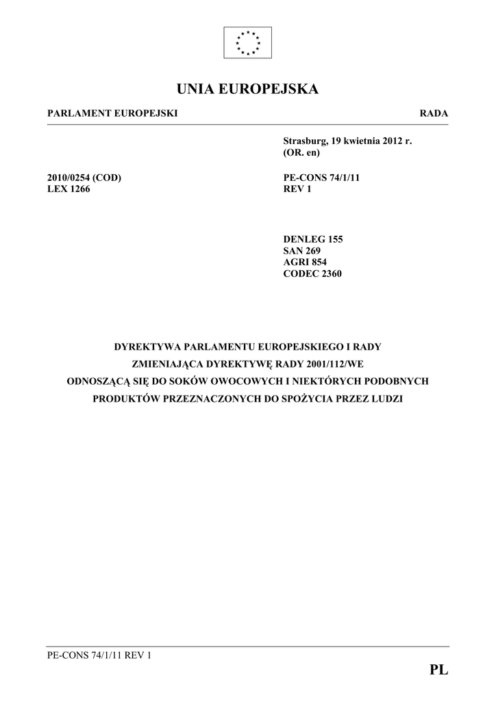 UNIA EUROPEJSKA PARLAMENT EUROPEJSKI RADA Strasburg, 19 kwietnia 2012 r. (OR. en) 2010/0254 (COD) LEX 1266 PE-CONS 74/1/11 REV 1 DENLEG 155 SAN 269 AGRI 854 CODEC 2360 DYREKTYWA PARLAMENTU EUROPEJSKIEGO I RADY ZMIENIAJĄCA DYREKTYWĘ RADY 2001/112/WE ODNOSZĄCĄ SIĘ DO SOKÓW OWOCOWYCH I NIEKTÓRYCH PODOBNYCH PRODUKTÓW PRZEZNACZONYCH DO SPOŻYCIA PRZEZ LUDZI PE-CONS 74/1/11 REV 1 PL Dyrektywa Parlamentu Europejskiego i Rady 2012/12/UE z dnia 19 kwietnia 2012 r. zmieniająca dyrektywę Rady 2001/112/WE odnoszącą się do soków owocowych i niektórych podobnych produktów przeznaczonych do spożycia przez ludzi PARLAMENT EUROPEJSKI I RADA UNII EUROPEJSKIEJ, uwzględniając Traktat o funkcjonowaniu Unii Europejskiej, w szczególności jego art. 43 ust. 2, uwzględniając wniosek Komisji Europejskiej, po przekazaniu projektu aktu ustawodawczego parlamentom narodowym, uwzględniając opinię Europejskiego Komitetu Ekonomiczno-Społecznego 1, stanowiąc zgodnie ze zwykłą procedurą ustawodawczą 2, 1 2 Dz.U. C 84 z 17.3.2011, s. 45. Stanowisko Parlamentu Europejskiego z dnia 14 grudnia 2011 r. (dotychczas nieopublikowane w Dzienniku Urzędowym) oraz decyzja Rady z dnia 8 marca 2012 r. (dotychczas nieopublikowana w Dzienniku Urzędowym). PE-CONS 74/1/11 REV 1 1 PL a także mając na uwadze, co następuje: (1) W celu ochrony interesów konsumentów oraz poprawienia swobodnego przepływu soków owocowych i niektórych podobnych produktów w Unii, w dyrektywie Rady 2001/112/WE 1 ustanawia się szczegółowe przepisy dotyczące produkcji, składu i etykietowania tych produktów. Przepisy te powinny zostać dostosowane w celu uwzględnienia postępu technicznego, a także powinny w najszerszym możliwym zakresie uwzględniać zmiany stosownych norm międzynarodowych, w szczególności normy ogólnej Codex dotyczącej soków owocowych i nektarów (Codex Stan 247-2005), która została przyjęta przez Komisję Codex Alimentarius na 28. posiedzeniu w dniach 4–9 lipca 2005 r. („norma Codex”). Norma Codex określa w szczególności czynniki jakości oraz wymogi dotyczące etykietowania w odniesieniu do soków owocowych i podobnych produktów. (2) Bez uszczerbku dla dyrektywy 2000/13/WE Parlamentu Europejskiego i Rady z dnia 20 marca 2000 r. w sprawie zbliżenia ustawodawstw państw członkowskich odnoszących się do etykietowania, prezentacji i reklamy środków spożywczych 2, konieczna jest zmiana szczegółowych przepisów dyrektywy 2001/112/WE dotyczących etykietowania soków owocowych i podobnych produktów w celu uwzględnienia nowych przepisów dotyczących dopuszczalnych składników, takich jak przepisy dotyczące dodatku cukrów, które nie są już dozwolone w sokach owocowych. W przypadku innych produktów dodatek cukru należy nadal etykietować zgodnie z dyrektywą 2000/13/WE. 1 2 Dz.U. L 10 z 12.1.2002, s. 58. Dz.U. L 109 z 6.5.2000, s. 29. PE-CONS 74/1/11 REV 1 2 PL (3) Oświadczenie żywieniowe „bez dodatku cukrów”, wymienione w załączniku do rozporządzenia (WE) nr 1924/2006 Parlamentu Europejskiego i Rady z dnia 20 grudnia 2006 r. w sprawie oświadczeń żywieniowych i zdrowotnych dotyczących żywności 1, jest stosowane w odniesieniu do soków owocowych od bardzo dawna. W świetle przewidzianych w niniejszej dyrektywie nowych wymogów dotyczących składu zniknięcie tego oświadczenia z dnia na dzień po zakończeniu okresu przejściowego mogłoby uniemożliwiać natychmiastowe jasne odróżnianie soków owocowych od innych napojów pod względem dodatku cukrów w produktach, co odbyłoby się ze szkodą dla sektora soków owocowych. W celu umożliwienia branży odpowiedniego informowania konsumentów powinna istnieć możliwość stosowania, przez ograniczony okres oświadczenia informującego, że żadne soki owocowe nie zawierają dodanych cukrów. (4) W celu dostosowania załączników do dyrektywy 2001/112/WE do zmian stosownych norm międzynarodowych, a także w celu uwzględnienia postępu technicznego, należy przekazać Komisji uprawnienia do przyjęcia aktów zgodnie z art. 290 Traktatu o funkcjonowaniu Unii Europejskiej w odniesieniu do zmiany w tych załącznikach, z wyjątkiem załącznika I część I oraz załącznika II. Szczególnie ważne jest, aby w czasie prac przygotowawczych Komisja prowadziła stosowne konsultacje, w tym na poziomie ekspertów. Przygotowując i opracowując akty delegowane, Komisja powinna zapewnić jednoczesne, terminowe i odpowiednie przekazywanie stosownych dokumentów Parlamentowi Europejskiemu i Radzie. 1 Dz.U. L 404 z 30.12.2006, s. 9. PE-CONS 74/1/11 REV 1 3 PL (5) Aby umożliwić państwom członkowskim przyjęcie krajowych przepisów ustawowych, wykonawczych i administracyjnych niezbędnych do wykonania niniejszej dyrektywy, należy ustanowić okres transpozycji wynoszący 18 miesięcy. W okresie tym nadal powinny mieć zastosowanie wymogi dyrektywy 2001/112/WE, bez zmian wprowadzonych niniejszą dyrektywą. (6) W celu uwzględnienia interesów podmiotów gospodarczych, które wprowadzają do obrotu lub etykietują swoje produkty zgodnie z wymogami mającymi zastosowanie przed rozpoczęciem stosowania krajowych przepisów transponujących niniejszą dyrektywę, konieczne jest ustanowienie odpowiednich środków przejściowych. Dlatego też niniejsza dyrektywa powinna przewidywać, że produkty te mogą być nadal wprowadzane do obrotu przez ograniczony czas po upływie okresu transpozycji. (7) Ponieważ cel niniejszej dyrektywy, a mianowicie dostosowanie dyrektywy 2001/112/WE w celu uwzględnienia postępu technicznego przy jednoczesnym uwzględnieniu normy Codex, nie może być osiągnięty w sposób wystarczający przez państwa członkowskie, natomiast możliwe jest lepsze jego osiągnięcie na poziomie Unii, Unia może przyjąć środki zgodnie z zasadą pomocniczości określoną w art. 5 Traktatu o Unii Europejskiej. Zgodnie z zasadą proporcjonalności określoną w tym samym artykule niniejsza dyrektywa ni