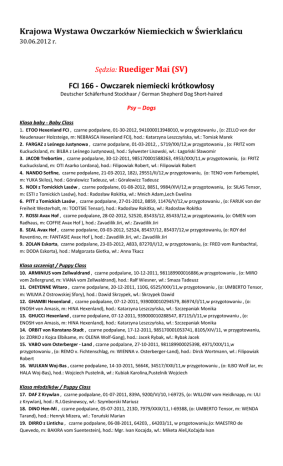 Krajowa Wystawa Owczarków Niemieckich w Świerklańcu 30.06.2012 r. Sędzia: Ruediger Mai (SV) FCI 166 - Owczarek niemiecki krótkowłosy Deutscher Schäferhund Stockhaar / German Shepherd Dog Short-haired Psy – Dogs Klasa baby - Baby Class 1. ETOO Hexenland FCI , czarne podpalane, 01-30-2012, 941000013948010, w przygotowaniu , (o: ZELLO von der Neudenauer Holzsteige, m: NEBRASCA Hexenland FCI), hod.: Katarzyna Leszczyńska, wł.: Tomiak Marek 2. FARGAZ z Leśnego Justynowa , czarne podpalane, 01-03-2012, , 5719/XXI/12,w przygotowaniu , (o: FRITZ vom Kuckucksland, m: BILBA z Leśnego Justynowa), hod.: Sylwester Lisowski, wł.: Łagoński Sławomir 3. JACOB Trebortim , czarne podpalane, 30-12-2011, 985170001588263, 4953/XXX/11,w przygotowaniu, (o: FRITZ Kuckucksland, m: OTI Asarko Lordana), hod.: Filipowiak Robert, wł.: Filipowiak Robert 4. NANDO Sotfine, czarne podpalane, 21-03-2012, 182J, 29551/II/12,w przygotowaniu, (o: TENO vom Farbenspiel, m: YUKA Skilos), hod.: Góralewicz Tadeusz, wł.: Góralewicz Tadeusz 5. NODI z Tomickich Lasów , czarne podpalane, 01-08-2012, B851, 9984/XVI/12,w przygotowaniu, (o: SILAS Tensor, m: ESTI z Tomickich Lasów), hod.: Radosław Rokitka, wł.: Mnich Adam,Lech Ewelina 6. PITT z Tomickich Lasów , czarne podpalane, 27-01-2012, B859, 11476/V/12,w przygotowaniu , (o: FARUK von der Freiheit Westerholt, m: TOOTSIE Tensor), hod.: Radosław Rokitka, wł.: Radosław Rokitka 7. ROSSI Avax Hof , czarne podpalane, 28-02-2012, 52520, 85433/12, 85433/12,w przygotowaniu, (o: OMEN vom Radhaus, m: COFFIE Avax Hof ), hod.: Zavadilik Jiri, wł.: Zavadilik Jiri 8. SEAL Avax Hof , czarne podpalane, 03-03-2012, 52524, 85437/12, 85437/12,w przygotowaniu, (o: ROY del Reventino, m: FANTASIE Avax Hof ), hod.: Zavadilik Jiri, wł.: Zavadilik Jiri 9. ZOLAN Eskorta, czarne podpalane, 23-03-2012, A833, 87270/I/12, w przygotowaniu, (o: FRED vom Rumbachtal, m: DODA Eskorta), hod.: Małgorzata Gietka, wł.: Anna Tkacz Klasa szczeniąt / Puppy Class 10. ARMINIUS vom Zellwaldrand , czarne podpalane, 10-12-2011, 981189900016886,w przygotowaniu , (o: MIRO vom Zellergrund, m: VIANA vom Zellwaldrand), hod.: Ralf Wiesner, wł.: Smaza Tadeusz 11. CHEYENNE Witaro , czarne podpalane, 20-12-2011, 110G, 6525/XXX/11,w przygotowaniu , (o: UMBERTO Tensor, m: WILMA Z Ostrowskiej Sfory), hod.: Dawid Skrzypek, wł.: Skrzypek Dawid 12. GHAMBI Hexenland , czarne podpalane, 07-12-2011, 939000010294579, 86974/I/11,w przygotowaniu , (o: ENOSH von Amasis, m: HINA Hexenland), hod.: Katarzyna Leszczyńska, wł.: Szczepaniak Monika 13. GHUCCI Hexenland , czarne podpalane, 07-12-2011, 939000010288547, 87115/I/11,w przygotowaniu , (o: ENOSH von Amasis, m: HINA Hexenland), hod.: Katarzyna Leszczyńska, wł.: Szczepaniak Monika 14. ORBIT von Konstanz-Stadt , czarne podpalane, 17-12-2011, 985170001053741, 8105/XIV/11, w przygotowaniu, (o: ZORKO z Kojca Elbikame, m: OLENA Wolf-Gang), hod.: Jacek Rybak, wł.: Rybak Jacek 15. VABO vom Osterberger - Land , czarne podpalane, 27-10-2011, 981189900025398, 4971/XXX/11,w przygotowaniu , (o: REMO v. Fichtenschlag, m: WIENNA v. Osterberger-Land), hod.: Dirck Wortmann, wł.: Filipowiak Robert 16. WULKAN Woj-Bas , czarne podpalane, 14-10-2011, 5664K, 34517/XXII/11,w przygotowaniu , (o: ILBO Wolf Jar, m: HALA Woj-Bas), hod.: Wojciech Pustelnik, wł.: Kubiak Karolina,Pustelnik Wojciech Klasa młodzików / Puppy Class 17. DAF Z Krywlan , czarne podpalane, 01-07-2011, 839A, 9200/VI/10, I-69725, (o: WILLOW vom Heidknapp, m: ULI z Krywlan), hod.: R.J.Gesinowscy, wł.: Szymborski Mariusz 18. DINO Hen-Mi , czarne podpalane, 05-07-2011, 213D, 7979/XXIX/11, I-69388, (o: UMBERTO Tensor, m: WENDA Tarand), hod.: Henryk Mizera, wł.: Toruński Marian 19. DIRRO z Lintichu , czarne podpalane, 06-08-2011, 64203, , 64203/11, w przgotowaniu,(o: MAESTRO de Quevedo, m: BAKIRA vom Suentestein), hod.: Mgr. Ivan Kocajda, wł.: Miketa Aleš,Kočajda Ivan 20. HIRO Śmiłowickie Wilki , czarne podpalane, 25-08-2011, 967000009364758, 13397/IV/11, w przygotowaniu, (o: HOMAR dei Colli di Uzzano, m: ANUSHKA Śmiłowickie Wilki), hod.: Renata Horzela, wł.: Horzela Renata 21. KASO z Domu Żyrków , czarne podpalane, 17-08-2011, B760, 11330/V/11, I-68947, (o: TROJ vom Hutberg, m: ETNA z Jurajskiego Źródła), hod.: Józef Żyrek, wł.: Żyrek Józef 22. LUMPI RODIAZ , czarne podpalane, 16-08-2011, 5635K, 46764/VIII/11, I-69462, (o: GIO vom Muhlenteich, m: VISA Rodiaz), hod.: Piotr Szkalski, wł.: Rogal Ignacy 23. USHER zur Worringer Rheinaue, czarne podpalane, 04-09-2011, 98118900006440, , 22758622275862, (o: NINO von Tronje, m: FIGKIA zur Worringer Rheinaue), hod.: Ittel Bruno, wł.: Itter Bruno,Dariusz Więckowski Klasa młodzieży / Youth Class 24. ALF von der Wannsee , czarne podpalane, 24-06-2011, 981189900010180, , 2268999, (o: LENNOX vom Regina Pacis , m: DALIDA vom Finkenschlag ), hod.: Gunter Korschek, wł.: Korschek Gunter 25. BOJAN z Sosnowego Zakątka , czarne podpalane, 03-03-2011, D681, 12327/IV/11, I-68790, (o: WALLACE aus Wattenscheid, m: XOXI vom Frankengold), hod.: Grzegorz Zubek, wł.: Zubek Grzegorz 26. DEVIL von Haus Eve , czarne podpalane, 22-01-2011, 5547K, 34386/XXII/11,w przygotowaniu , (o: VAX Artrox, m: ORA V-Max), hod.: Piotr Sawicki, wł.: Sawicki Piotr 27. KEN z Tomickich Lasów , czarne podpalane, 01-03-2011, B675, 13253/IV/11, I-67958, (o: FURBO von der kleinen Ranch , m: TOOTSIE Tensor), hod.: Radosław Rokitka, wł.: Masłoń Magdalena 28. LEGRA Eskorta , czarne podpalane, 27-02-2011, A515, 85345/I/11, I-68162 , (o: ZELLO von der Neudenauer Holzsteige, m: DODA Eskorta), hod.: Małgorzata Gietka, wł.: Gietka Małgorzata 29. LEX Marko Carras , czarne podpalane, 30-04-2011, 026G, 6419/XXX/11, I-69212, (o: NELSON vom Frankengold, m: FANTA Redstar), hod.: Marek Wencel, wł.: Wencel Marek 31. OMAR Dzako, czarne podpalane, 04-05-2011, 63583, , 63583, (o: ZORAN von der Zenteiche, m: HASEL Dzako), hod.: Marian Zazony, wł.: Slota Juraj 32. QUENN Wolf Jar , czarne podpalane, 21-0