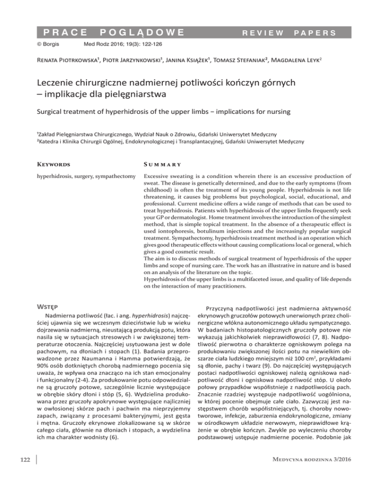 PRACE © Borgis POGLĄDOWE REVIEW PA P E R S Med Rodz 2016; 19(3): 122-126 Renata Piotrkowska¹, Piotr Jarzynkowski¹, Janina Książek¹, Tomasz Stefaniak², Magdalena Leyk2 Leczenie chirurgiczne nadmiernej potliwości kończyn górnych – implikacje dla pielęgniarstwa Surgical treatment of hyperhidrosis of the upper limbs − implications for nursing ¹Zakład Pielęgniarstwa Chirurgicznego, Wydział Nauk o Zdrowiu, Gdański Uniwersytet Medyczny ²Katedra i Klinika Chirurgii Ogólnej, Endokrynologicznej i Transplantacyjnej, Gdański Uniwersytet Medyczny Keywords Summary hyperhidrosis, surgery, sympathectomy Excessive sweating is a condition wherein there is an excessive production of sweat. The disease is genetically determined, and due to the early symptoms (from childhood) is often the treatment of its young people. Hyperhidrosis is not life threatening, it causes big problems but psychological, social, educational, and professional. Current medicine offers a wide range of methods that can be used to treat hyperhidrosis. Patients with hyperhidrosis of the upper limbs frequently seek your GP or dermatologist. Home treatment involves the introduction of the simplest method, that is simple topical treatment. In the absence of a therapeutic effect is used iontophoresis, botulinum injections and the increasingly popular surgical treatment. Sympathectomy, hyperhidrosis treatment method is an operation which gives good therapeutic effects without causing complications local or general, which gives a good cosmetic result. The aim is to discuss methods of surgical treatment of hyperhidrosis of the upper limbs and scope of nursing care. The work has an illustrative in nature and is based on an analysis of the literature on the topic. Hyperhidrosis of the upper limbs is a multifaceted issue, and quality of life depends on the interaction of many practitioners. Wstęp Nadmierna potliwość (łac. i ang. hyperhidrosis) najczęściej ujawnia się we wczesnym dzieciństwie lub w wieku dojrzewania nadmierną, nieustającą produkcją potu, która nasila się w sytuacjach stresowych i w zwiększonej temperaturze otoczenia. Najczęściej usytuowana jest w dole pachowym, na dłoniach i stopach (1). Badania przeprowadzone przez Naumanna i Hamma potwierdzają, że 90% osób dotkniętych chorobą nadmiernego pocenia się uważa, że wpływa ona znacząco na ich stan emocjonalny i funkcjonalny (2-4). Za produkowanie potu odpowiedzialne są gruczoły potowe, szczególnie licznie występujące w obrębie skóry dłoni i stóp (5, 6). Wydzielina produkowana przez gruczoły apokrynowe występujące najliczniej w owłosionej skórze pach i pachwin ma nieprzyjemny zapach, związany z procesami bakteryjnymi, jest gęsta i mętna. Gruczoły ekrynowe zlokalizowane są w skórze całego ciała, głównie na dłoniach i stopach, a wydzielina ich ma charakter wodnisty (6). 122 Przyczyną nadpotliwości jest nadmierna aktywność ekrynowych gruczołów potowych unerwionych przez cholinergiczne włókna autonomicznego układu sympatycznego. W badaniach histopatologicznych gruczoły potowe nie wykazują jakichkolwiek nieprawidłowości (7, 8). Nadpotliwość pierwotna o charakterze ogniskowym polega na produkowaniu zwiększonej ilości potu na niewielkim obszarze ciała ludzkiego mniejszym niż 100 cm2, przykładami są dłonie, pachy i twarz (9). Do najczęściej występujących postaci nadpotliwości ogniskowej należą ogniskowa nadpotliwość dłoni i ogniskowa nadpotliwość stóp. U około połowy przypadków współistnieje z nadpotliwością pach. Znacznie rzadziej występuje nadpotliwość uogólniona, w której pocenie obejmuje całe ciało. Zazwyczaj jest następstwem chorób współistniejących, tj. choroby nowotworowe, infekcje, zaburzenia endokrynologiczne, zmiany w ośrodkowym układzie nerwowym, nieprawidłowe krążenie w obrębie kończyn. Zwykle po wyleczeniu choroby podstawowej ustępuje nadmierne pocenie. Podobnie jak Medycyna rodzinna 3/2016 Leczenie chirurgiczne nadmiernej potliwości kończyn górnych – implikacje dla pielęgniarstwa w nadpotliwości uogólnionej, nadpotliwość wtórna towarzyszy innym schorzeniom, takim jak: choroba Parkinsona, choroby endokrynologiczne, nowotwory czy gruźlica. Może występować również w trakcie przyjmowania niektórych leków, np. przeciwdepresyjnych (9). Badania naukowe wykazują, że nadpotliwość pierwotna dotyka od 1-4% populacji. Istotną rolę w patogenezie choroby odgrywają czynniki genetyczne. U około 30-62% badanych stwierdzono występowanie danego schorzenia w rodzinie, co dowodzi dziedziczności (8, 9). Nadpotliwość pierwotna jest schorzeniem genetycznie uwarunkowanym o autosomalnym dominującym typie dziedziczenia. Zachorowalność na nadpotliwość pierwotną jest większa niż na wtórną postać choroby (10, 11). Fizjologiczna postać nadpotliwości warunkowana jest klimatem, ćwiczeniami fizycznymi oraz dotyczy kobiet w czasie menopauzalnym. Nadpotliwość objawowa (wtórna) najczęściej towarzyszy zaburzeniom endokrynologicznym, chorobom neurologicznym, stanom przebiegającym z podwyższeniem katecholamin. Do zaburzeń endokrynologicznych zaliczamy nadczynność tarczycy i przysadki oraz pheochromocytomę. Choroby neurologiczne powodujące nadpotliwość objawową to: zespół Freya, neuropatia cukrzycowa i choroba Parkinsona. Nadpotliwość idiopatyczna (pierwotna) jest uwarunkowana przez stymulację bodźcami emocjonalnymi bez współtowarzyszących zaburzeń neurologicznych (12). Chirurgiczne metody leczenia Pacjenci z nadmierną potliwością kończyn górnych zwracają się najczęściej o pomoc do lekarza pierwszego kontaktu lub dermatologa. Na początku leczenia wdraża się środki o działaniu miejscowym. W przypadku braku efektu terapeutycznego stosuje się jonoforezę, iniekcje botulinowe, następnie leczenie operacyjne (13). W drugiej połowie XX wieku wprowadzenie toru wizyjnego do praktyki klinicznej zapoczątkowa