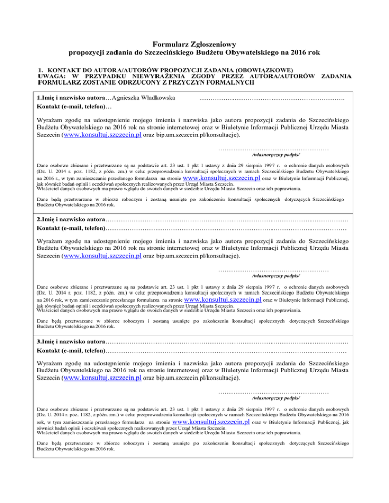 Formularz Zgłoszeniowy propozycji zadania do Szczecińskiego Budżetu Obywatelskiego na 2016 rok 1. KONTAKT DO AUTORA/AUTORÓW PROPOZYCJI ZADANIA (OBOWIĄZKOWE) UWAGA: W PRZYPADKU NIEWYRAŻENIA ZGODY PRZEZ AUTORA/AUTORÓW ZADANIA FORMULARZ ZOSTANIE ODRZUCONY Z PRZYCZYN FORMALNYCH 1.Imię i nazwisko autora…Agnieszka Władkowska …………………………………………………………. Kontakt (e-mail, telefon)… Wyrażam zgodę na udostępnienie mojego imienia i nazwiska jako autora propozycji zadania do Szczecińskiego Budżetu Obywatelskiego na 2016 rok na stronie internetowej oraz w Biuletynie Informacji Publicznej Urzędu Miasta Szczecin (www.konsultuj.szczecin.pl oraz bip.um.szczecin.pl/konsultacje). …………………………………………… /własnoręczny podpis/ Dane osobowe zbierane i przetwarzane są na podstawie art. 23 ust. 1 pkt 1 ustawy z dnia 29 sierpnia 1997 r. o ochronie danych osobowych (Dz. U. 2014 r. poz. 1182, z późn. zm.) w celu: przeprowadzenia konsultacji społecznych w ramach Szczecińskiego Budżetu Obywatelskiego na 2016 r., w tym zamieszczanie przesłanego formularza na stronie www.konsultuj.szczecin.pl oraz w Biuletynie Informacji Publicznej, jak również badań opinii i oczekiwań społecznych realizowanych przez Urząd Miasta Szczecin. Właściciel danych osobowych ma prawo wglądu do swoich danych w siedzibie Urzędu Miasta Szczecin oraz ich poprawiania. Dane będą przetwarzane w zbiorze roboczym i zostaną usunięte po zakończeniu konsultacji społecznych dotyczących Szczecińskiego Budżetu Obywatelskiego na 2016 rok. 2.Imię i nazwisko autora…………………………………………………………………………………………………. Kontakt (e-mail, telefon)………………………………………………………………………………………………… Wyrażam zgodę na udostępnienie mojego imienia i nazwiska jako autora propozycji zadania do Szczecińskiego Budżetu Obywatelskiego na 2016 rok na stronie internetowej oraz w Biuletynie Informacji Publicznej Urzędu Miasta Szczecin (www.konsultuj.szczecin.pl oraz bip.um.szczecin.pl/konsultacje). …………………………………………… /własnoręczny podpis/ Dane osobowe zbierane i przetwarzane są na podstawie art. 23 ust. 1 pkt 1 ustawy z dnia 29 sierpnia 1997 r. o ochronie danych osobowych (Dz. U. 2014 r. poz. 1182, z późn. zm.) w celu: przeprowadzenia konsultacji społecznych w ramach Szczecińskiego Budżetu Obywatelskiego na 2016 rok, w tym zamieszczanie przesłanego formularza na stronie www.konsultuj.szczecin.pl oraz w Biuletynie Informacji Publicznej, jak również badań opinii i oczekiwań społecznych realizowanych przez Urząd Miasta Szczecin. Właściciel danych osobowych ma prawo wglądu do swoich danych w siedzibie Urzędu Miasta Szczecin oraz ich poprawiania. Dane będą przetwarzane w zbiorze roboczym i zostaną usunięte po zakończeniu konsultacji społecznych dotyczących Szczecińskiego Budżetu Obywatelskiego na 2016 rok. 3.Imię i nazwisko autora…………………………………………………………………………………………………. Kontakt (e-mail, telefon)………………………………………………………………………………………………… Wyrażam zgodę na udostępnienie mojego imienia i nazwiska jako autora propozycji zadania do Szczecińskiego Budżetu Obywatelskiego na 2016 rok na stronie internetowej oraz w Biuletynie Informacji Publicznej Urzędu Miasta Szczecin (www.konsultuj.szczecin.pl oraz bip.um.szczecin.pl/konsultacje). …………………………………………… /własnoręczny podpis/ Dane osobowe zbierane i przetwarzane są na podstawie art. 23 ust. 1 pkt 1 ustawy z dnia 29 sierpnia 1997 r. o ochronie danych osobowych (Dz. U. 2014 r. poz. 1182, z późn. zm.) w celu: przeprowadzenia konsultacji społecznych w ramach Szczecińskiego Budżetu Obywatelskiego na 2016 rok, w tym zamieszczanie przesłanego formularza na stronie www.konsultuj.szczecin.pl oraz w Biuletynie Informacji Publicznej, jak również badań opinii i oczekiwań społecznych realizowanych przez Urząd Miasta Szczecin. Właściciel danych osobowych ma prawo wglądu do swoich danych w siedzibie Urzędu Miasta Szczecin oraz ich poprawiania. Dane będą przetwarzane w zbiorze roboczym i zostaną usunięte po zakończeniu konsultacji społecznych dotyczących Szczecińskiego Budżetu Obywatelskiego na 2016 rok. 2. TYTUŁ ZADANIA (OBOWIĄZKOWE) (Należy wpisać pełny tytuł zadania. Tytuł zadania powinien być sformułowany tak, aby jednoznacznie obrazował faktyczne zadanie, które ma być realizowane w ramach Szczecińskiego Budżetu Obywatelskiego na 2016 rok) UWAGA: RUBRYKĘ NALEŻY WYPEŁNIĆ CZYTELNIE WIELKIMI LITERAMI PODANY TYTUŁ ZADANIA BĘDZIE OBOWIĄZYWAŁ NA LIŚCIE DO GŁOSOWANIA B O I S K S Z K Ó Ł P R Z Y S Z W 3. C O P R Z Y N R 2 U L . P O R Z E C I N Z E S P T O W E J D Ą B I U O L E 2 1 CHARAKTER ZADANIA (OBOWIĄZKOWE) (Do Szczecińskiego Budżetu Obywatelskiego można składać propozycje zadań do zrealizowania o charakterze inwestycyjnym, zgodne z kompetencjami Gminy Miasto Szczecin. Zadania mają również charakter dzielnicowy, przez co rozumie się realizację zadania dotyczącego głównie potrzeb mieszkańców jednej dzielnicy Szczecina. W sytuacji jeśli zadanie swoim zasięgiem obejmuje więcej niż obszar jednej dzielnicy o wyborze dzielnicy decyduje autor propozycji zadania) Proszę wybrać wyłącznie jedną z podanych poniżej propozycji Dzielnica Północ Dzielnica Prawobrzeże Dzielnica Śródmieście Dzielnica Zachód 4. Proszę dokonać wyboru stawiając znak „X” w wybranej rubryce X LOKALIZACJA, MIEJSCE REALIZACJI ZADANIA (OBOWIĄZKOWE) (W ramach Szczecińskiego Budżetu Obywatelskiego można składać propozycje zadań zlokalizowane na majątku i w przestrzeni Gminy Miasto Szczecin. Należy określić obszar, na którym 
